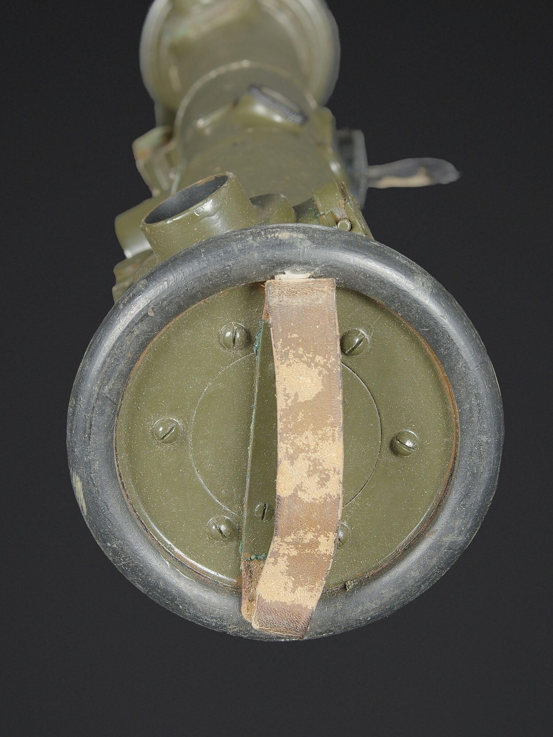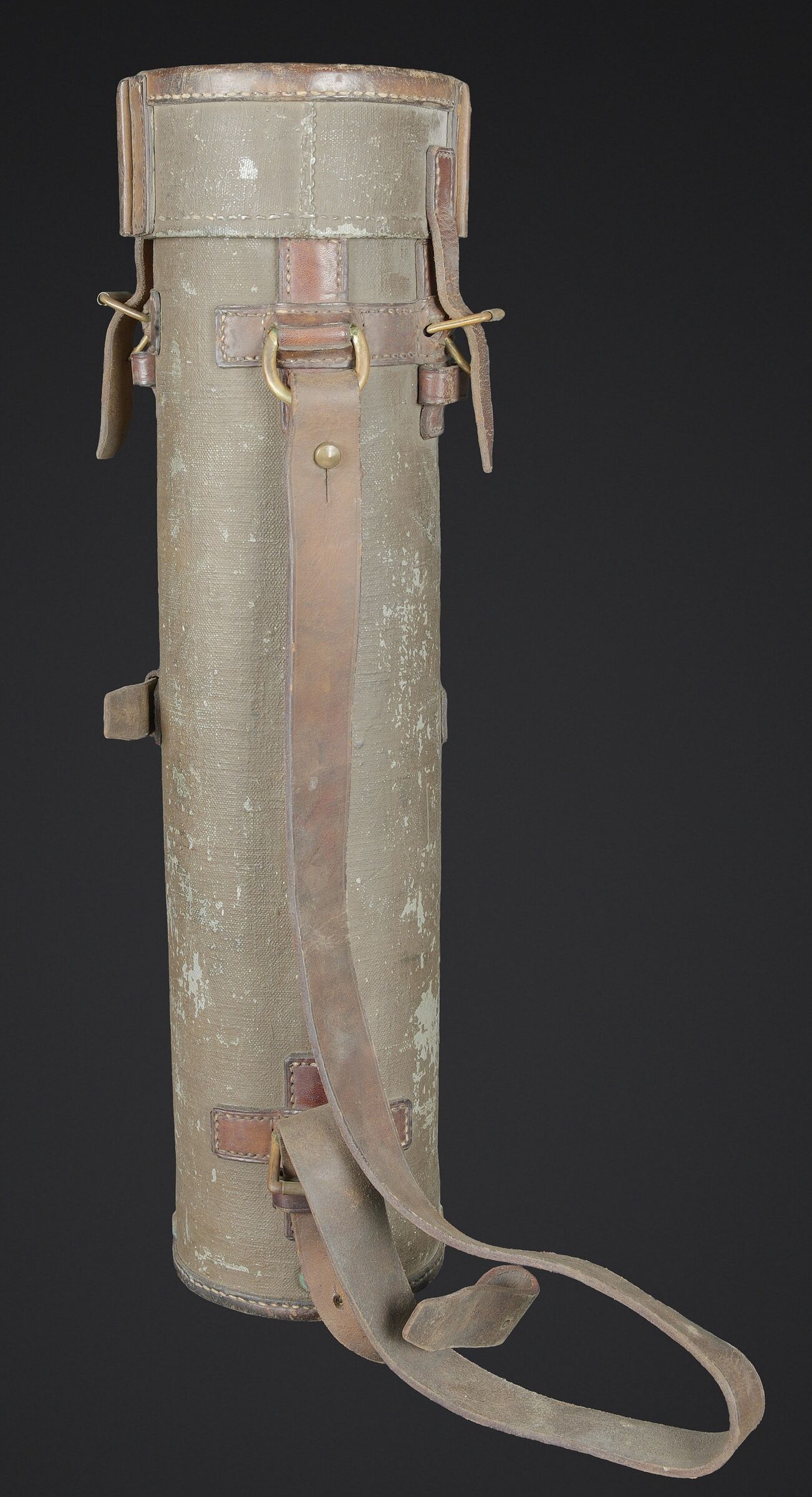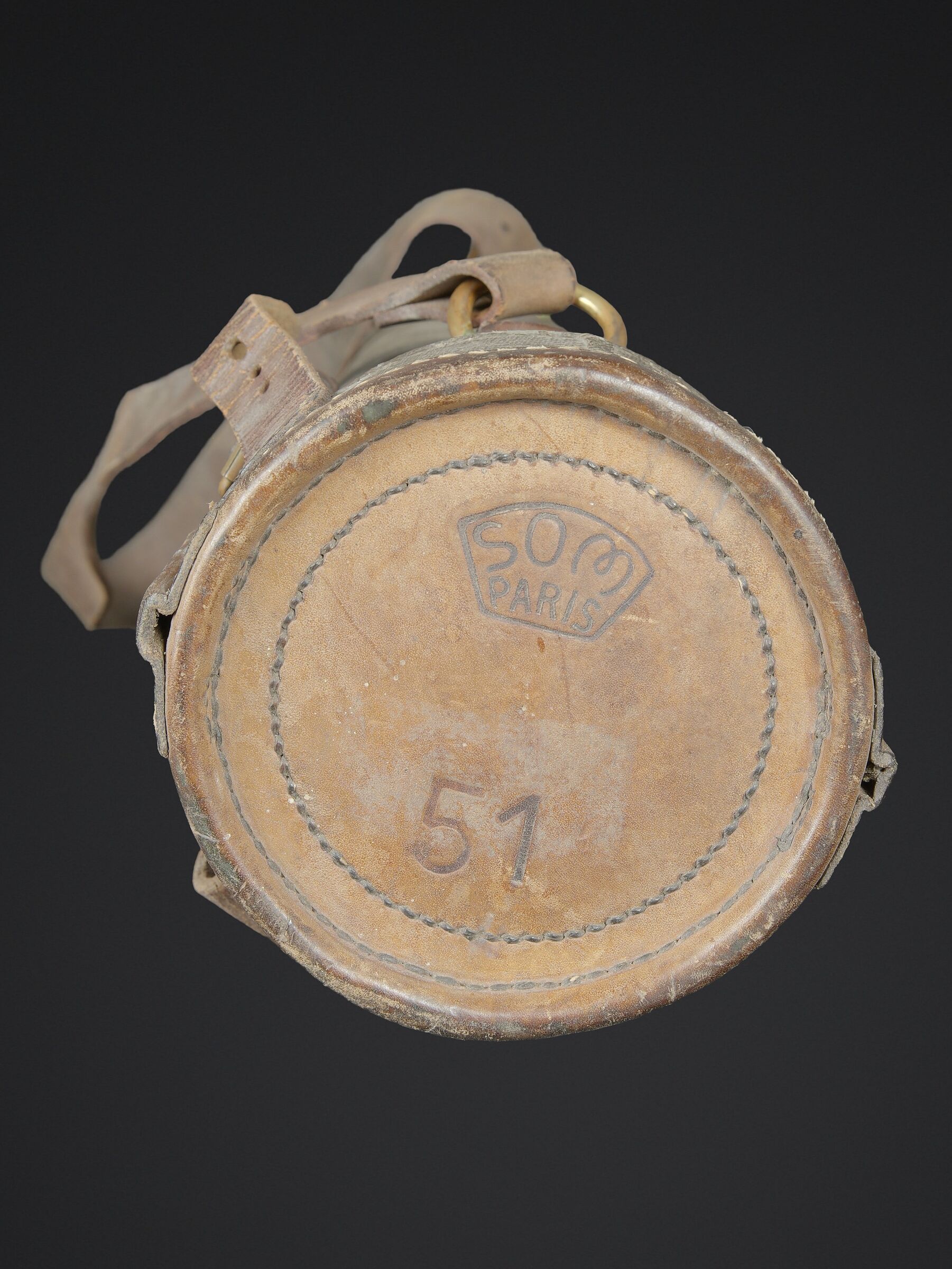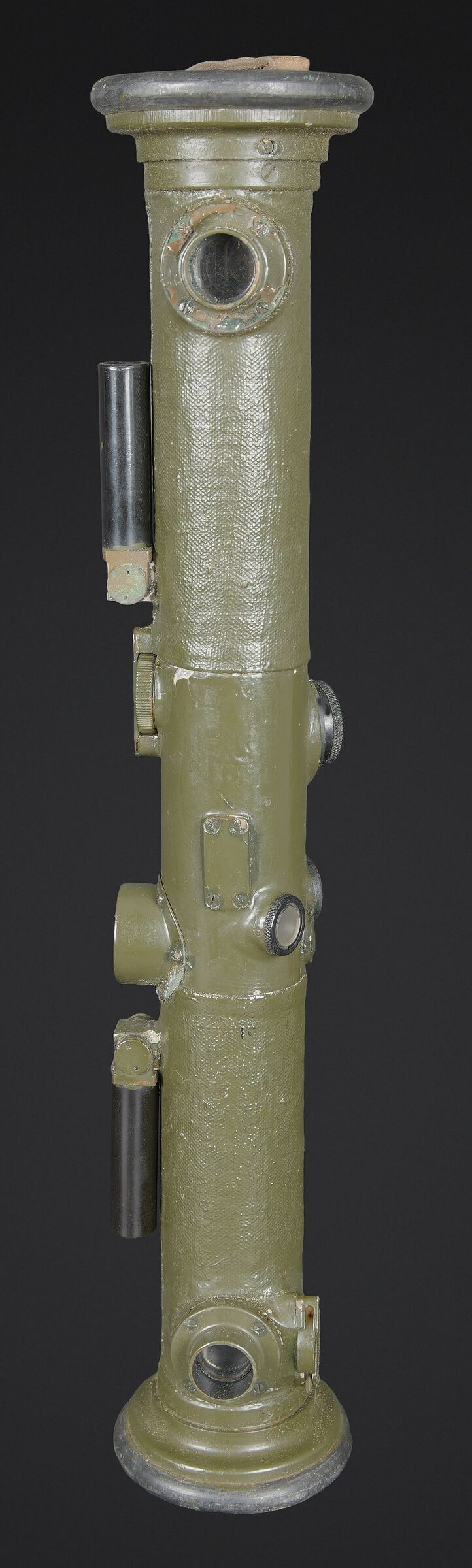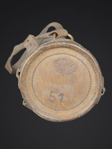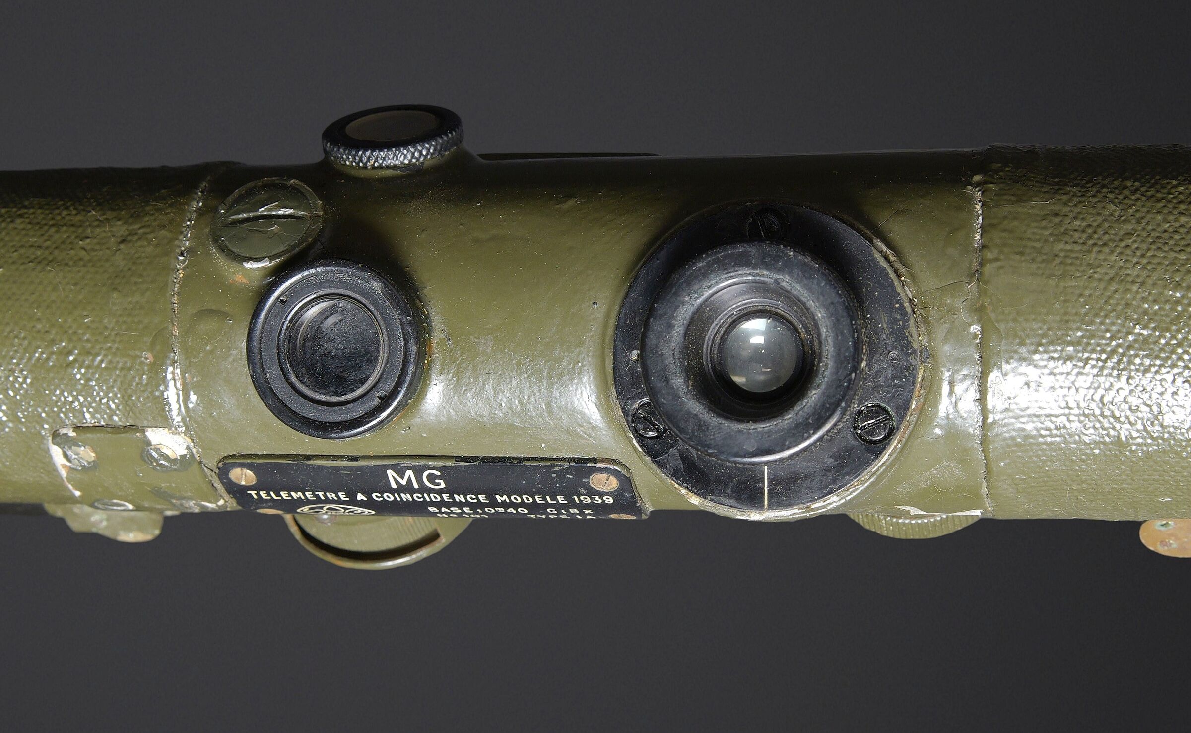 Télémètre français SOM. Belle housse en forme de tube, toutes les sangles sont présentes. Quelques manques au niveau de la couleur. Couverture marquée SOM PARIS 51. Petit télémètre en métal, peinture kaki à 70%. Les deux poignées en bakélite sont rabattables. Optique claire avec quelques tâches. Plaque marquée MG Télémètre a coïncidence MD 1939 N 101 Type IA. A noter une certaine usure et patine de la pièce. Etat II+. La SOM (Société d’Optique et de Mécanique de haute précision), située à Paris, est un fabricant historique français renommé, souvent associé à SOM Berthiot. Dans le domaine des télémètres, cette entreprise a produit du matériel optique de précision, notamment des télémètres stéréoscopiques ou à coïncidence, utilisés principalement par l’armée ou la marine avant l’ère laser. French SOM rangefinder. Fine tubular cover with all straps present and minor losses to the colour. Cover marked SOM Paris 51. Small metal rangefinder retaining approximately 70% of its khaki paint, with both folding bakelite handles. Clear optics with a few spots. Plate marked MG Télémètre à coïncidence Mle 1939 No. 101 Type IA. Noteworthy overall wear and an attractive period patina. Condition II+. The SOM (Société d’Optique et de Mécanique de haute précision) of Paris was a renowned historic manufacturer of precision optical equipment, particularly coincidence and stereoscopic rangefinders used by the armed forces and navy before the laser era.