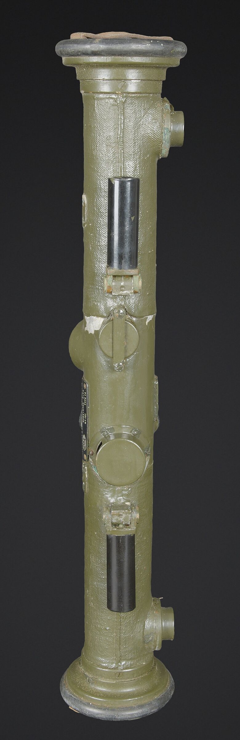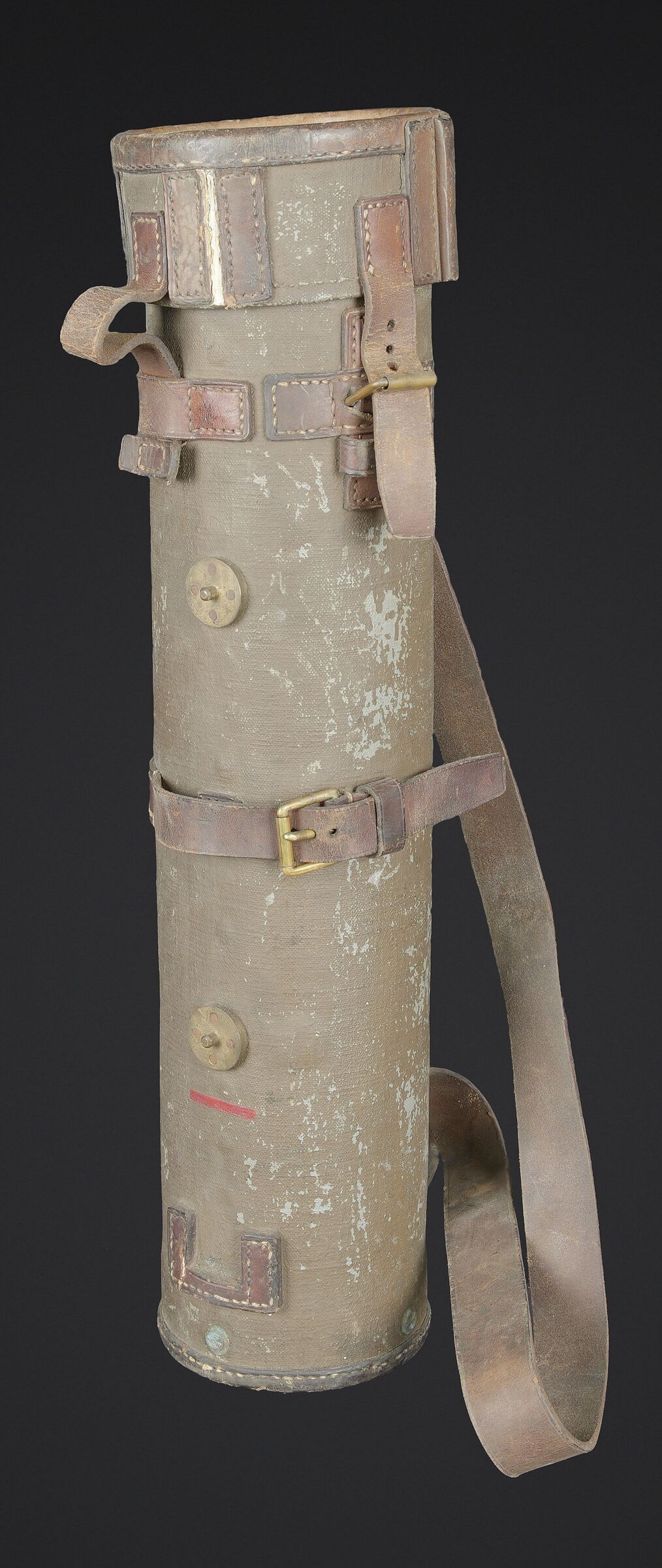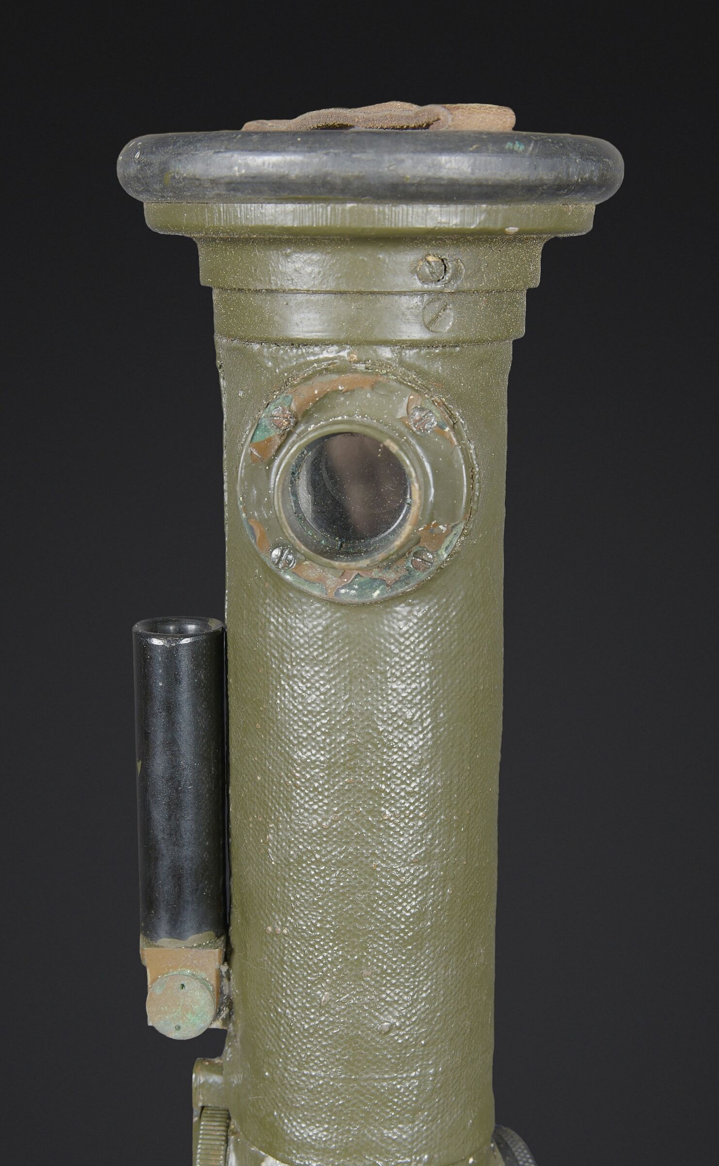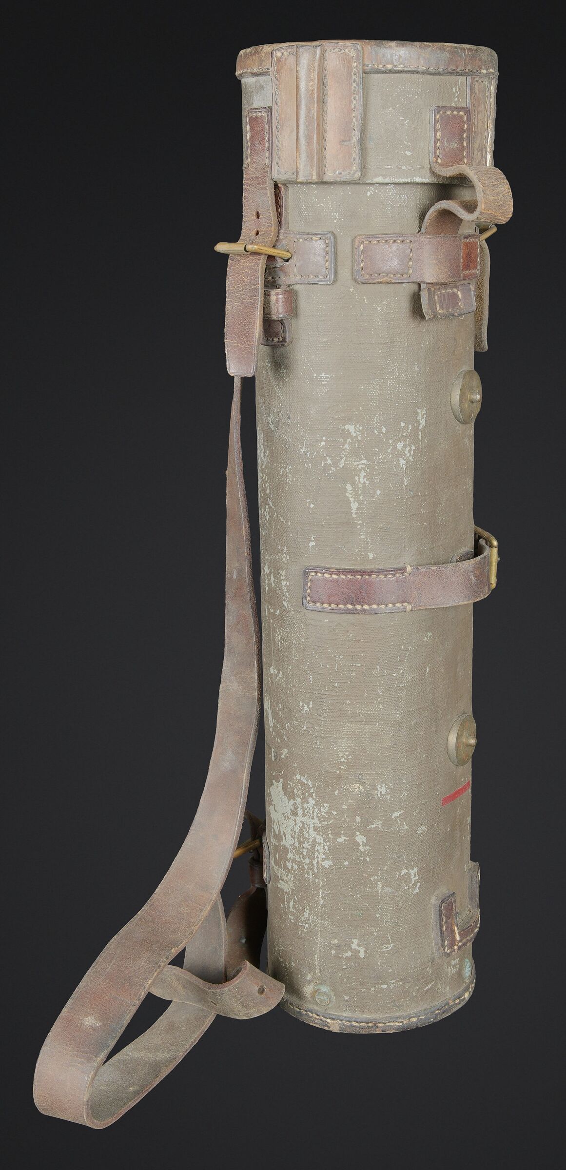 Télémètre français SOM. Belle housse en forme de tube, toutes les sangles sont présentes. Quelques manques au niveau de la couleur. Couverture marquée SOM PARIS 51. Petit télémètre en métal, peinture kaki à 70%. Les deux poignées en bakélite sont rabattables. Optique claire avec quelques tâches. Plaque marquée MG Télémètre a coïncidence MD 1939 N 101 Type IA. A noter une certaine usure et patine de la pièce. Etat II+. La SOM (Société d’Optique et de Mécanique de haute précision), située à Paris, est un fabricant historique français renommé, souvent associé à SOM Berthiot. Dans le domaine des télémètres, cette entreprise a produit du matériel optique de précision, notamment des télémètres stéréoscopiques ou à coïncidence, utilisés principalement par l’armée ou la marine avant l’ère laser. French SOM rangefinder. Fine tubular cover with all straps present and minor losses to the colour. Cover marked SOM Paris 51. Small metal rangefinder retaining approximately 70% of its khaki paint, with both folding bakelite handles. Clear optics with a few spots. Plate marked MG Télémètre à coïncidence Mle 1939 No. 101 Type IA. Noteworthy overall wear and an attractive period patina. Condition II+. The SOM (Société d’Optique et de Mécanique de haute précision) of Paris was a renowned historic manufacturer of precision optical equipment, particularly coincidence and stereoscopic rangefinders used by the armed forces and navy before the laser era.