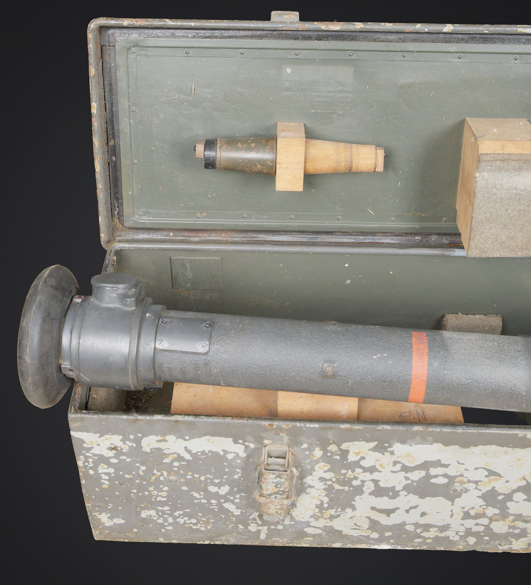 Télémètre de la marine de guerre des forces de l’axe. Modèle en caisse. Belle caisse en métal, les poignées de transport sont présentes, les crochets de fixation du couvercle sont... en savoir plus
