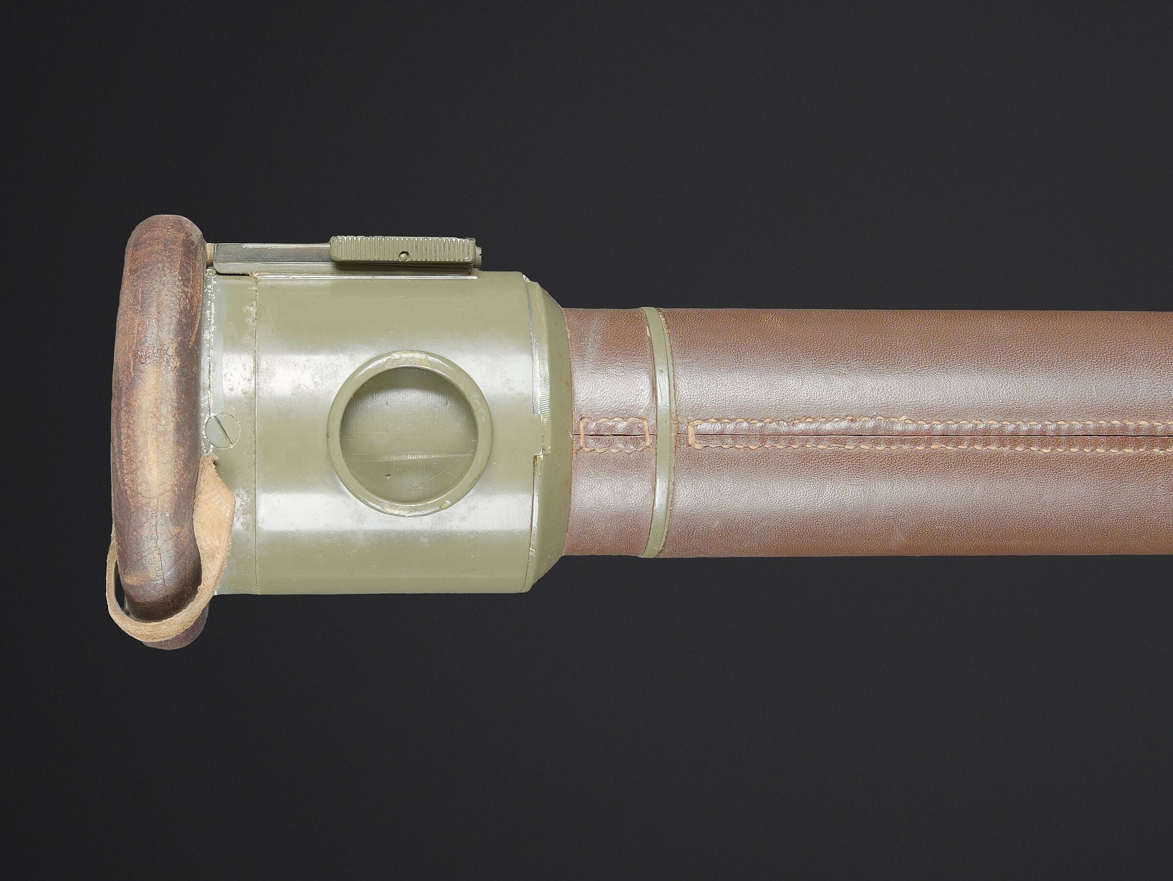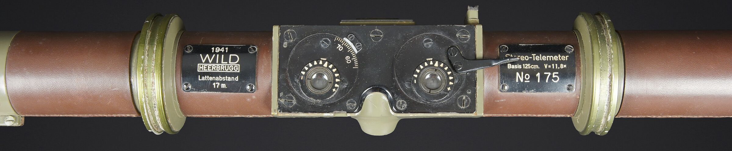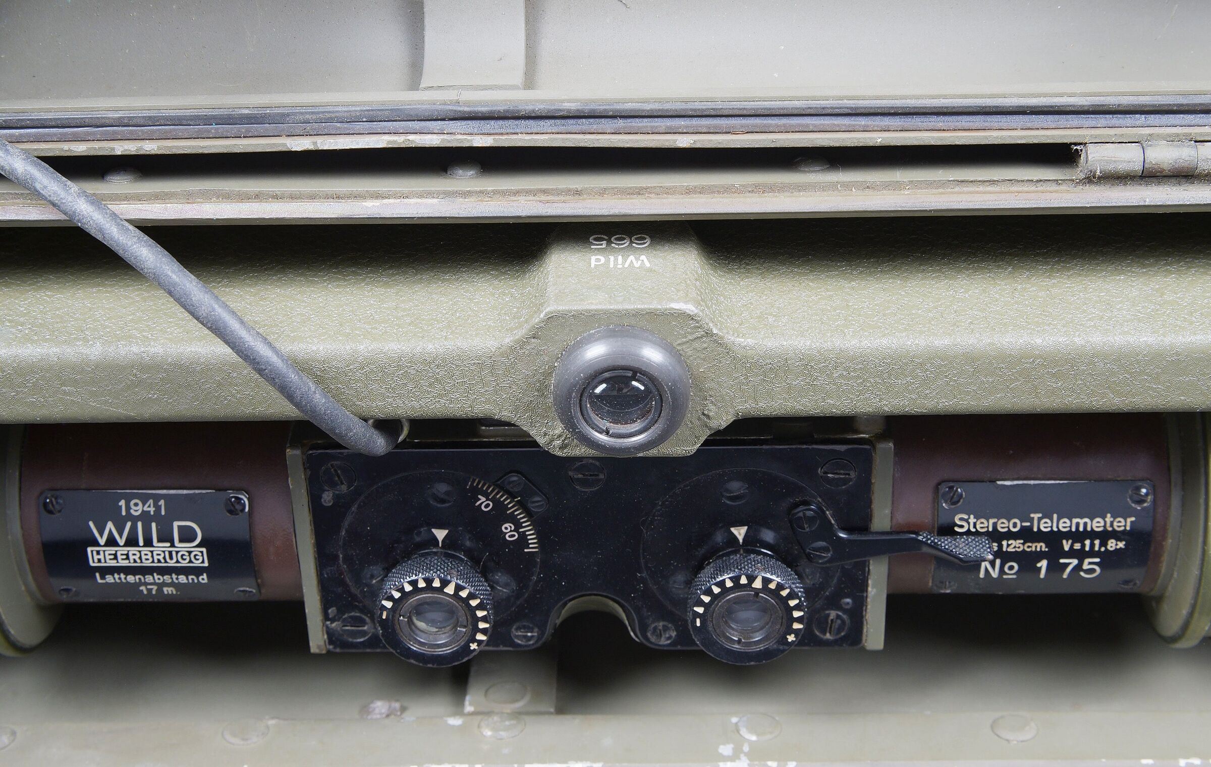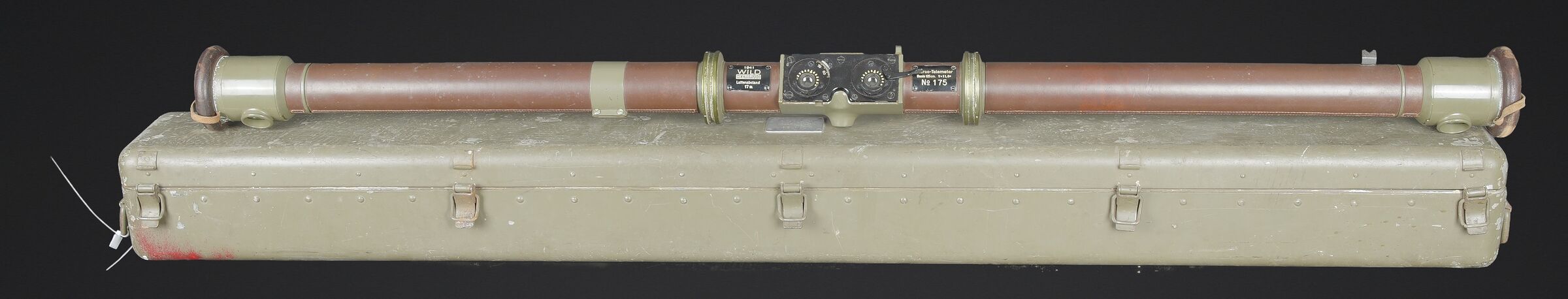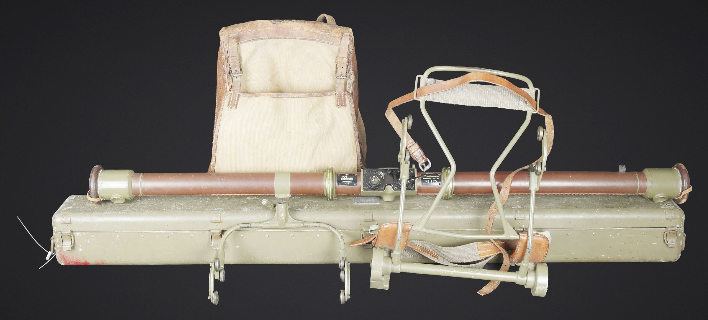Télémètre suisse Wild. Belle caisse en métal. Peinture kaki à 70%. Les poignées de transport sont présentes. Les crochets de fermeture sont fonctionnels. Plaquette marquée Wild Heerbrugg N175. Télémètre en métal, couleur marron à 790%. Optique claire et graduée. Bonnettes en métal. Appui front présent ainsi que le système d’éclairage avec son câble. Plaquette marquée Stereo Telemeter Basis 125 cm N 175. Fabrication Wild Heerbrugg Lattenabstand 17 m 1941. Sacoche en cuir et toile. Toutes les sangles sont présentes. Contenant le support d’épaule pour le télémètre en métal. Peinture grise à 90%. La majorité des sangles sont présentes. A noter une certaine usure et patine de la pièce. Etat II+. Swiss Wild rangefinder Fine metal transport case with khaki paint 70% preserved. Carrying handles present. Closing hooks functional. Plate marked Wild Heerbrugg N175. Metal rangefinder in brown finish. Clear graduated optics. Metal eyepieces. Forehead rest present together with the illumination system and its cable. Plate marked Stereo Telemeter Basis 125 cm N 175. Manufactured by Wild Heerbrugg, base length 1.25 m, dated 1941. Leather and canvas carrying case with most straps present, containing the metal shoulder support for the rangefinder with grey paint 90% preserved. Note some wear and patina to the piece. Condition II+.