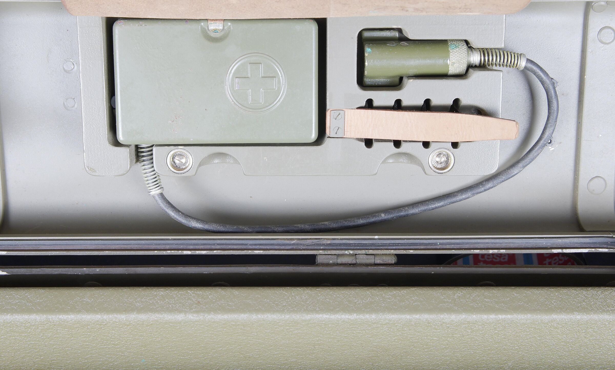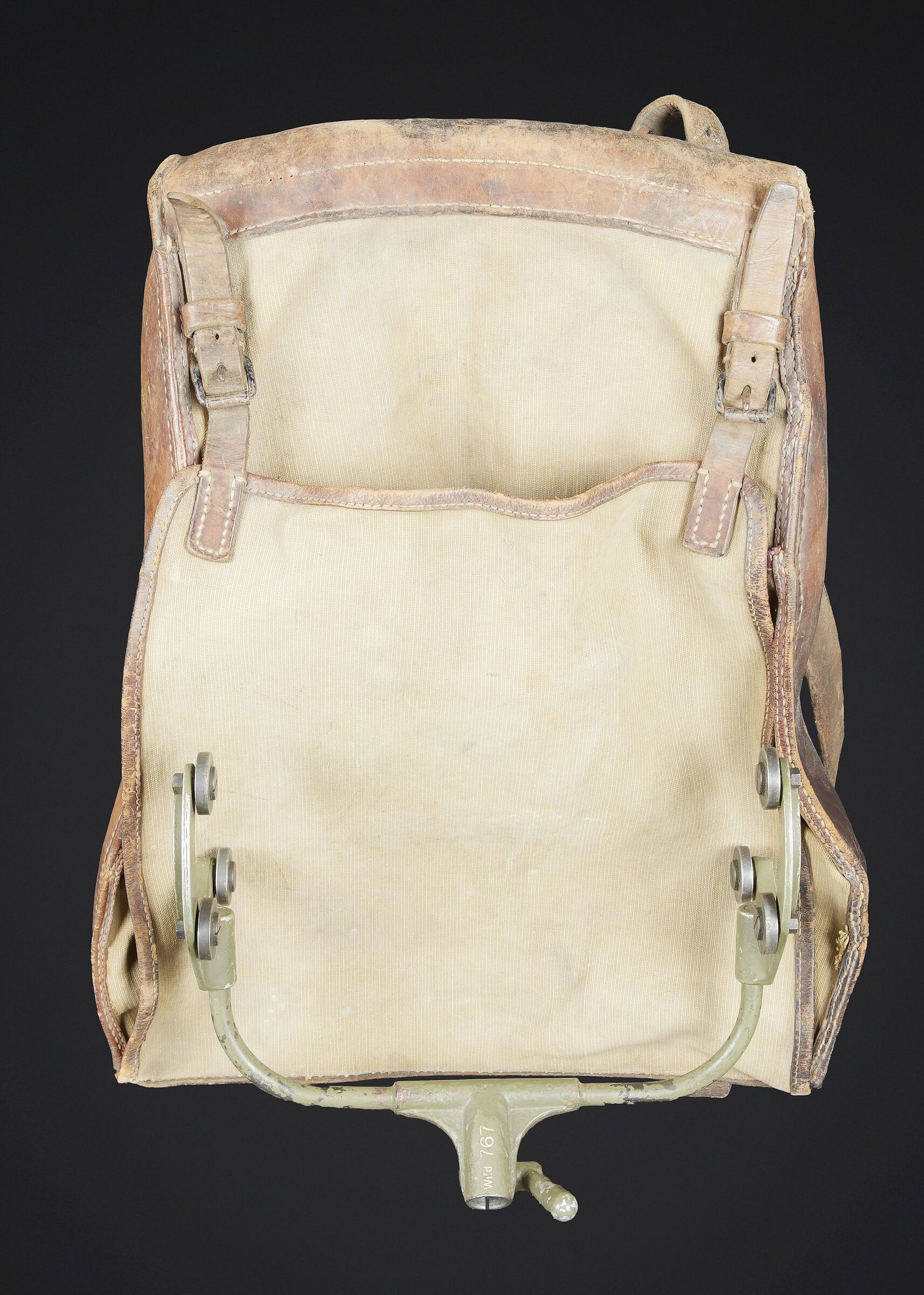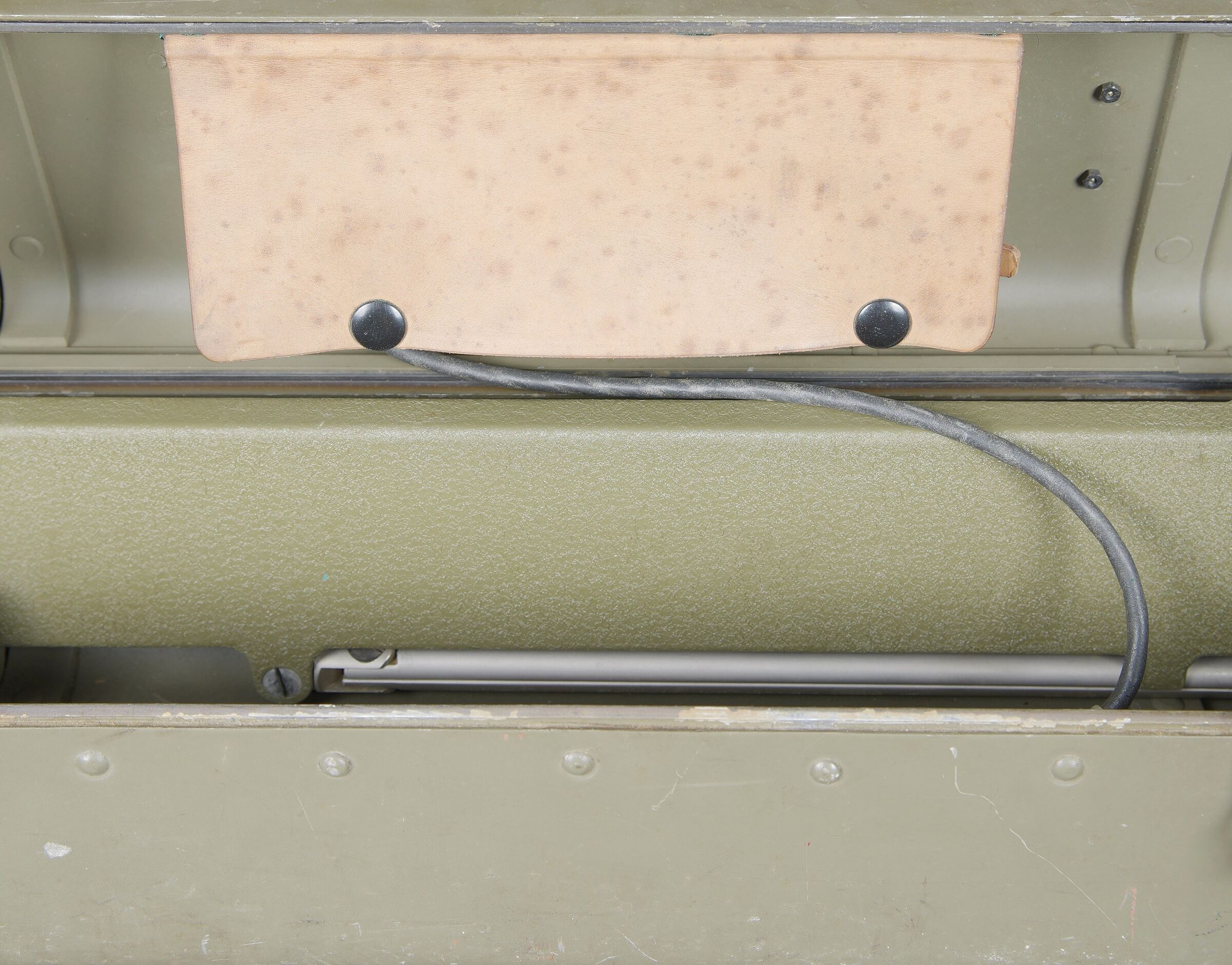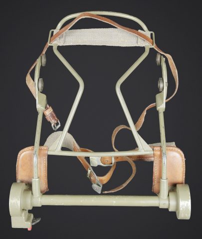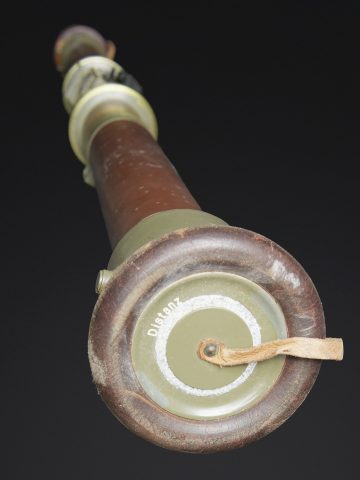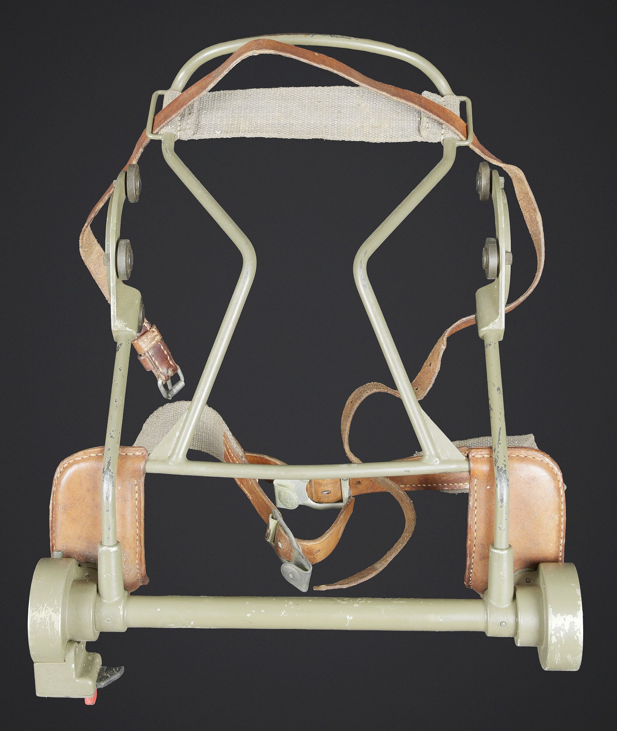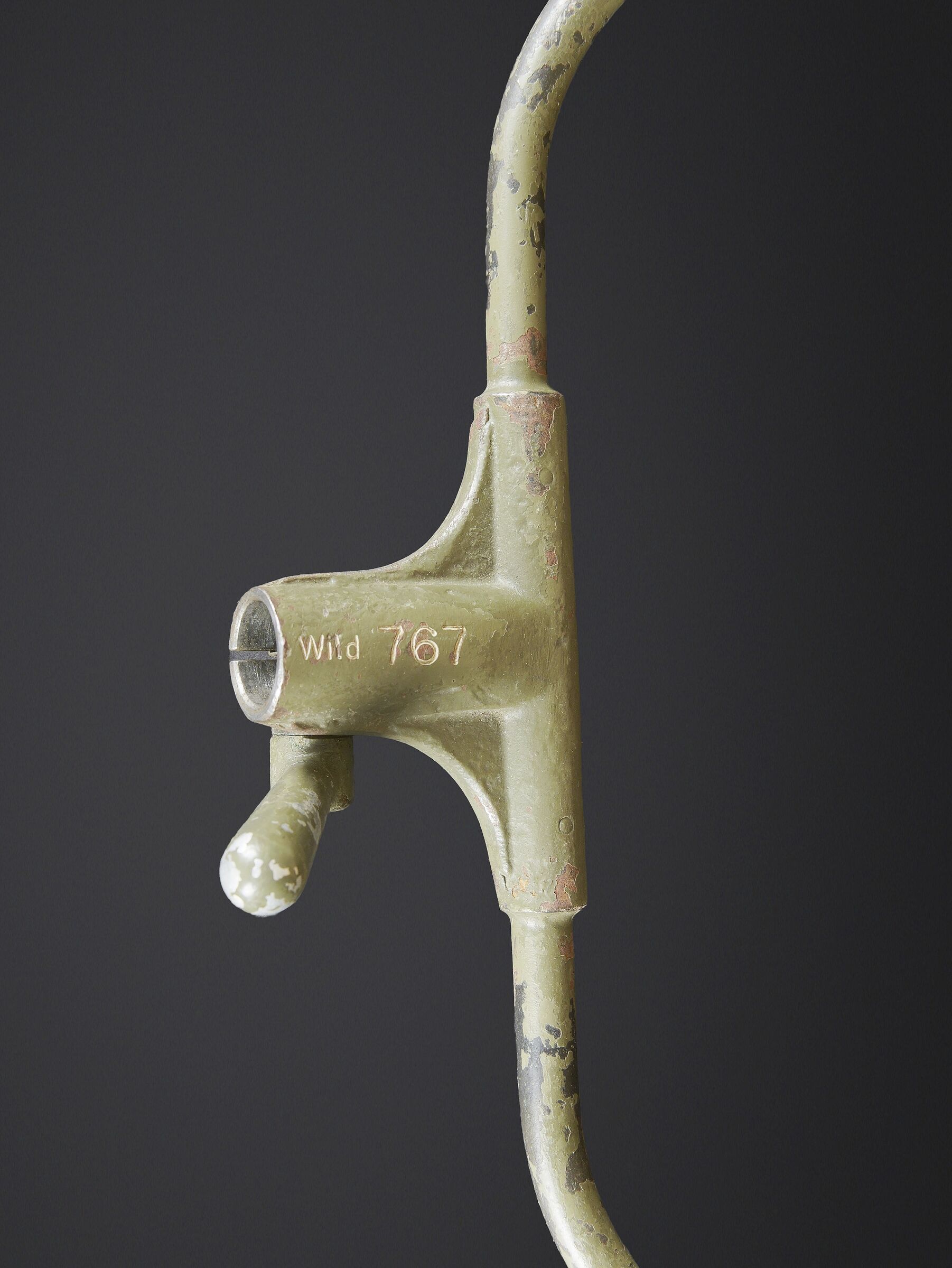 Télémètre suisse Wild. Belle caisse en métal. Peinture kaki à 70%. Les poignées de transport sont présentes. Les crochets de fermeture sont fonctionnels. Plaquette marquée Wild Heerbrugg N175. Télémètre en métal, couleur marron à 790%. Optique claire et graduée. Bonnettes en métal. Appui front présent ainsi que le système d’éclairage avec son câble. Plaquette marquée Stereo Telemeter Basis 125 cm N 175. Fabrication Wild Heerbrugg Lattenabstand 17 m 1941. Sacoche en cuir et toile. Toutes les sangles sont présentes. Contenant le support d’épaule pour le télémètre en métal. Peinture grise à 90%. La majorité des sangles sont présentes. A noter une certaine usure et patine de la pièce. Etat II+. Swiss Wild rangefinder Fine metal transport case with khaki paint 70% preserved. Carrying handles present. Closing hooks functional. Plate marked Wild Heerbrugg N175. Metal rangefinder in brown finish. Clear graduated optics. Metal eyepieces. Forehead rest present together with the illumination system and its cable. Plate marked Stereo Telemeter Basis 125 cm N 175. Manufactured by Wild Heerbrugg, base length 1.25 m, dated 1941. Leather and canvas carrying case with most straps present, containing the metal shoulder support for the rangefinder with grey paint 90% preserved. Note some wear and patina to the piece. Condition II+.