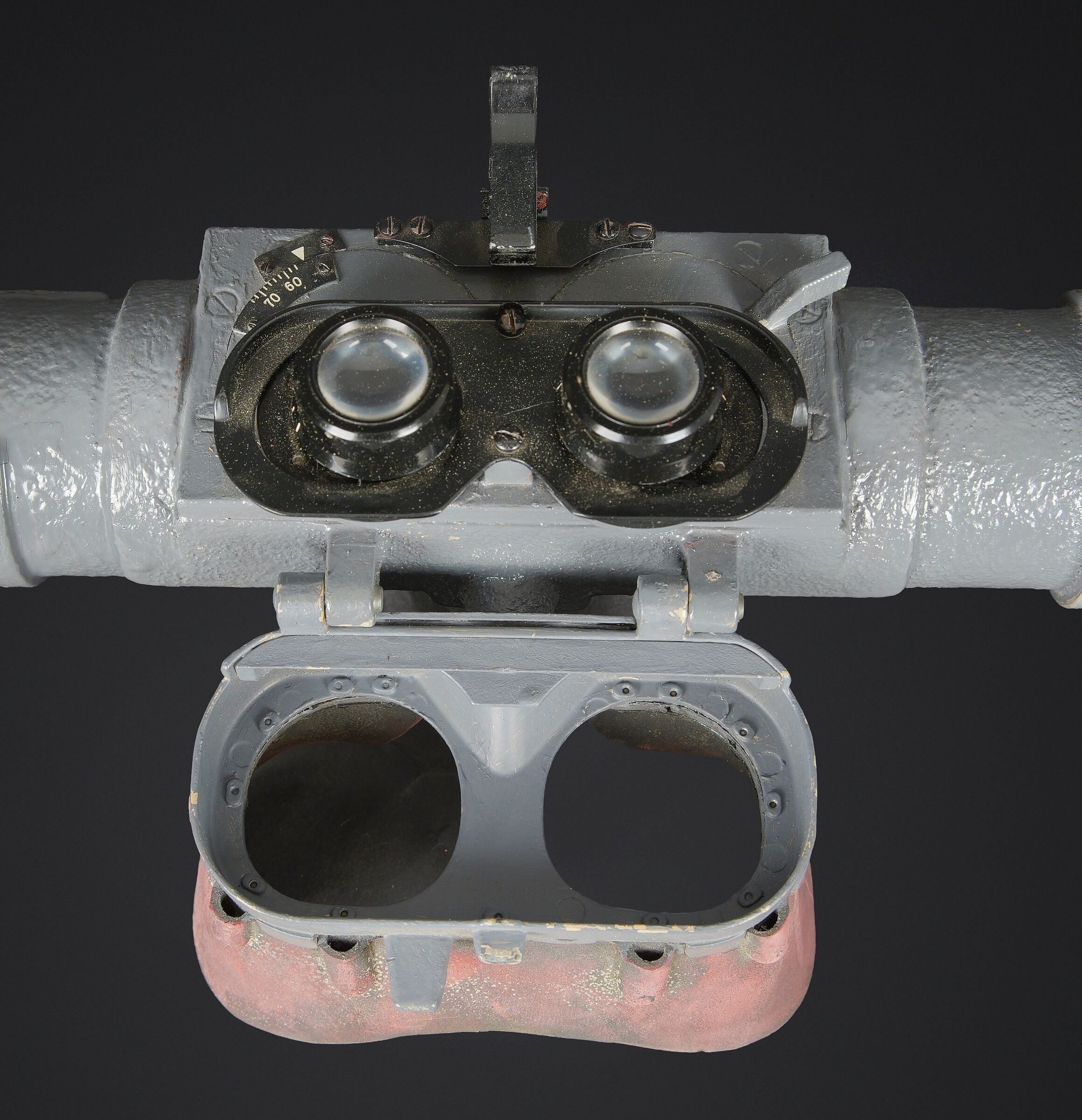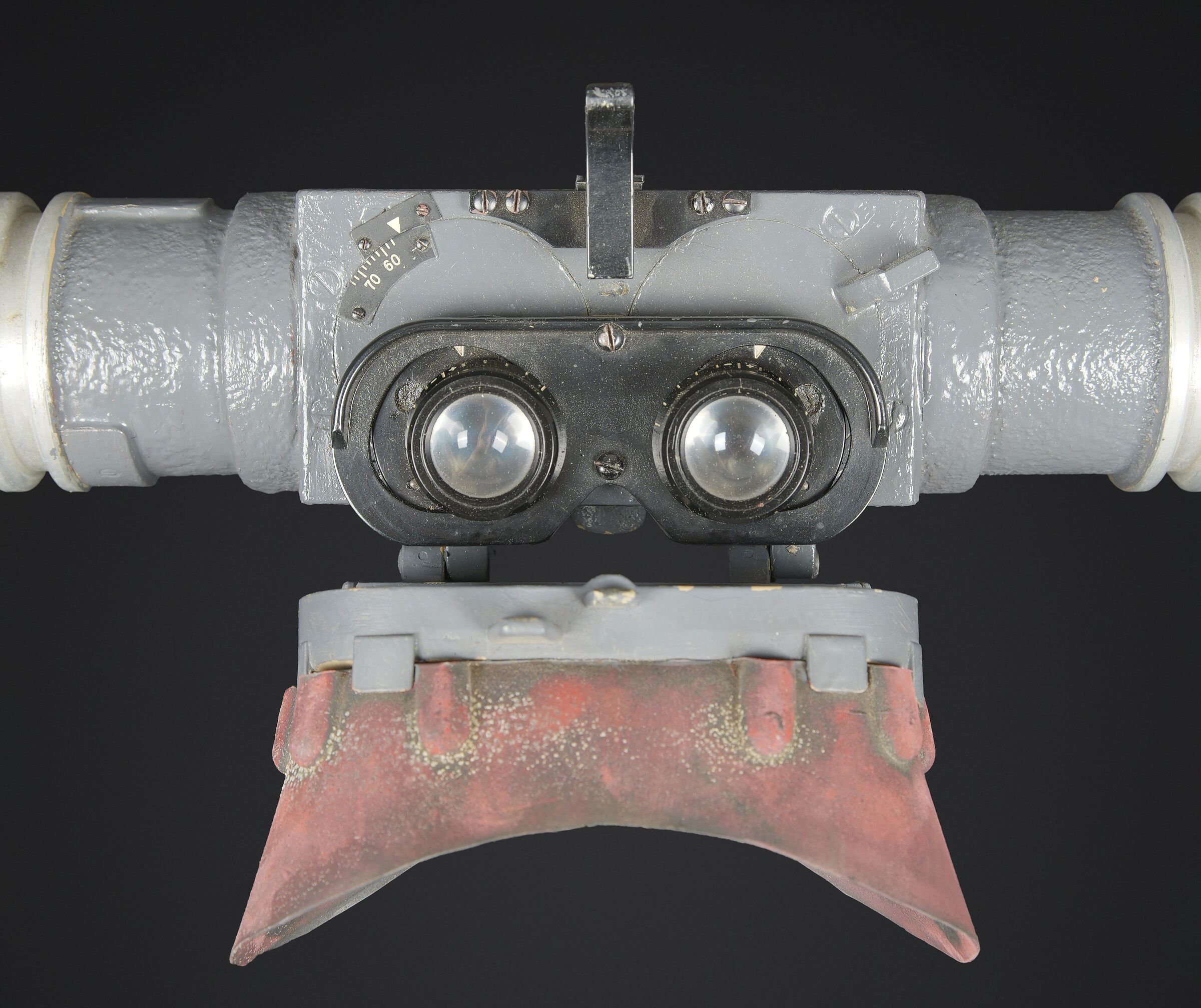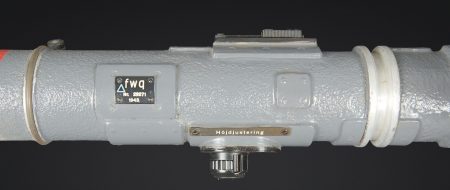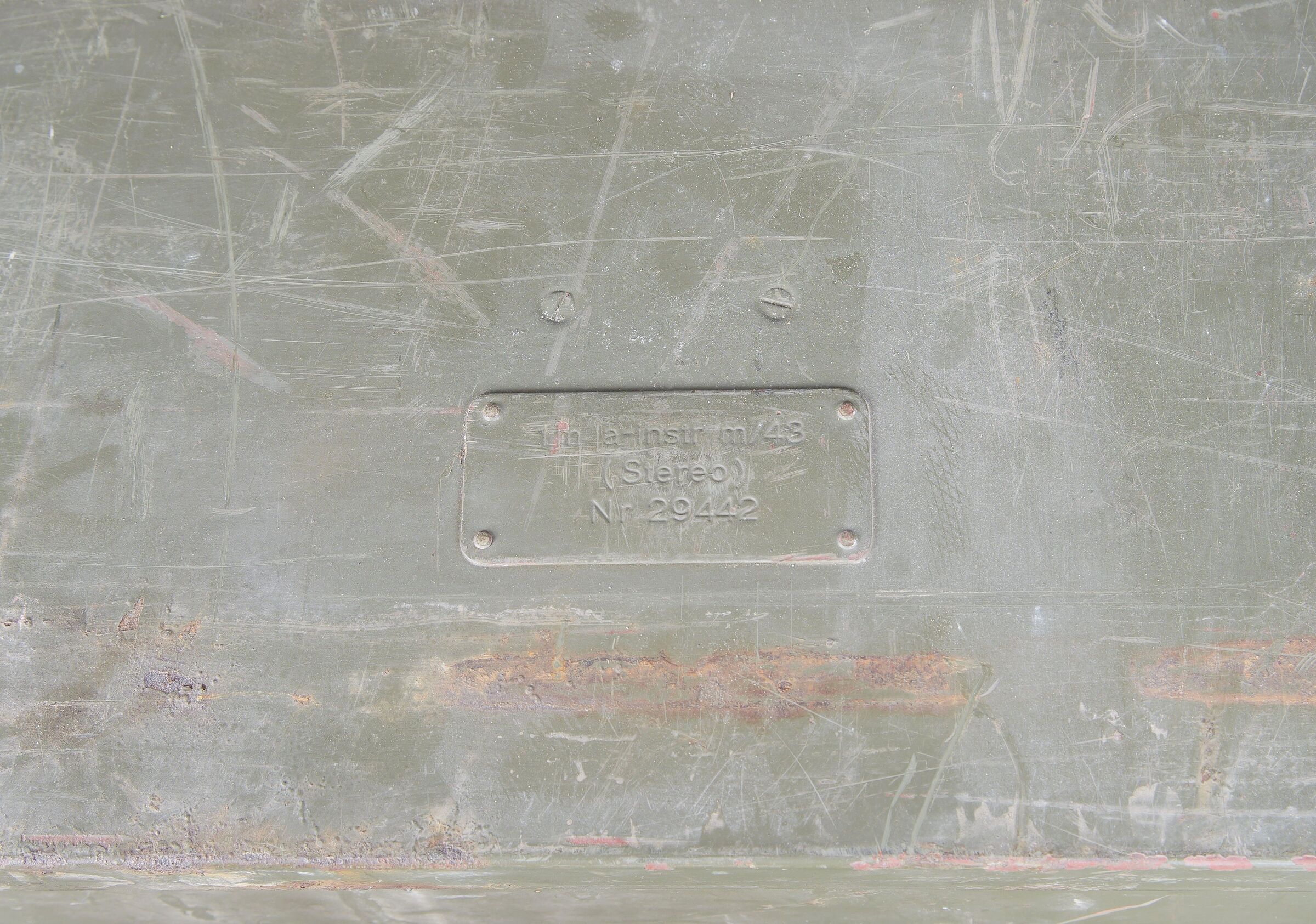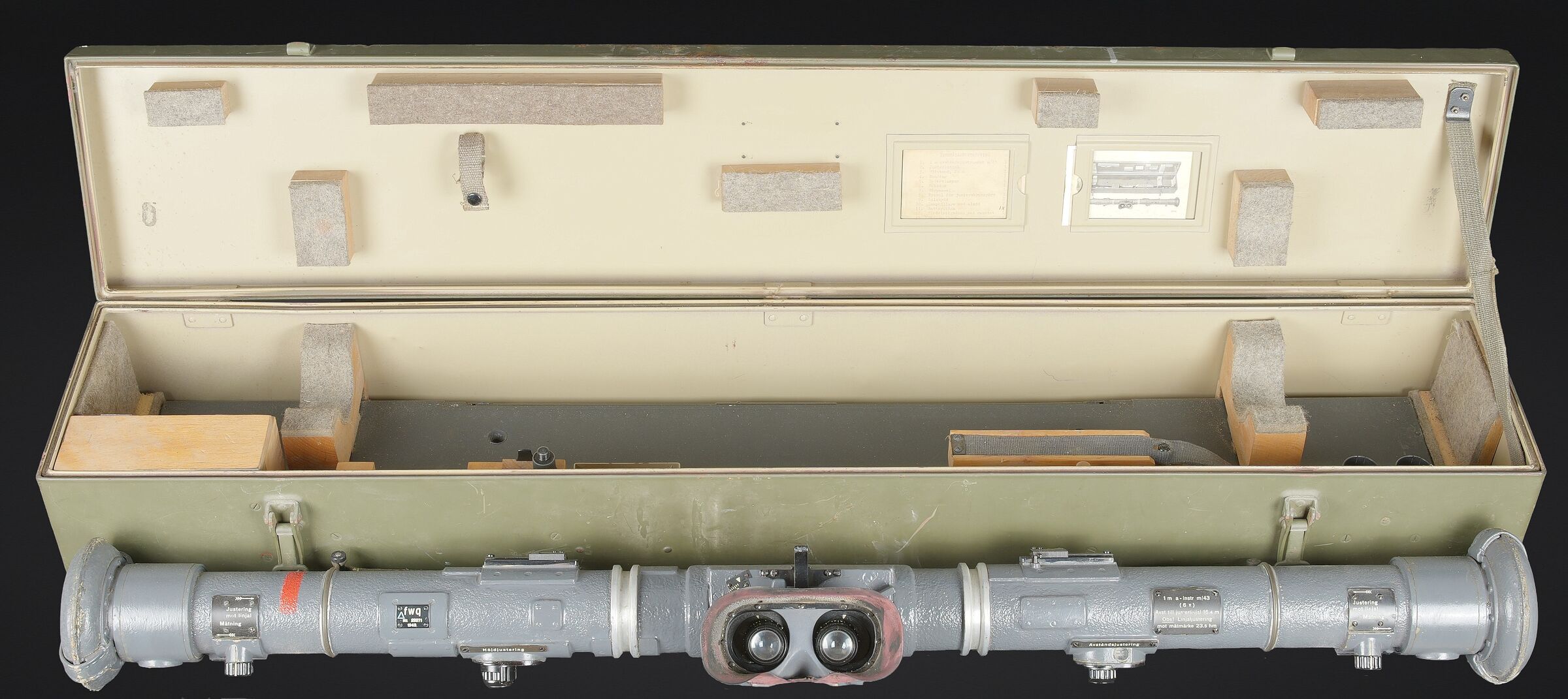 Télémètre WH en caisse; Caisse en métal, repeinte. Sans marquages visibles. Intérieur disposant de sa peinture jaune sable d’origine. Les crochets de fermeture sont complets. Les poignées de transport sont présentes. Plaque marquée 1m A Instr M/43 Steno Nr 29442. Notice d’inventaire présente. Toutes les cales en bois sont présentes et recouverte d’une feutrine. La majorité des accessoires sont manquants. Télémètre de couleur gris bleu. Fabrication FWQ nr 29271 1943. Bonnettes en cuir complètes. Règle de calcul présente dans la caisse. Appui front en caoutchouc rouge très usé et sec. Plaquette marquée 1 m A Instru M 43 6X. Optique claire avec quelques tâches. Sangle de transport en toile complète. A noter une certaine usure et patine de la pièce. Etat II+. WH rangefinder in case Repainted metal case with no visible external markings. Interior retaining its original sand-yellow paint. Closing hooks complete. Carrying handles present. Plate marked 1 m A Instr M/43 Steno Nr 29442. Inventory sheet present. All wooden internal supports present and felt-lined. Majority of accessories missing. Rangefinder in grey-blue finish. Manufactured by fwq Nr 29271 dated 1943. Complete leather eyepiece covers. Calculating slide rule present inside the case. Red rubber forehead rest very worn and hardened. Plate marked 1 m A Instru M 43 6×. Clear optics with some spotting. Complete canvas carrying strap. Note some wear and patina to the piece. Condition II+.