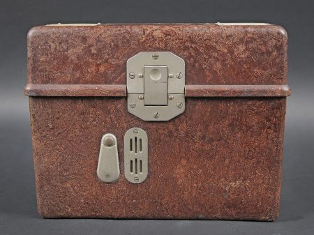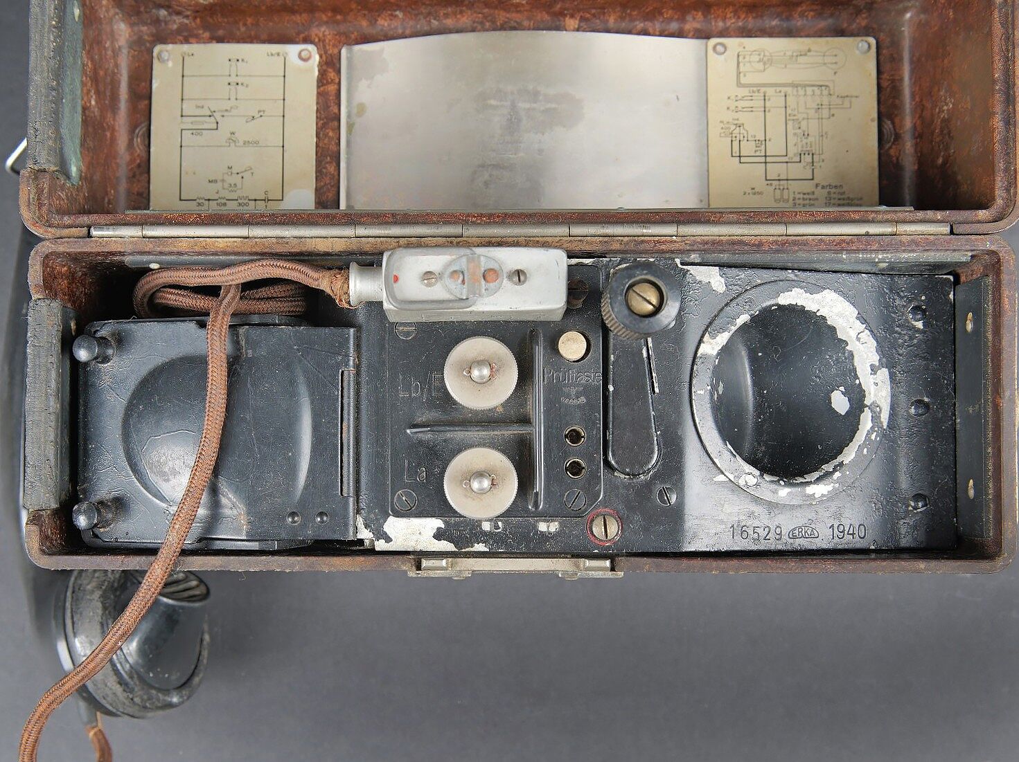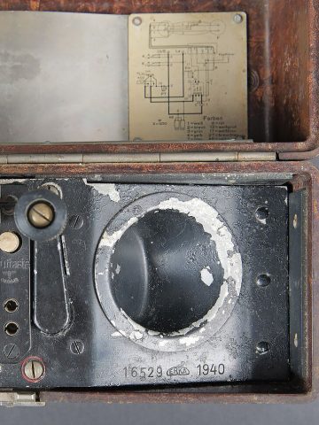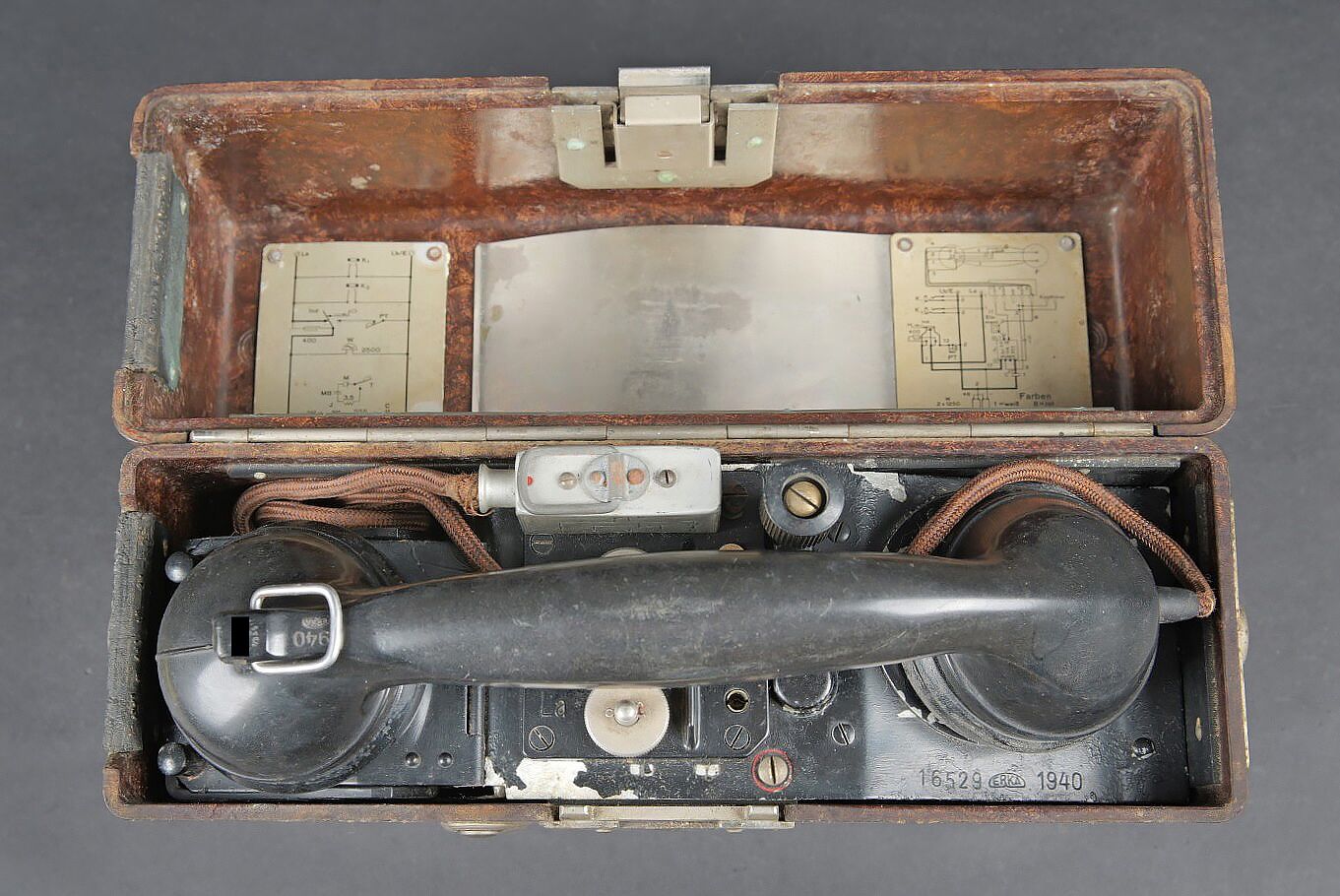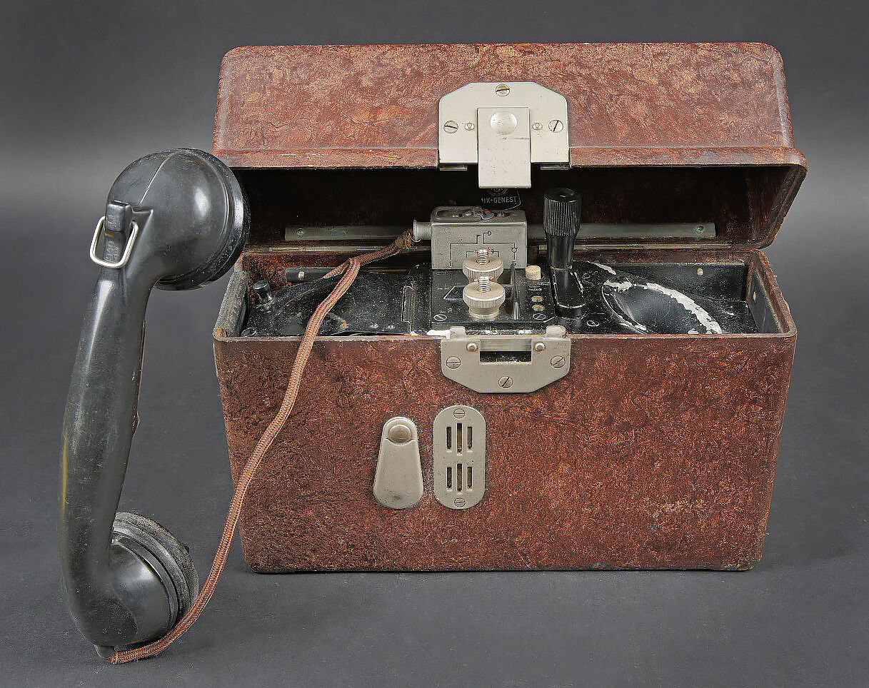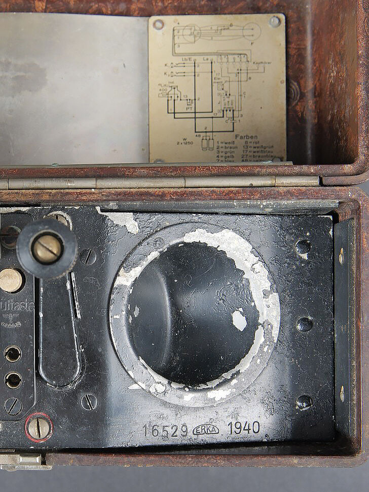 Téléphone de campagne WH. En bakélite marron. Les plaquettes sont présentes sur le couvercle. Manivelle complète, ainsi que le combiné. Câble et prise en bon état. Fabrication de 1940, numéro 16529. Pile et sangle de transport absente. A noter une certaine usure et patine de la pièce. Etat II+. WH field telephone Brown bakelite Data plates present on lid Complete crank and handset Cable and plug in good condition Manufactured 1940 serial 16529 Battery and carrying strap missing Noticeable wear and patina Condition II+