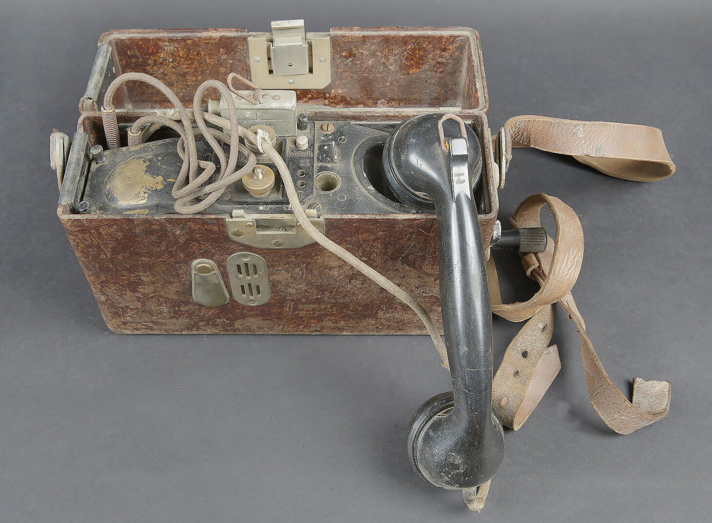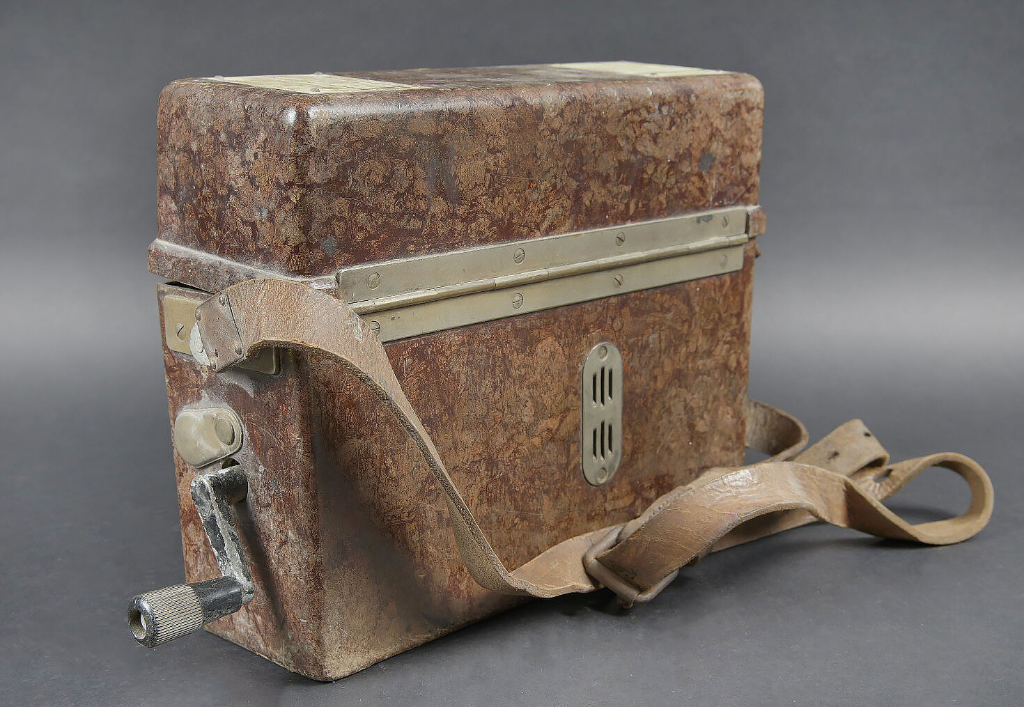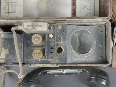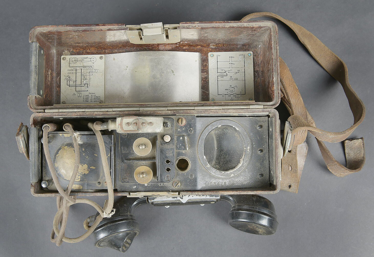 Téléphone de campagne WH. En bakélite marron. La manivelle est présente. Sangle de transport en marron. Celle-ci présente des craquelures et des traces d’oxydation. Fabrication de 1939, numéro 08478. Le combiné est présent. Pile présente. A noter une certaine usure et patine de la pièce. Etat II+. WH field telephone Brown bakelite Crank present Brown carrying strap with cracking and oxidation Manufactured 1939 serial 08478 Handset and battery present Noticeable wear and patina Condition II+