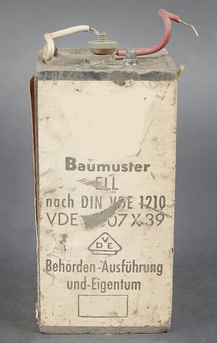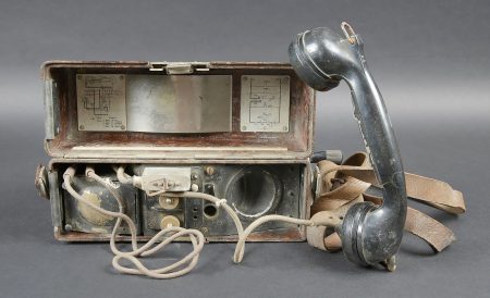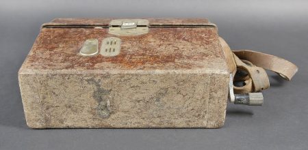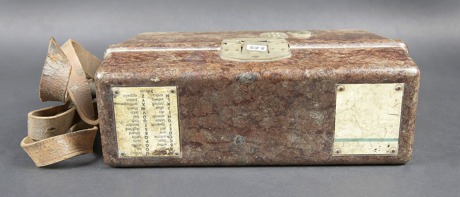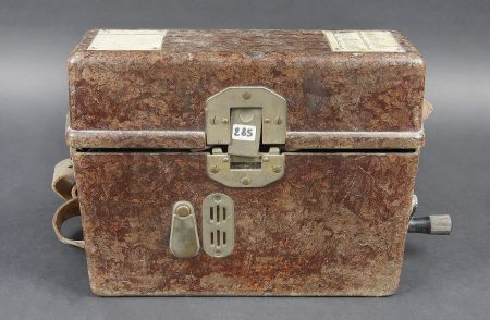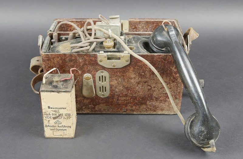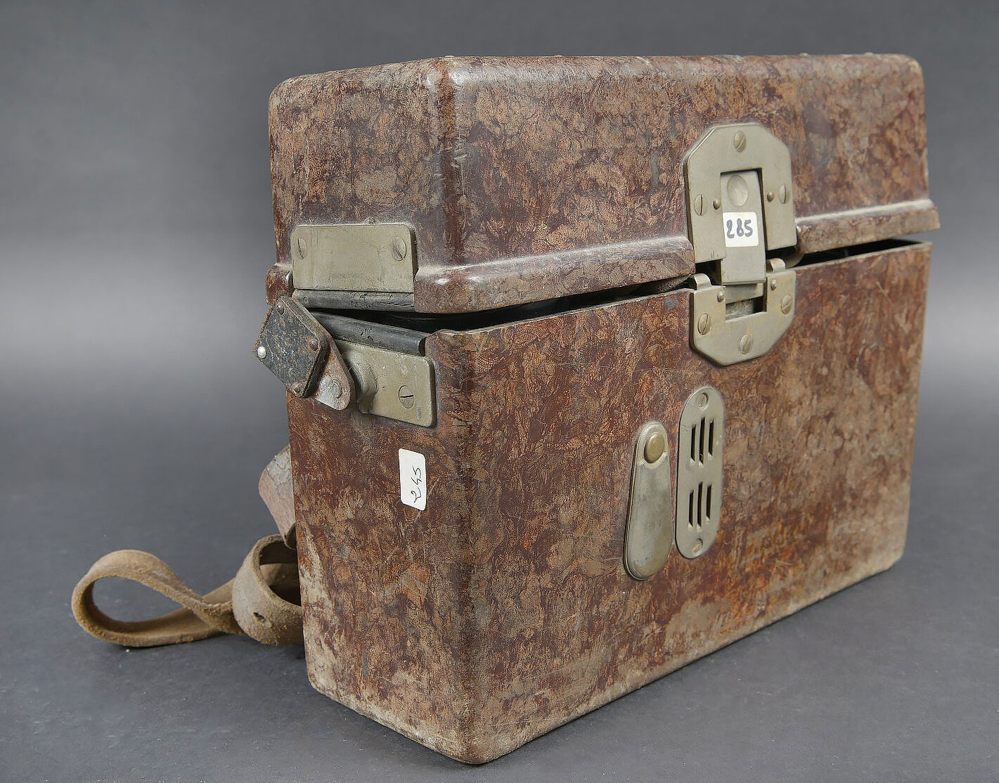 Téléphone de campagne WH. En bakélite marron. La manivelle est présente. Sangle de transport en marron. Celle-ci présente des craquelures et des traces d’oxydation. Fabrication de 1939, numéro 08478. Le combiné est présent. Pile présente. A noter une certaine usure et patine de la pièce. Etat II+. WH field telephone Brown bakelite Crank present Brown carrying strap with cracking and oxidation Manufactured 1939 serial 08478 Handset and battery present Noticeable wear and patina Condition II+