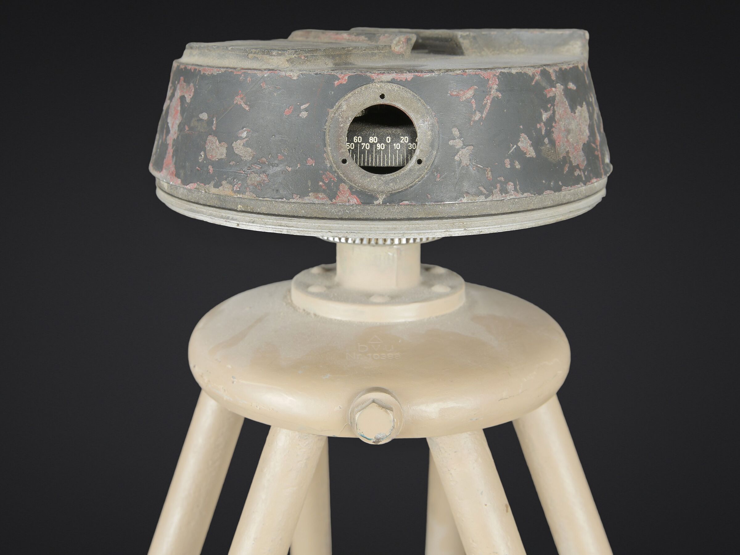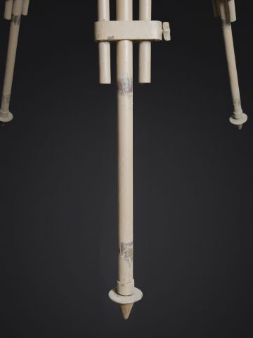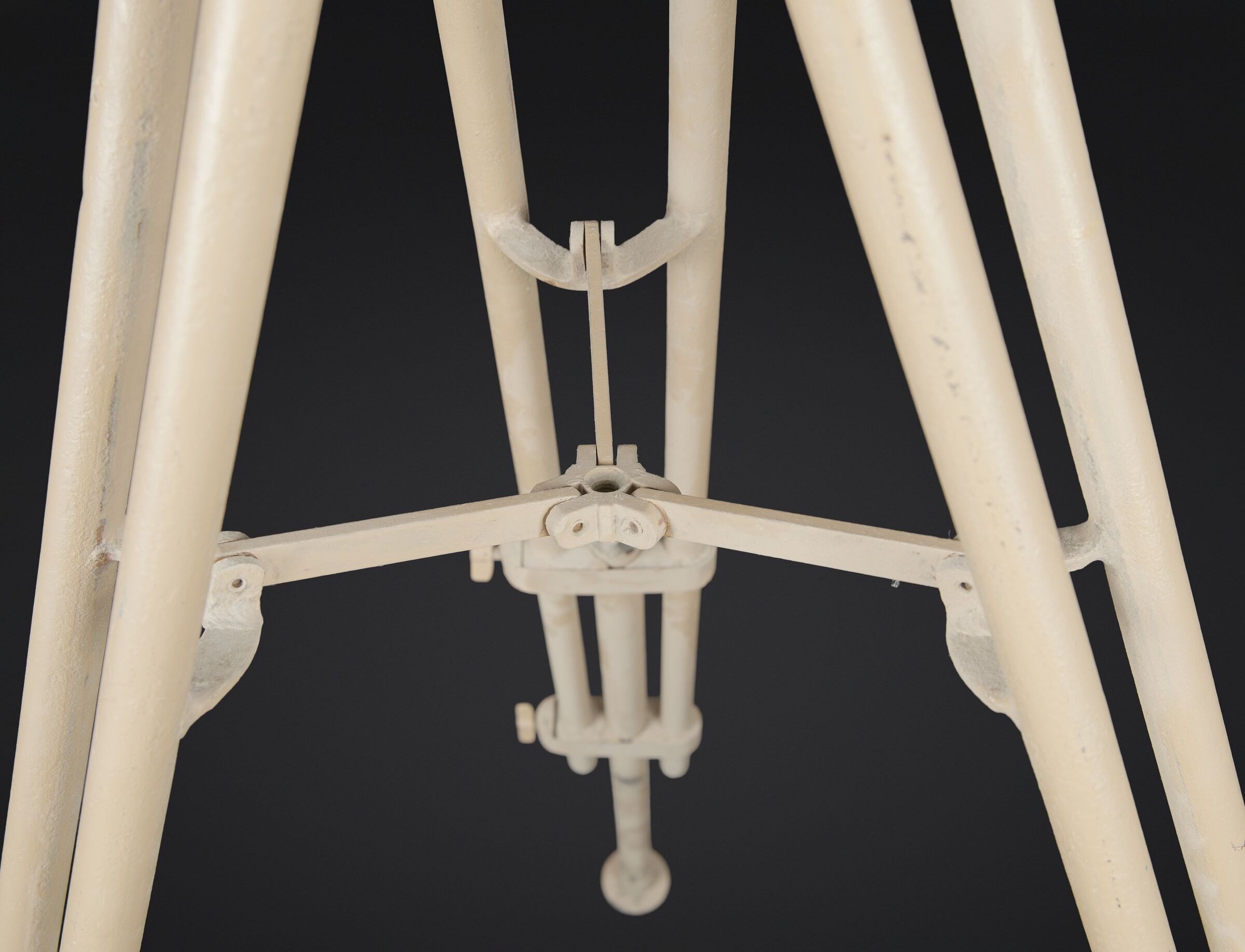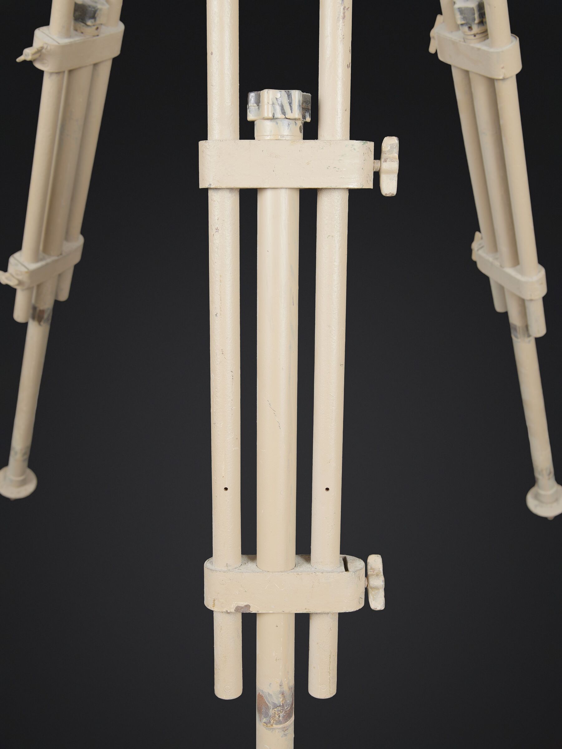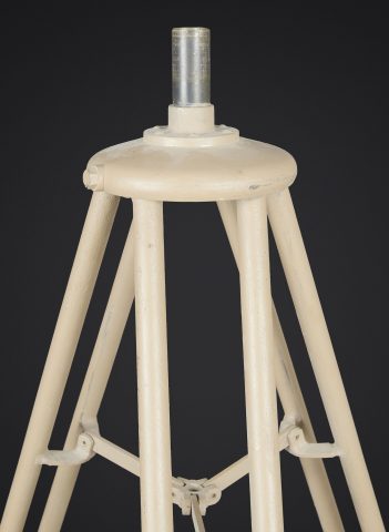 Trépied de binoculaire WH. En métal. Grand modèles. Pieds télescopiques. Peinture jaune sable à 80%. Peinture probablement postérieure. Toutes les pièces mobiles sont fonctionnelles. Les marquages sont illisibles. A noter une certaine usure et patine de la pièce. Etat II+. WH binocular tripod. Metal construction. Large model. Telescopic legs. Sand yellow paint 80% preserved, probably a later repaint. All moving parts are functional. Markings are illegible. Note some wear and patina to the piece. Condition II+.