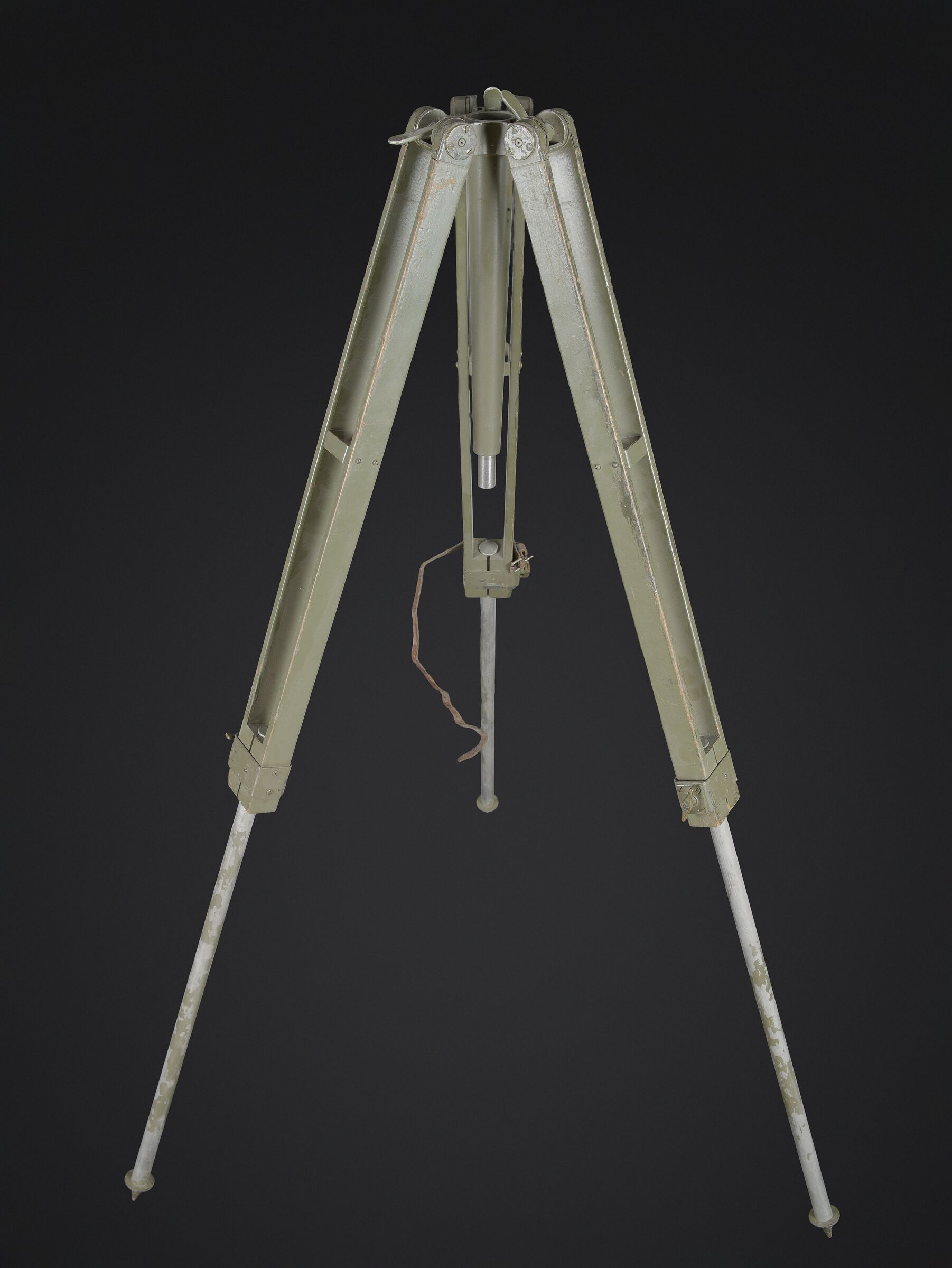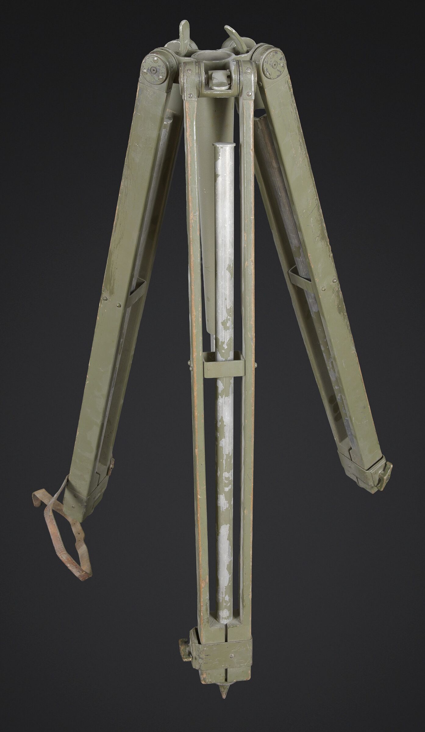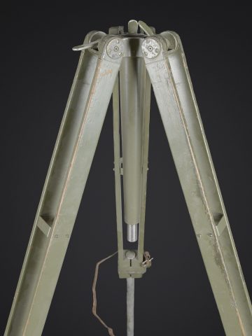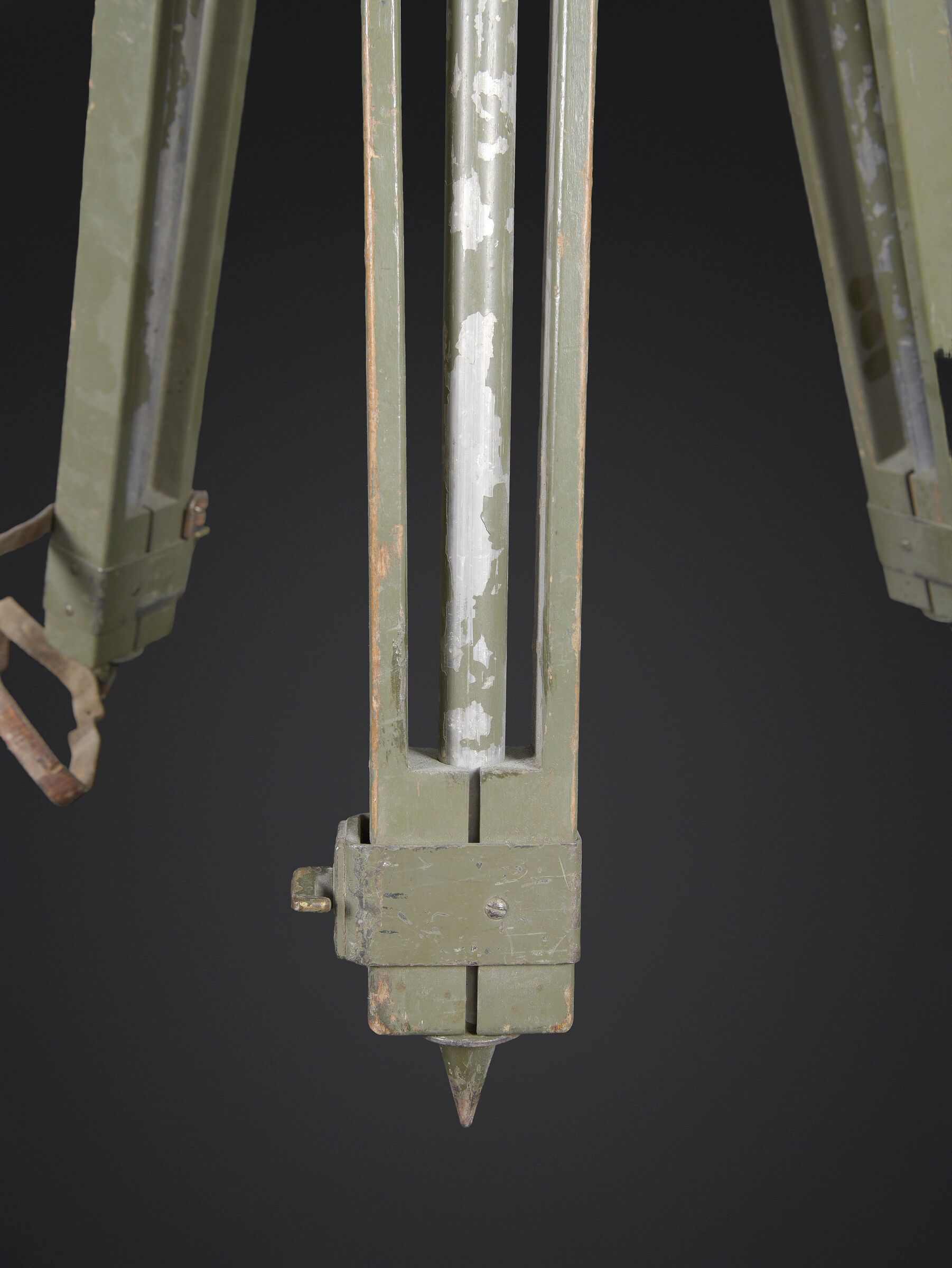 Trépied d’optique. En métal et bois. Peinture kaki à 80%. Pieds télescopique. Une sangle en cuir marron permet de maintenir les trois pieds serrés. Toutes les pièces mobiles sont fonctionnelles. Sans marquages visible. A noter une certaine usure et patine de la pièce. Etat II+. Optical tripod. Metal and wood retaining approximately 80% of its khaki paint with telescopic legs and brown leather strap for securing the legs together. All moving parts functional. No visible markings. Noteworthy overall wear and an attractive period patina. Condition II+.