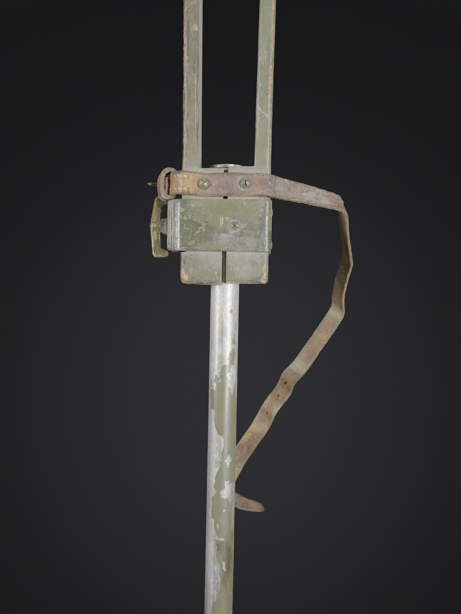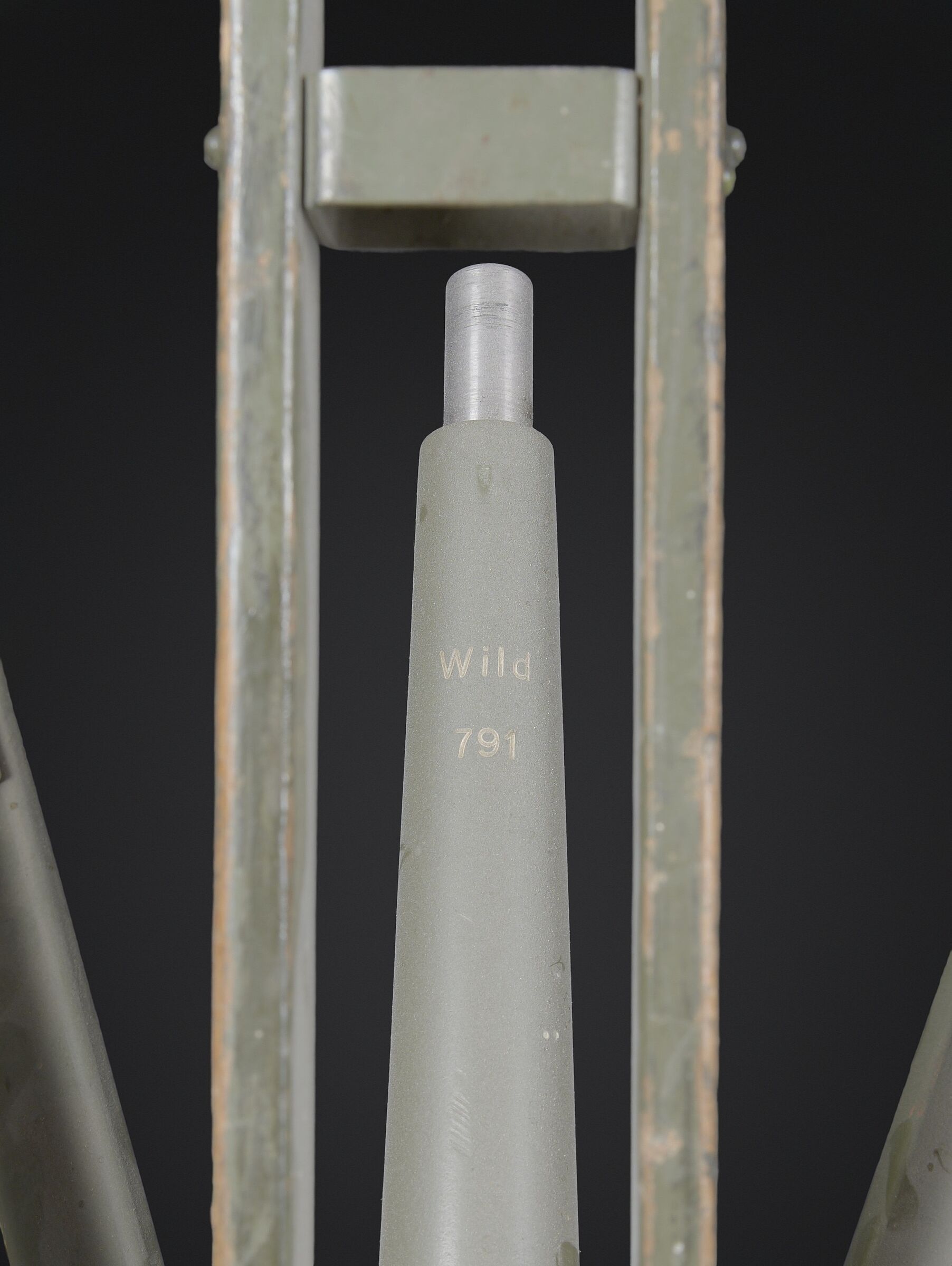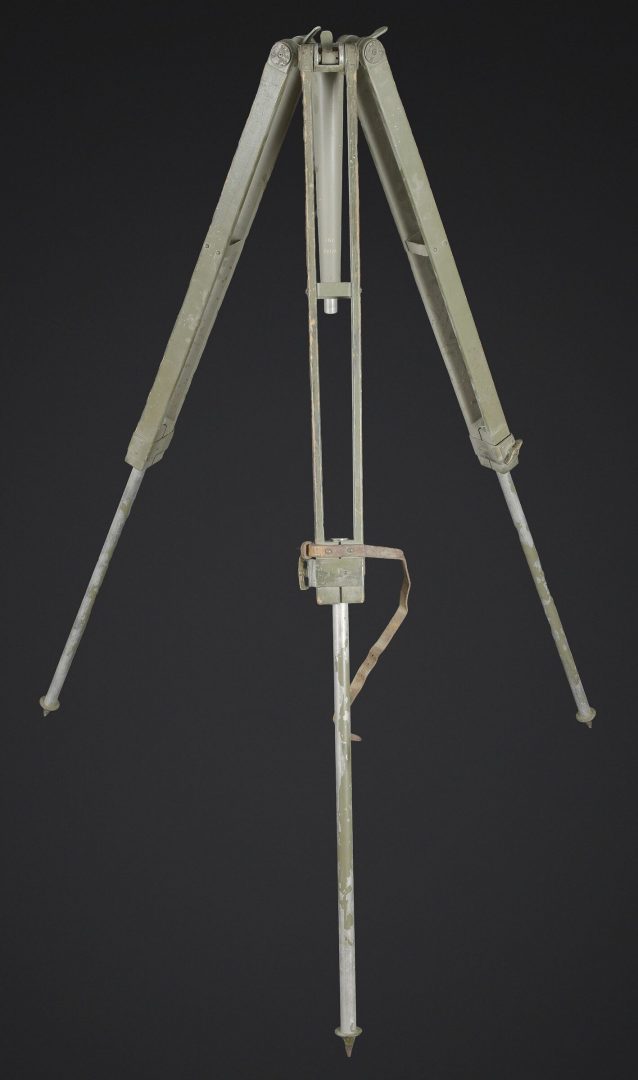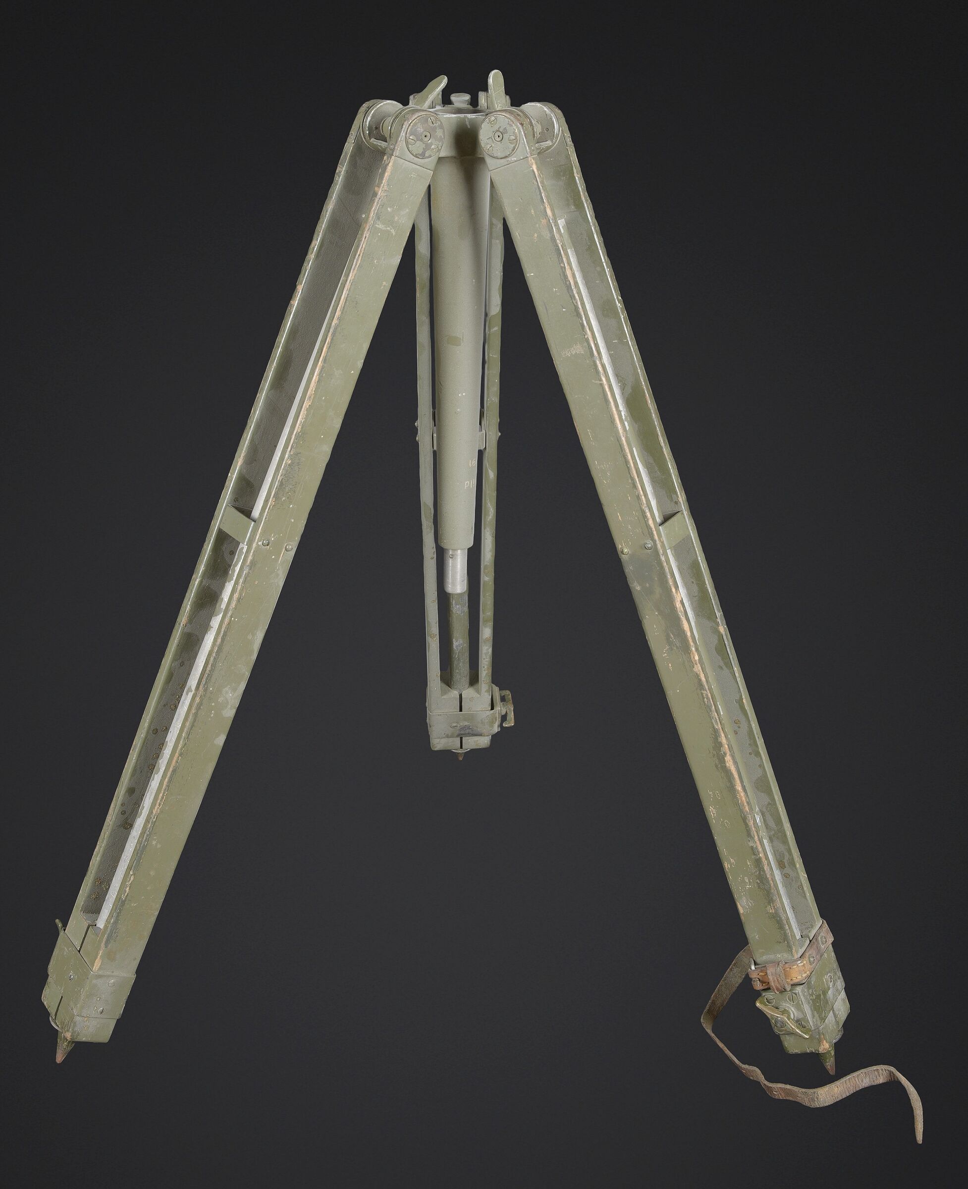 Trépied d’optique. En métal et bois. Peinture kaki à 80%. Pieds télescopique. Une sangle en cuir marron permet de maintenir les trois pieds serrés. Toutes les pièces mobiles sont fonctionnelles. Sans marquages visible. A noter une certaine usure et patine de la pièce. Etat II+. Optical tripod. Metal and wood retaining approximately 80% of its khaki paint with telescopic legs and brown leather strap for securing the legs together. All moving parts functional. No visible markings. Noteworthy overall wear and an attractive period patina. Condition II+.