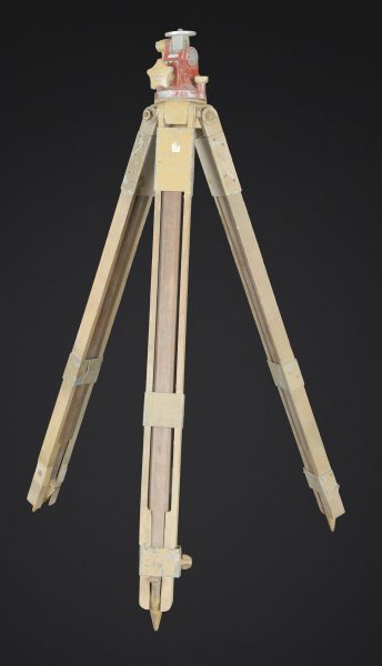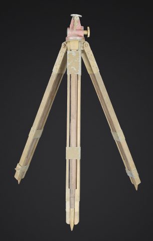 Trépied d’optique WH. En bois et métal, peinture jaune sable à 70%, visiblement postérieure. Pieds télescopiques. Trois pointe de fixation en métal, pour l’ancrage au sol.... en savoir plus
