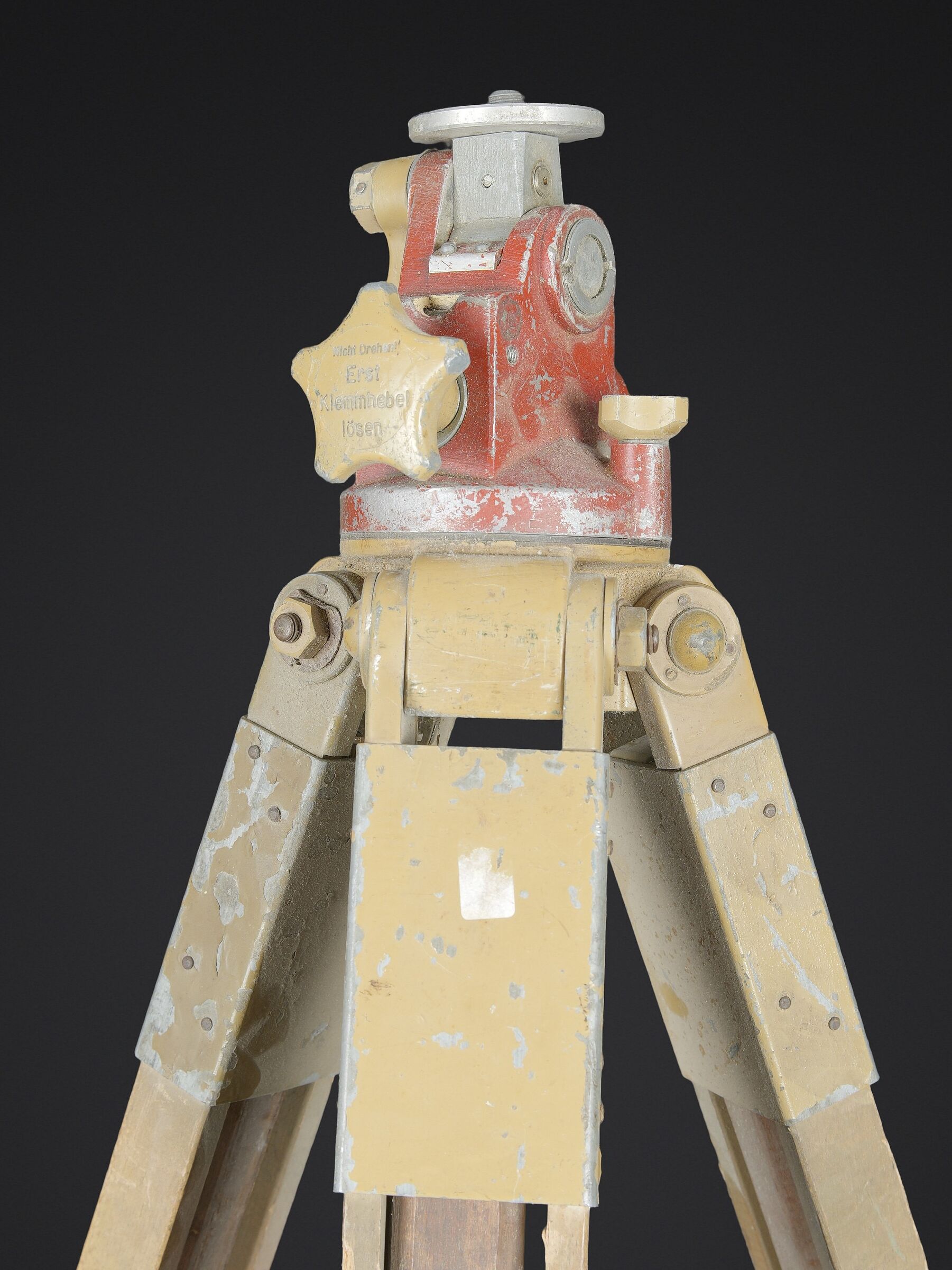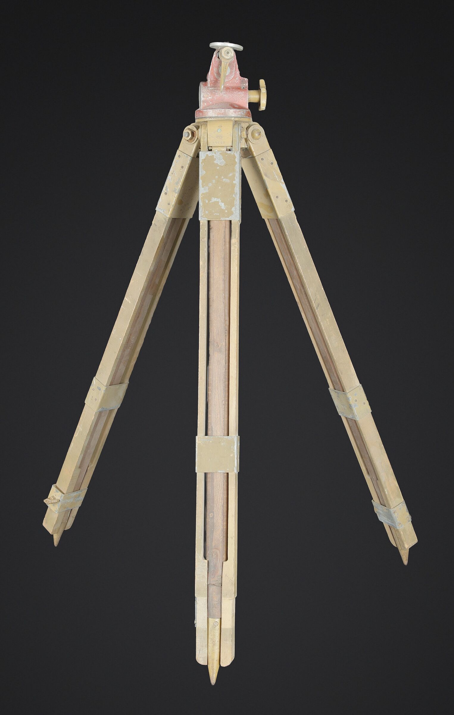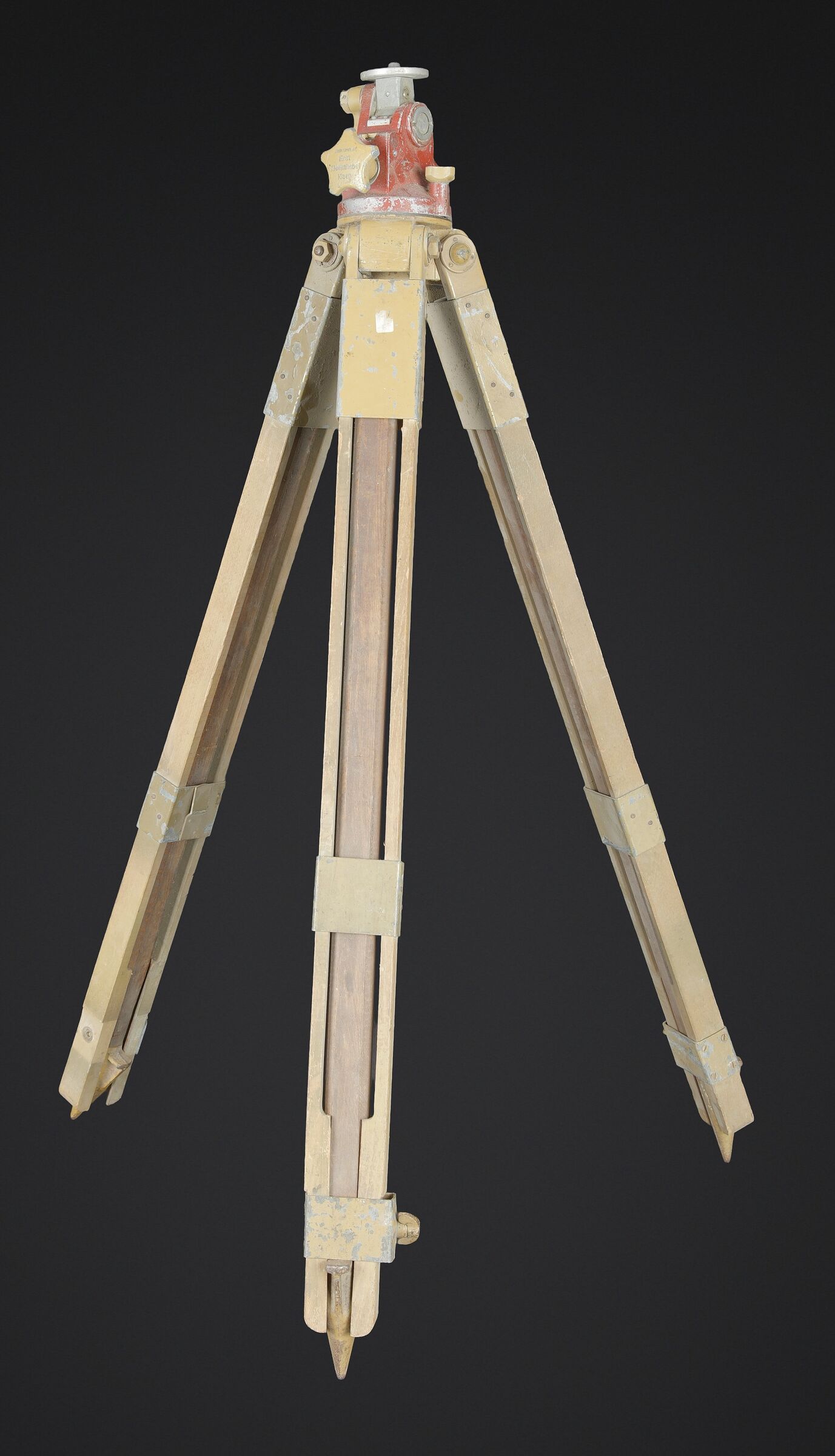 Détails de la vente >Trépied d’optique WH. En bois et métal, peinture jaune sable à 70%, visiblement postérieure. Pieds télescopiques. Trois pointe de fixation en métal, pour l’ancrage au sol.... en savoir plus