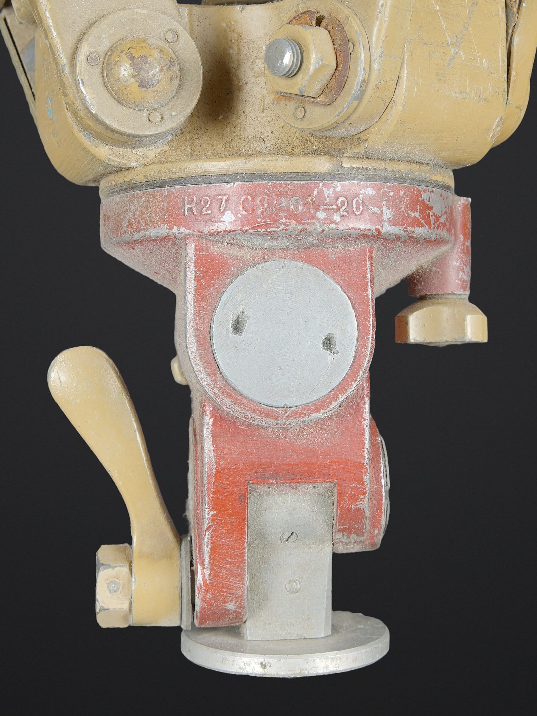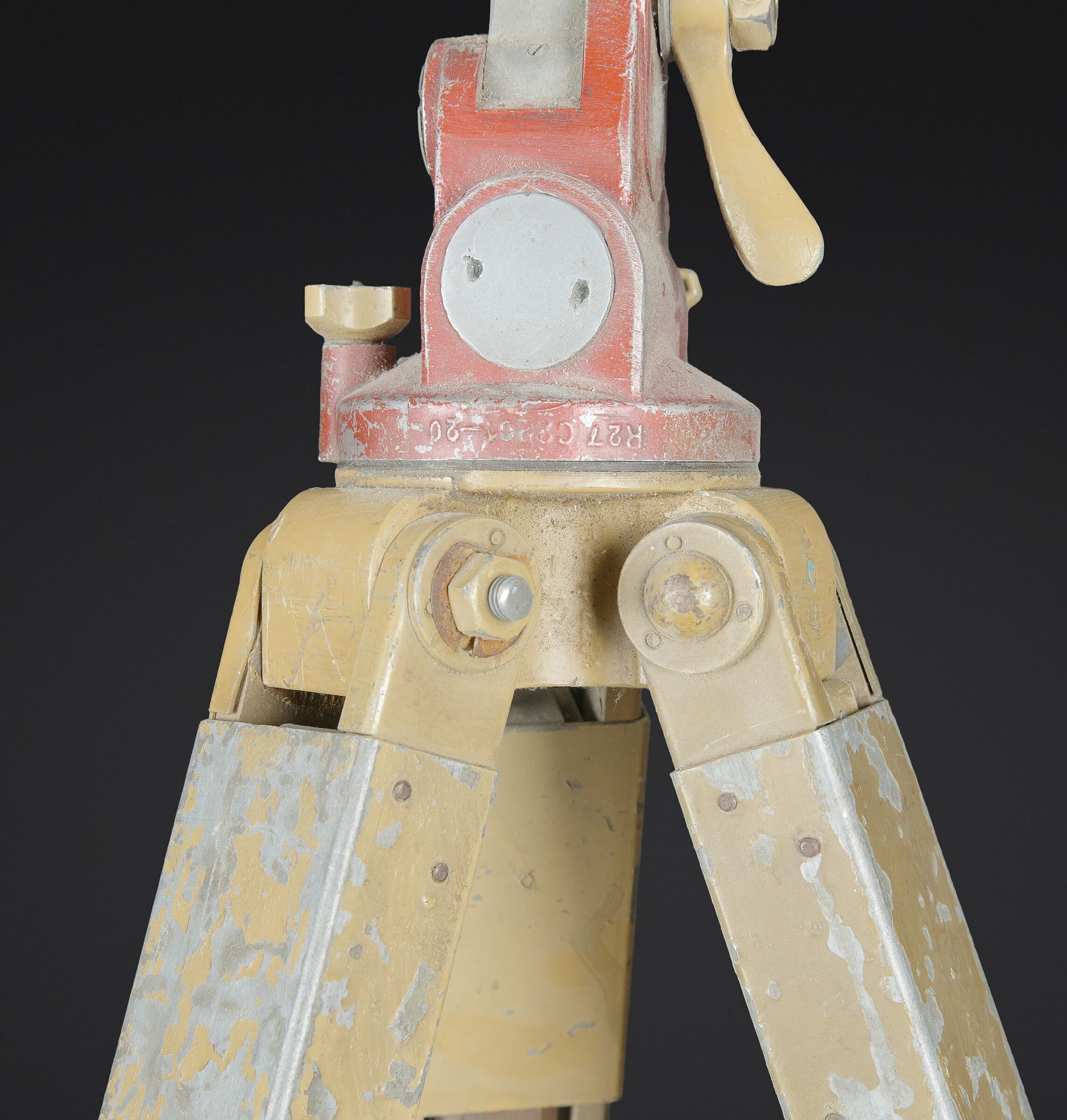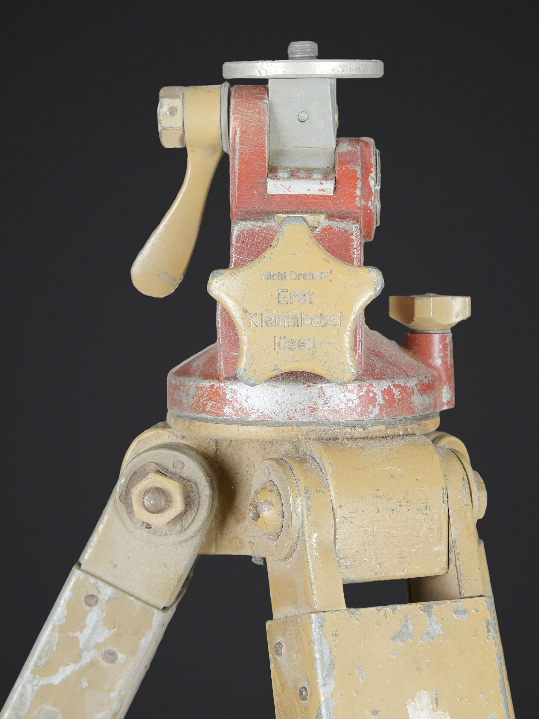 Détails de la vente >Trépied d’optique WH. En bois et métal, peinture jaune sable à 70%, visiblement postérieure. Pieds télescopiques. Trois pointe de fixation en métal, pour l’ancrage au sol.... en savoir plus