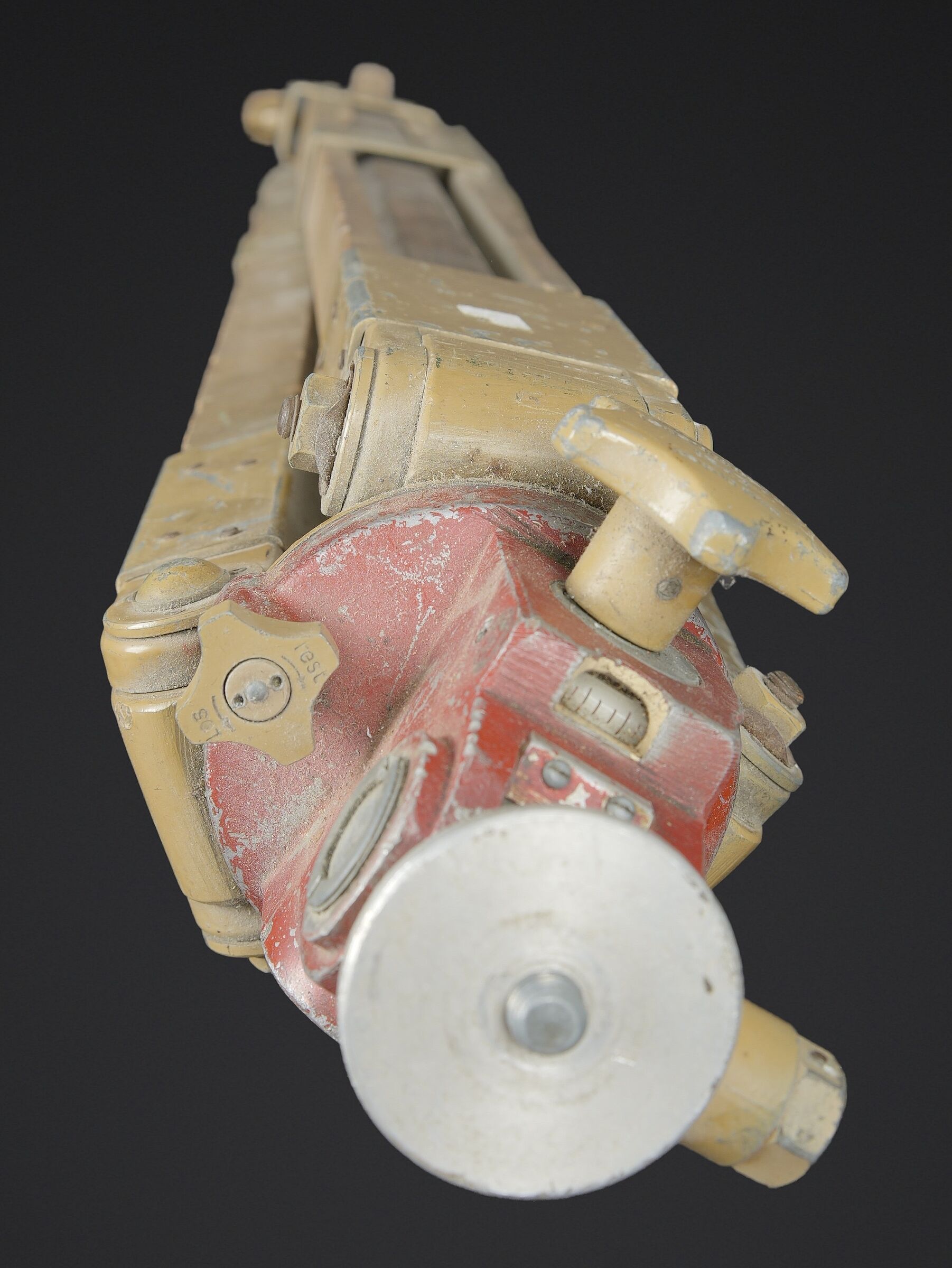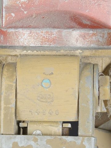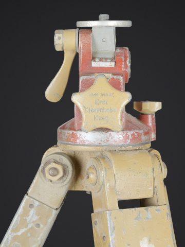 Trépied d’optique WH. En bois et métal, peinture jaune sable à 70%, visiblement postérieure. Pieds télescopiques. Trois pointe de fixation en métal, pour l’ancrage au sol. Support d’optique de couleur rouge. Toutes les pièces mobiles sont fonctionnelles. Marquages Waa. Fabrication CLQE 14340. A noter une certaine usure et patine de la pièce. Etat II+. WH optic tripod. Wood and metal construction with sand yellow paint 70% preserved, apparently a later repaint. Telescopic legs with three metal ground anchoring spikes. Red optic support. All moving parts are functional. Waa markings. Manufactured by CLQE 14340. Note some wear and patina to the piece. Condition II+.