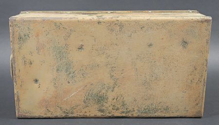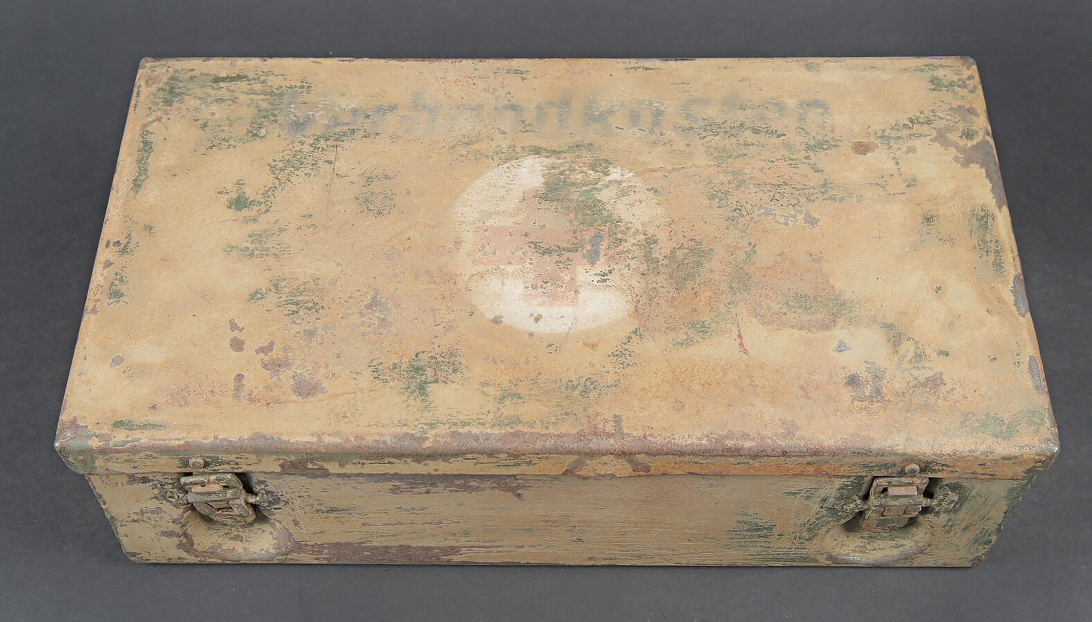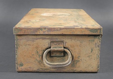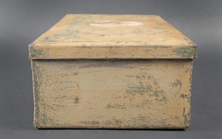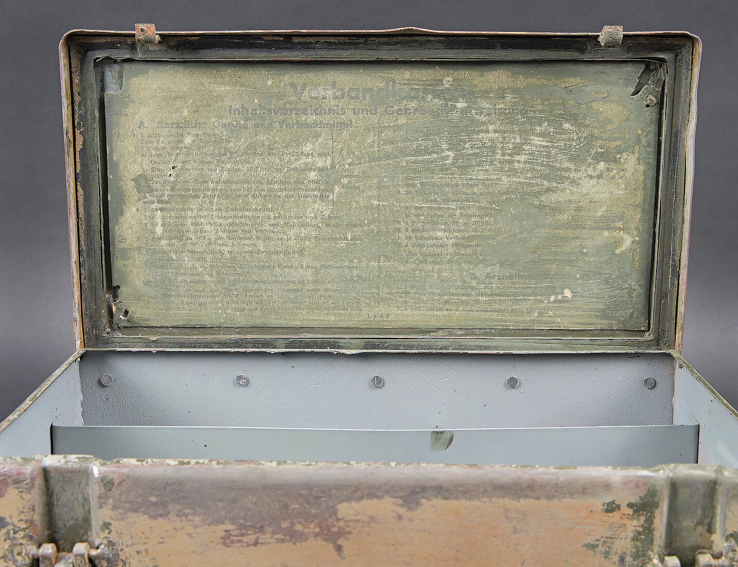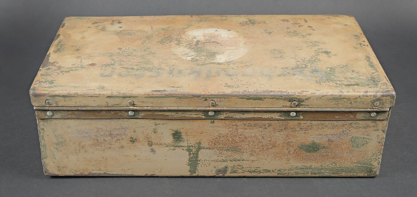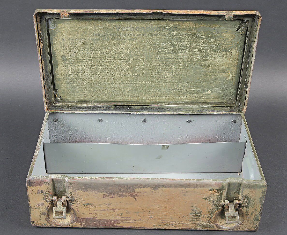 Verbandkasten. Caisse en métal. La poignée de transport est présente. Les crochets de fermeture sont fonctionnels. Peinture et marquages frotté et partiellement décapés. Rack interne présent. Notice recouverte d’une sorte de peinture verte. Contenant deux paquets de compresse. A noter une certaine usure et patine des pièces. Etat II+. Verbandkasten. Metal case with carrying handle present. Functional closure latches. Paint and markings worn and partially stripped. Internal rack present. Instruction sheet covered with a green paint layer. Contains two dressing packets. Showing wear and patina. Condition II+.