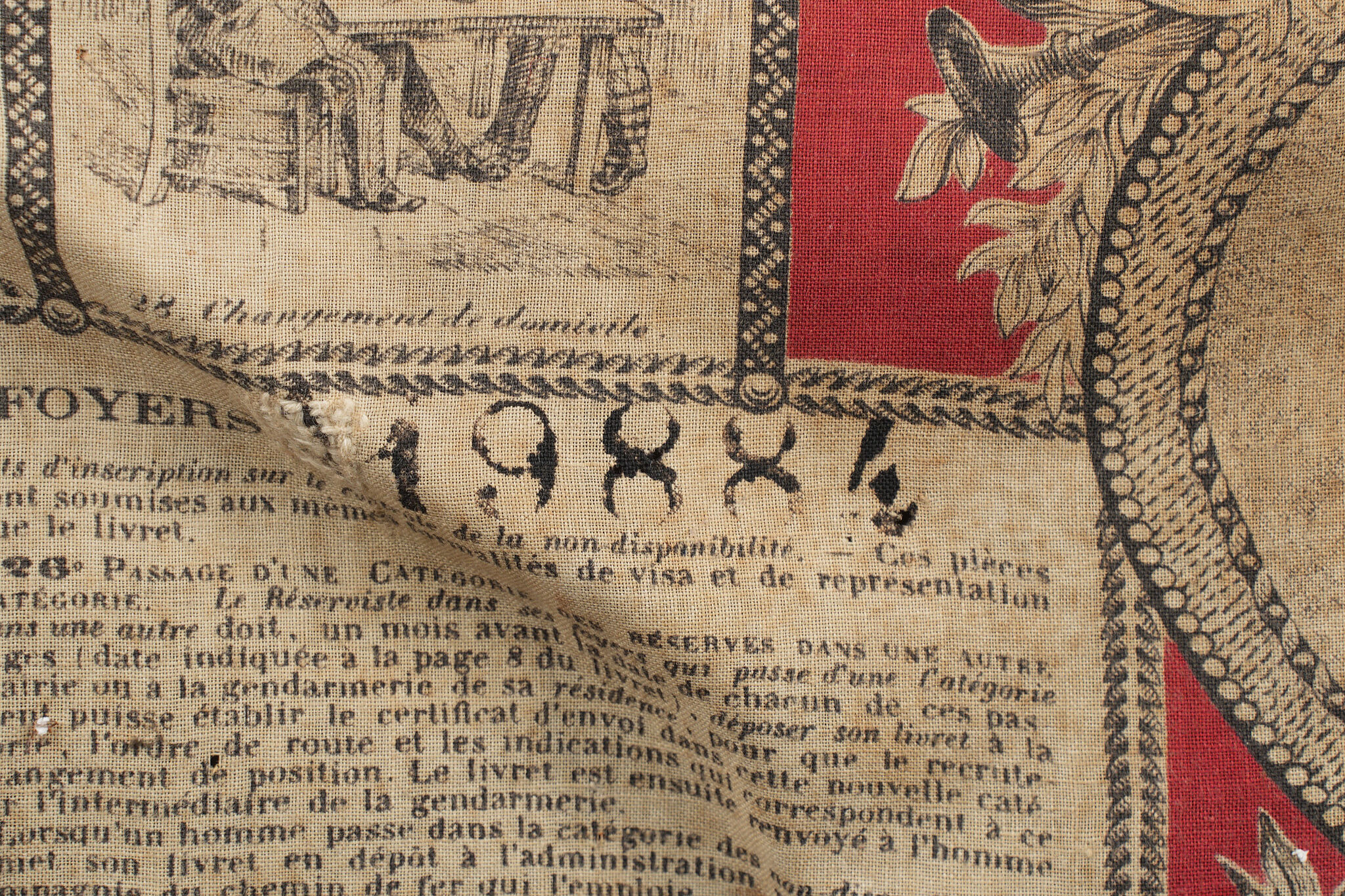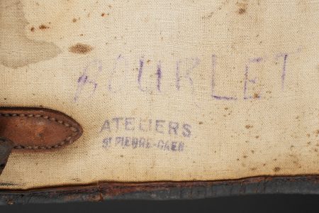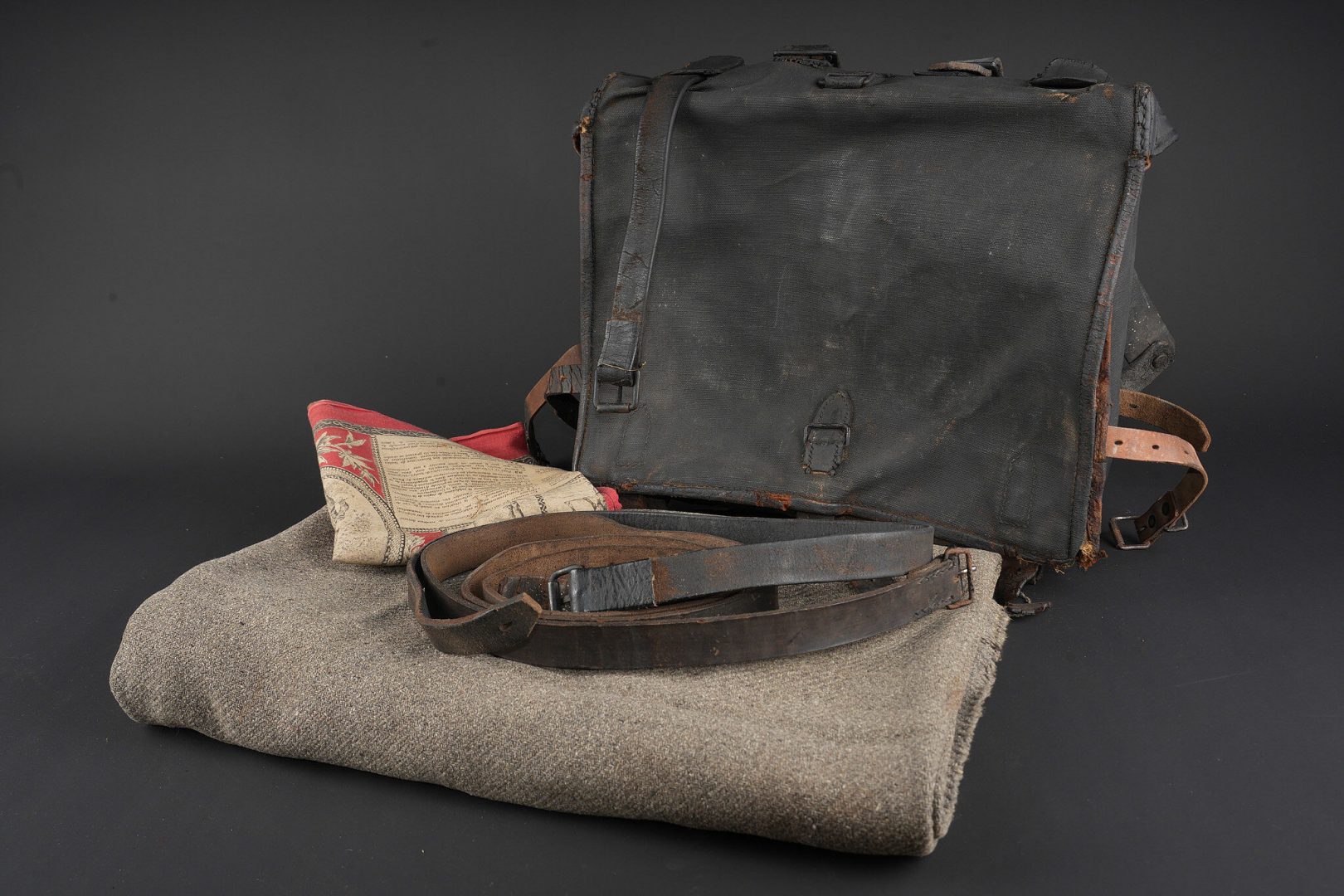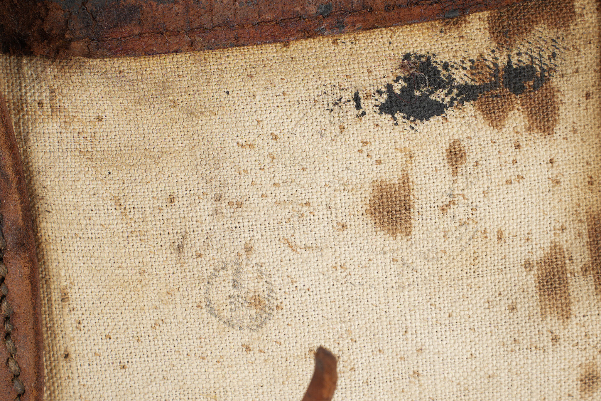 As de carreau noirci 1893. En toile kaki claire noircie, cuir fragilisé et cadre postérieur. Bretelles d’origine ainsi que trois courroies de paquetage, un passant décousu. Une couverture de campement sans marquage apparent (dimensions 130x180cm), tampon présent mais illisible. Une toile de tente modèle 1897 en toile kaki clair possédant ses anneaux d’origine, très bel état. On y joint un mouchoir d’instruction de réserviste numéro 6, matriculé et présentant quelques accrocs. Toile du sac fragile. Blackened model 1893 pack. In light khaki canvas later blackened fragile leather and later frame. Original shoulder straps and three pack straps one loop unstitched. One unmarked camp blanket 130 by 180 centimetres with illegible stamp. One model 1897 shelter half in light khaki canvas with original rings in very good condition. With a reservist instructional handkerchief number 6 named and showing some wear. The pack canvas is fragile.