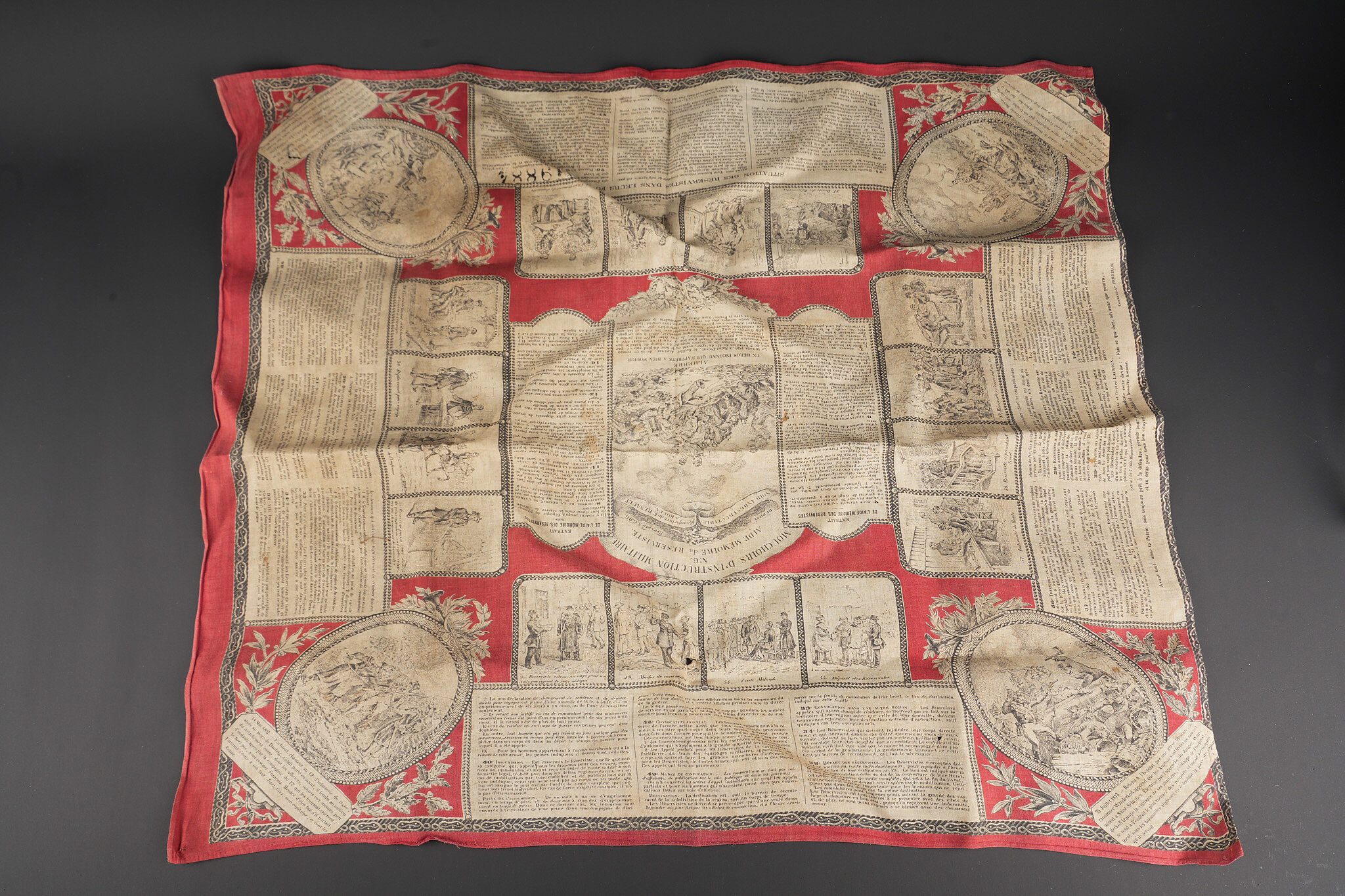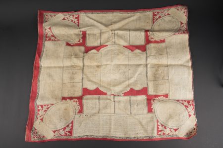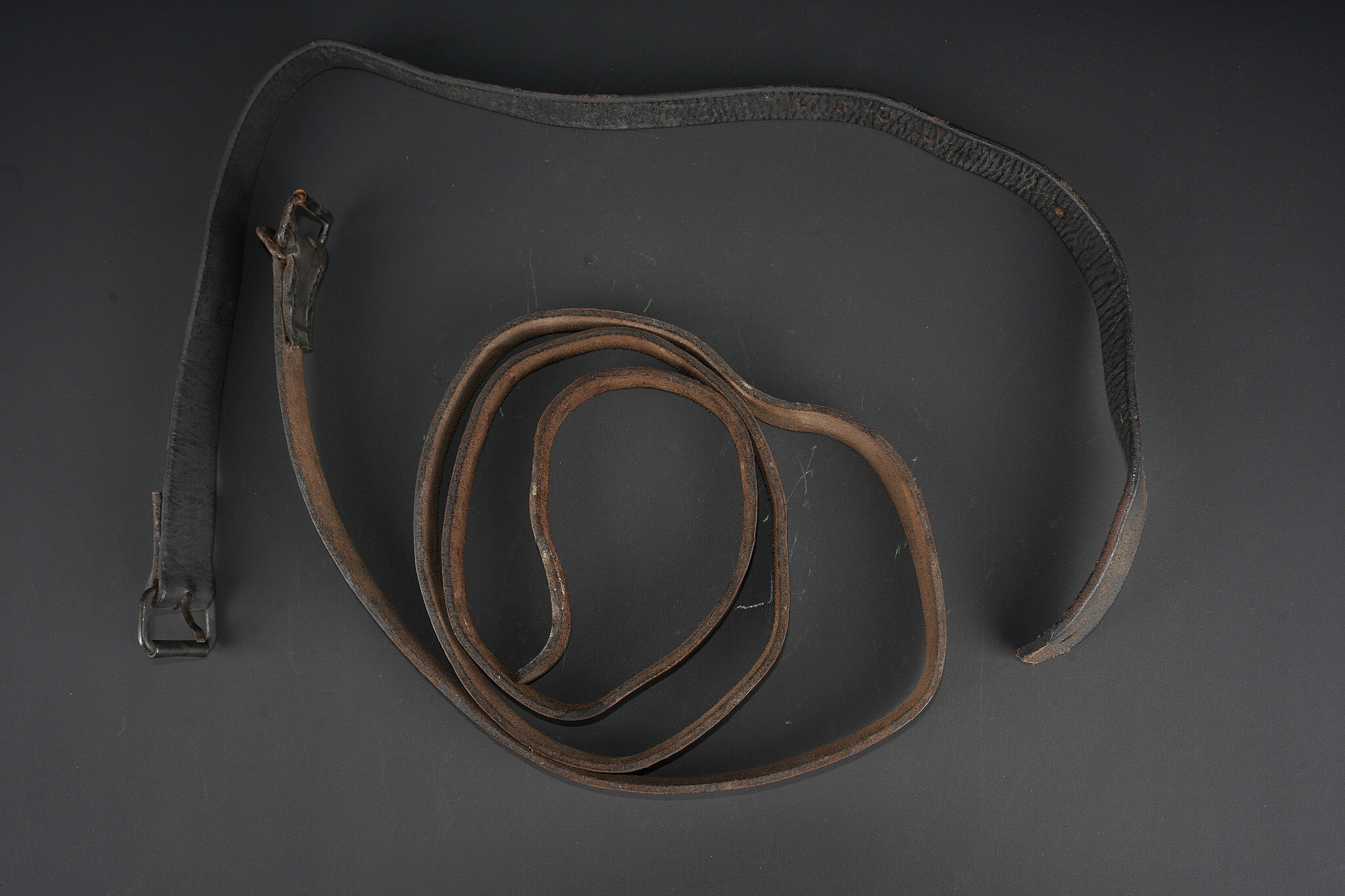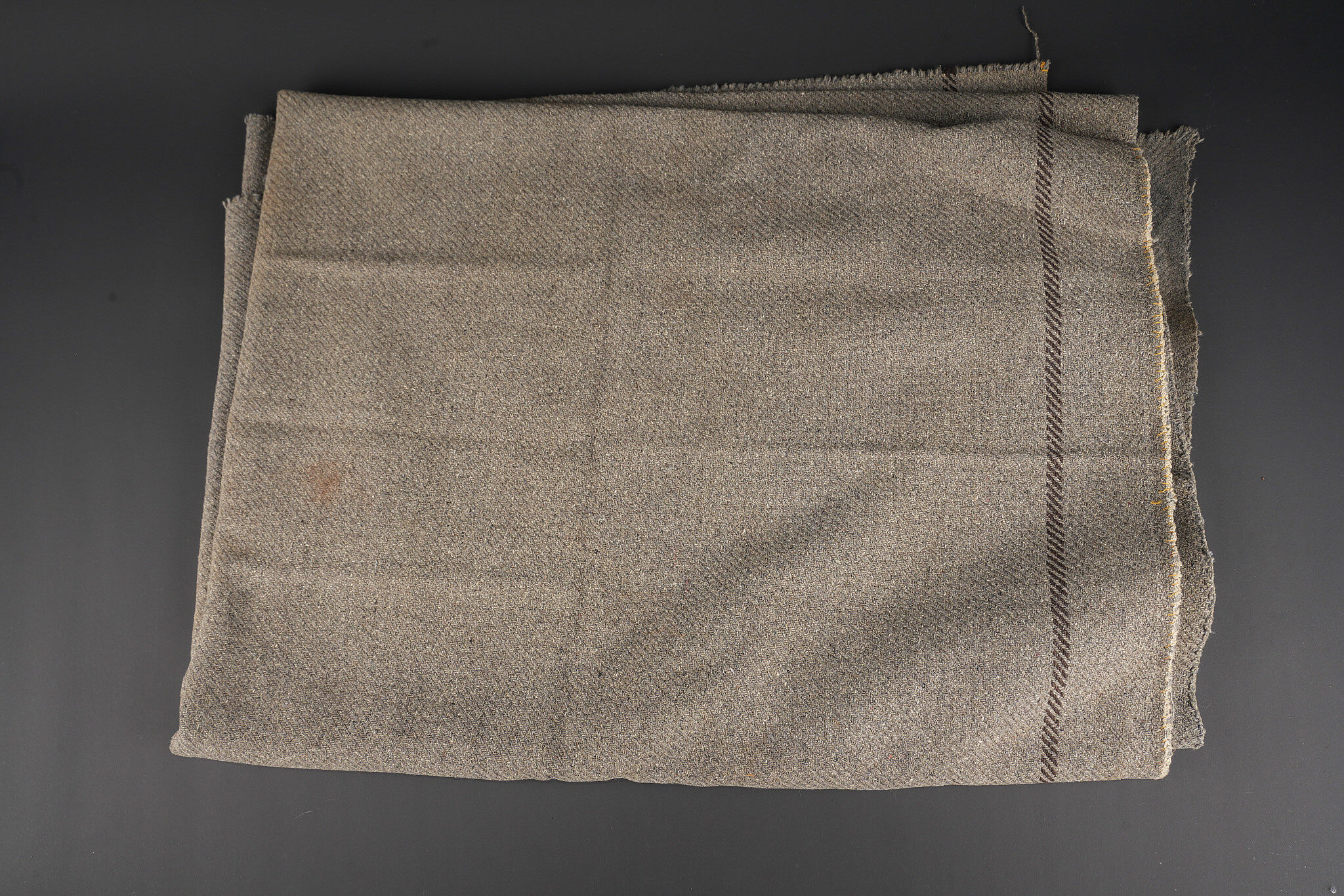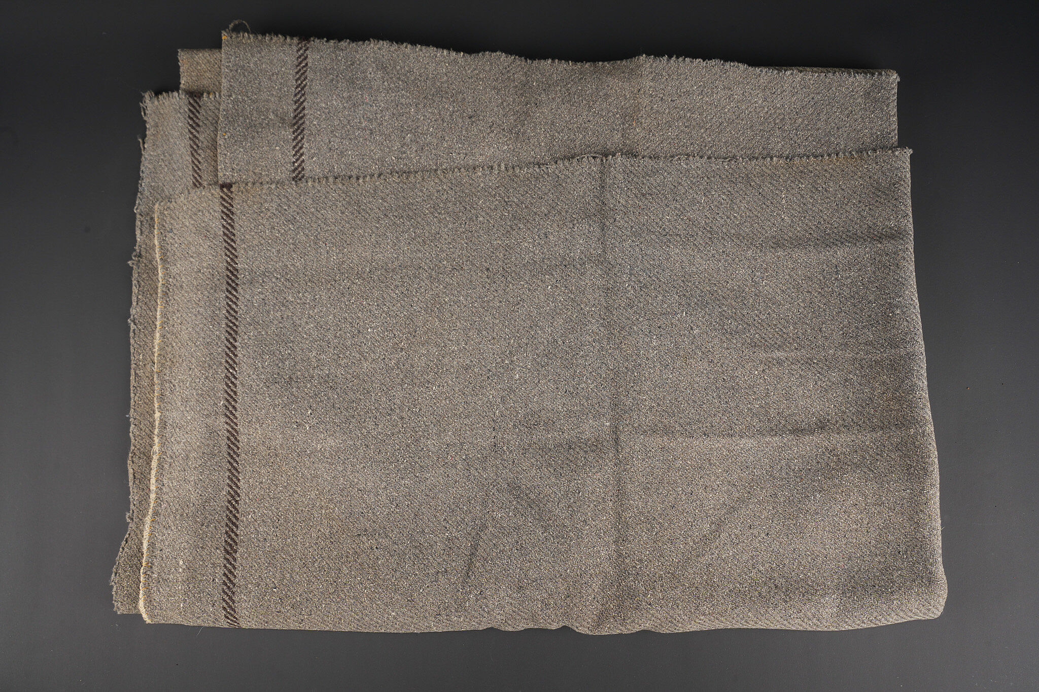 As de carreau noirci 1893. En toile kaki claire noircie, cuir fragilisé et cadre postérieur. Bretelles d’origine ainsi que trois courroies de paquetage, un passant décousu. Une couverture de campement sans marquage apparent (dimensions 130x180cm), tampon présent mais illisible. Une toile de tente modèle 1897 en toile kaki clair possédant ses anneaux d’origine, très bel état. On y joint un mouchoir d’instruction de réserviste numéro 6, matriculé et présentant quelques accrocs. Toile du sac fragile. Blackened model 1893 pack. In light khaki canvas later blackened fragile leather and later frame. Original shoulder straps and three pack straps one loop unstitched. One unmarked camp blanket 130 by 180 centimetres with illegible stamp. One model 1897 shelter half in light khaki canvas with original rings in very good condition. With a reservist instructional handkerchief number 6 named and showing some wear. The pack canvas is fragile.