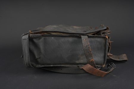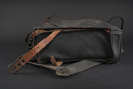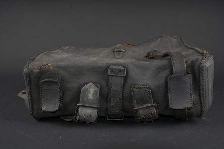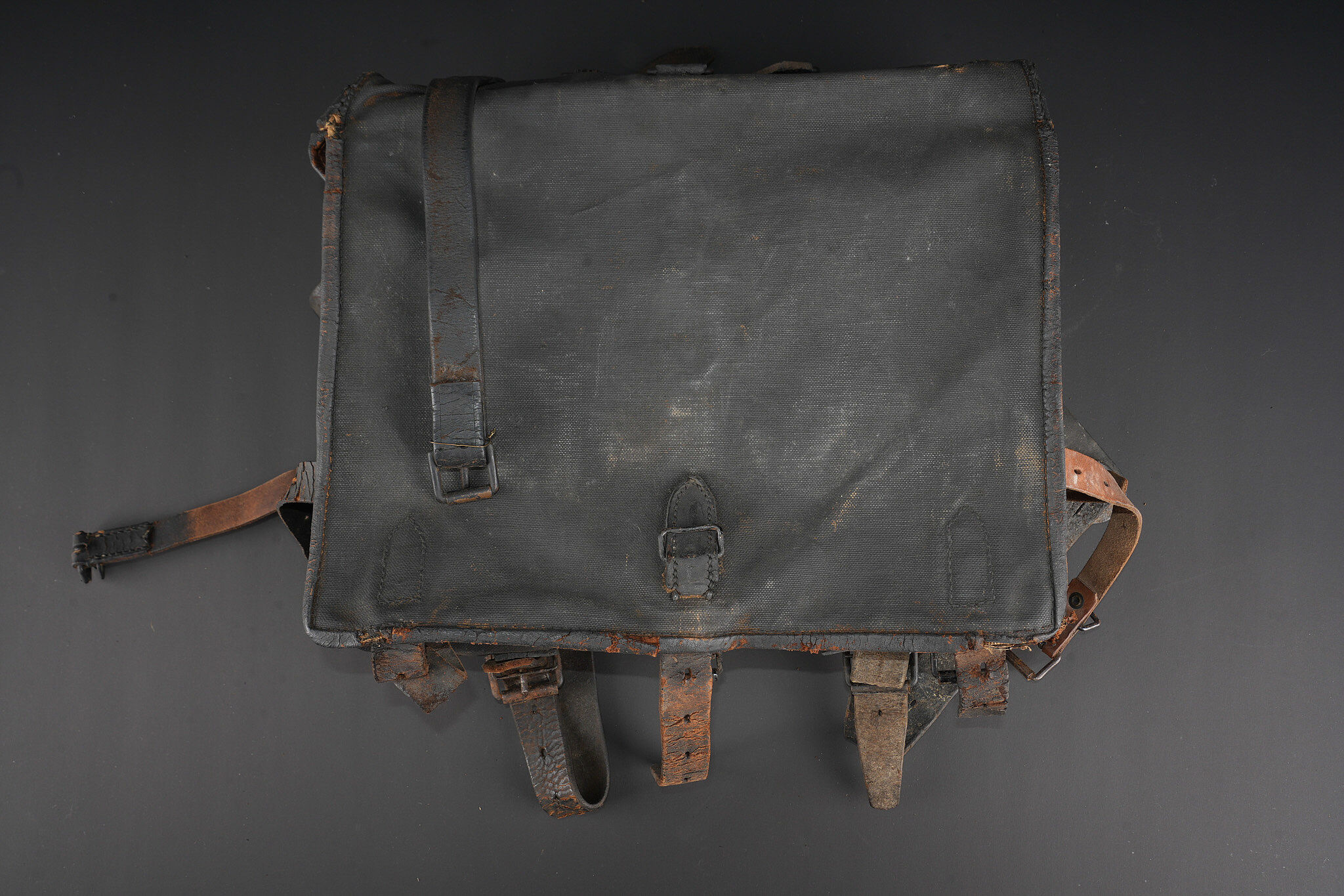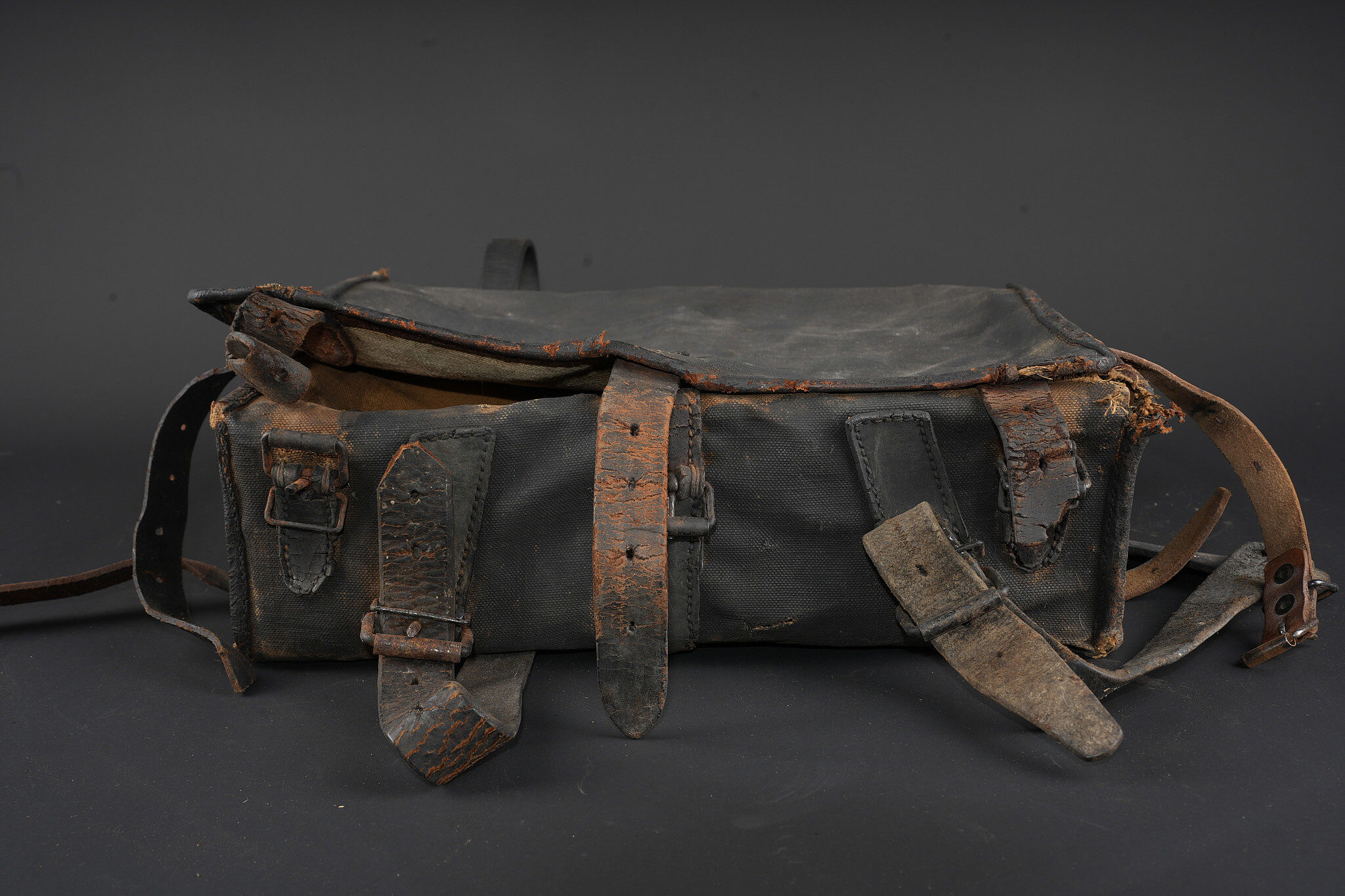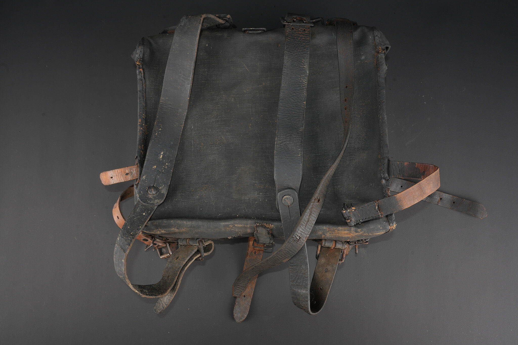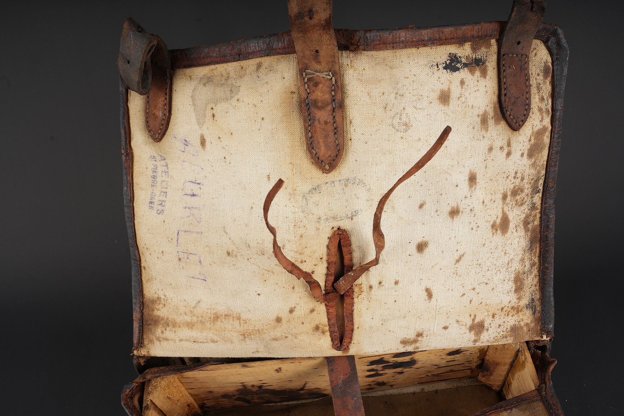 Détails de la vente >As de carreau noirci 1893. En toile kaki claire noircie, cuir fragilisé et cadre postérieur. Bretelles d’origine ainsi que trois courroies de paquetage, un passant décousu. Une couverture... en savoir plus