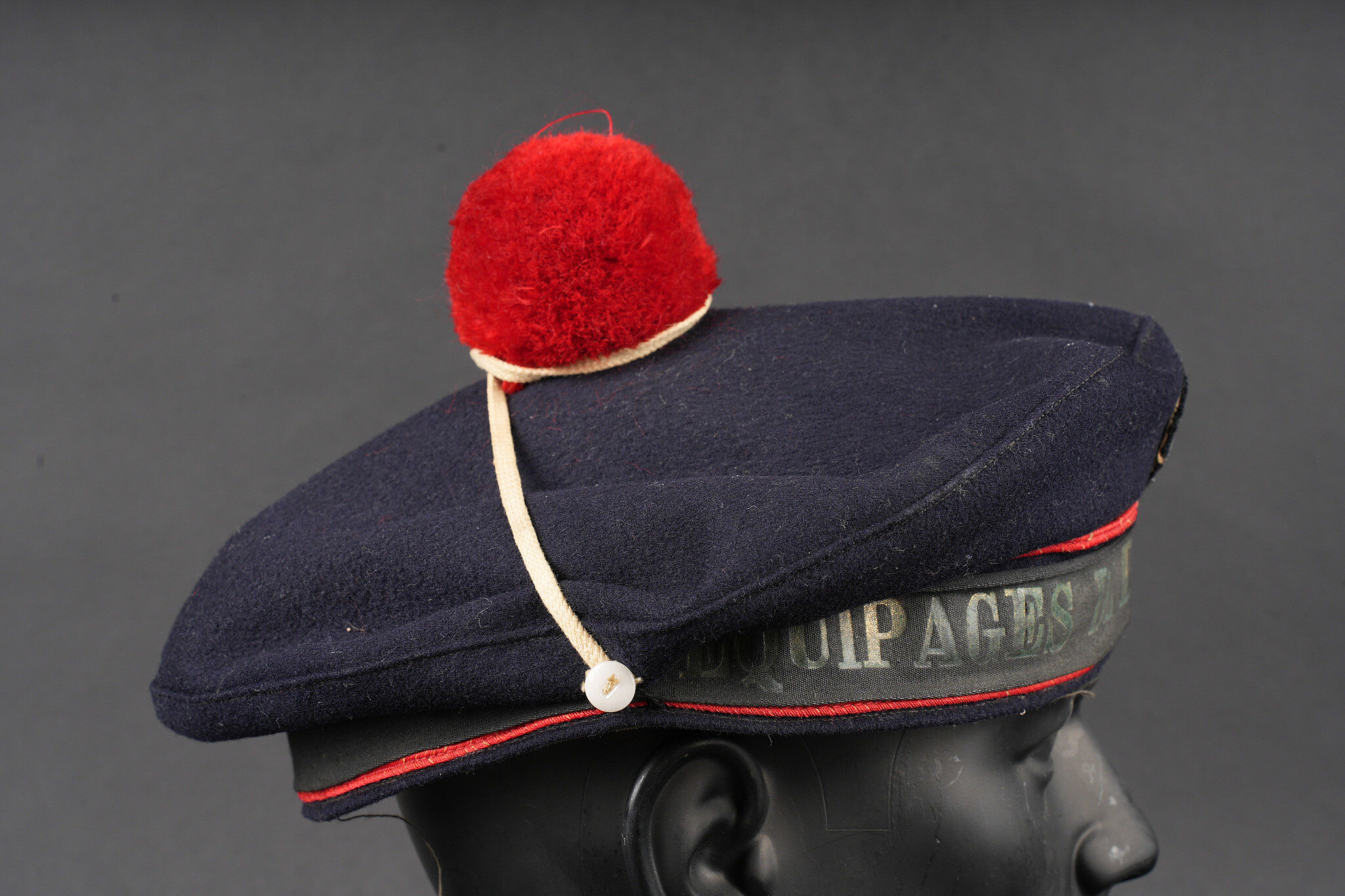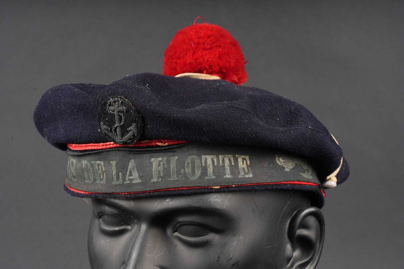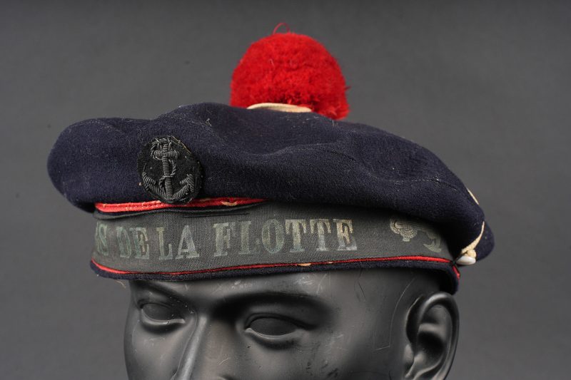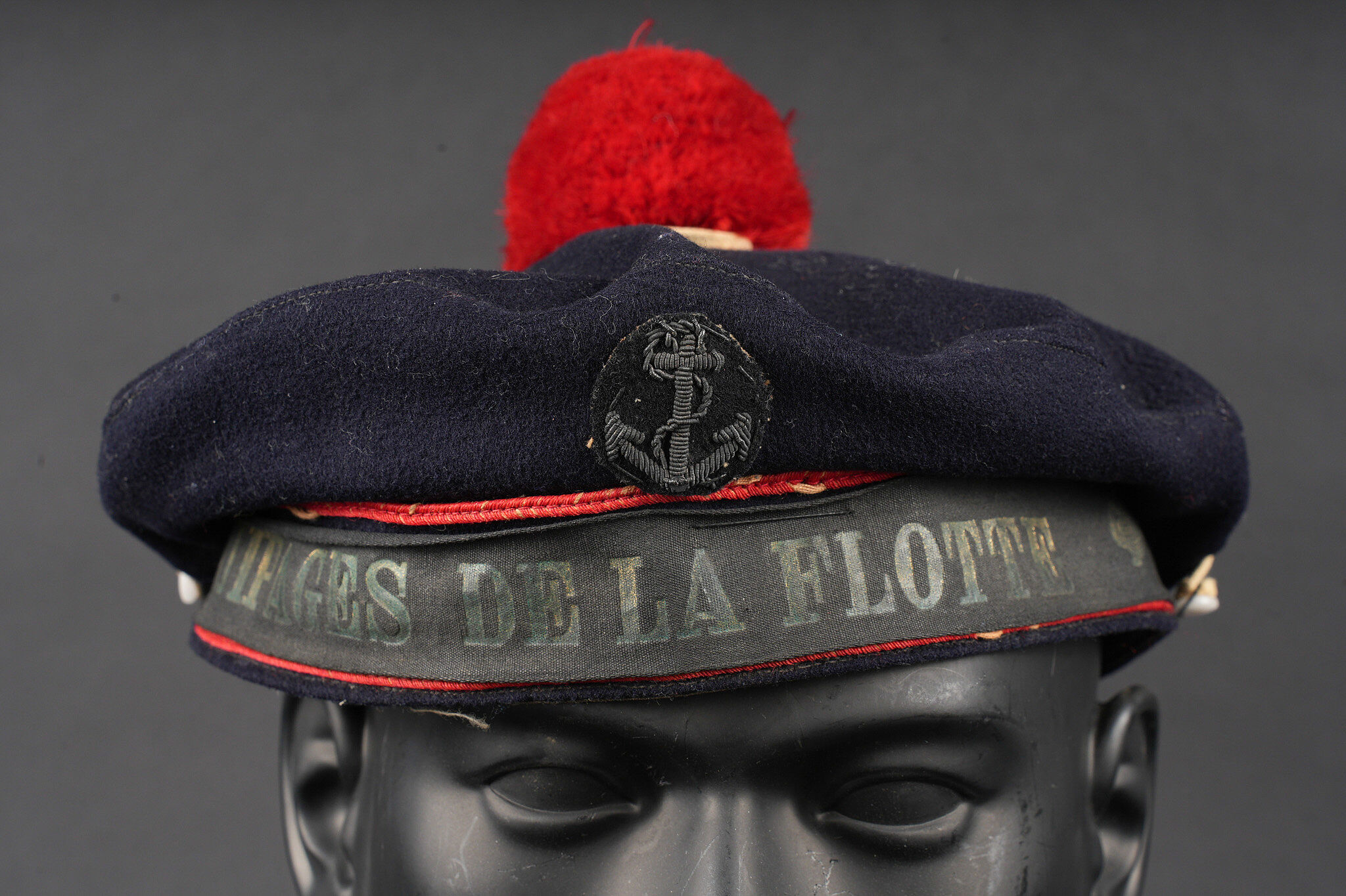 Bachis de marin portant la bande Equipage de la flotte suivi des deux ancres dorées, insigne brodé cannetille cousu à l’avant du bachis , petite jugulaire en coton blanc retenue par deux boutons. Pompon retenu par une vis surmontant une pièce de 1 franc datée 1924. Matricule 6874.I. Sailor’s cap tally. Naval cap bearing the tally Equipage de la Flotte followed by two gilt anchors. Bullion-embroidered insignia sewn to the front of the cap. Small white cotton chinstrap secured by two buttons. Pompon fixed by a screw mounted above a 1-franc coin dated 1924. Marked with service number 6874.I.