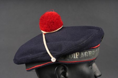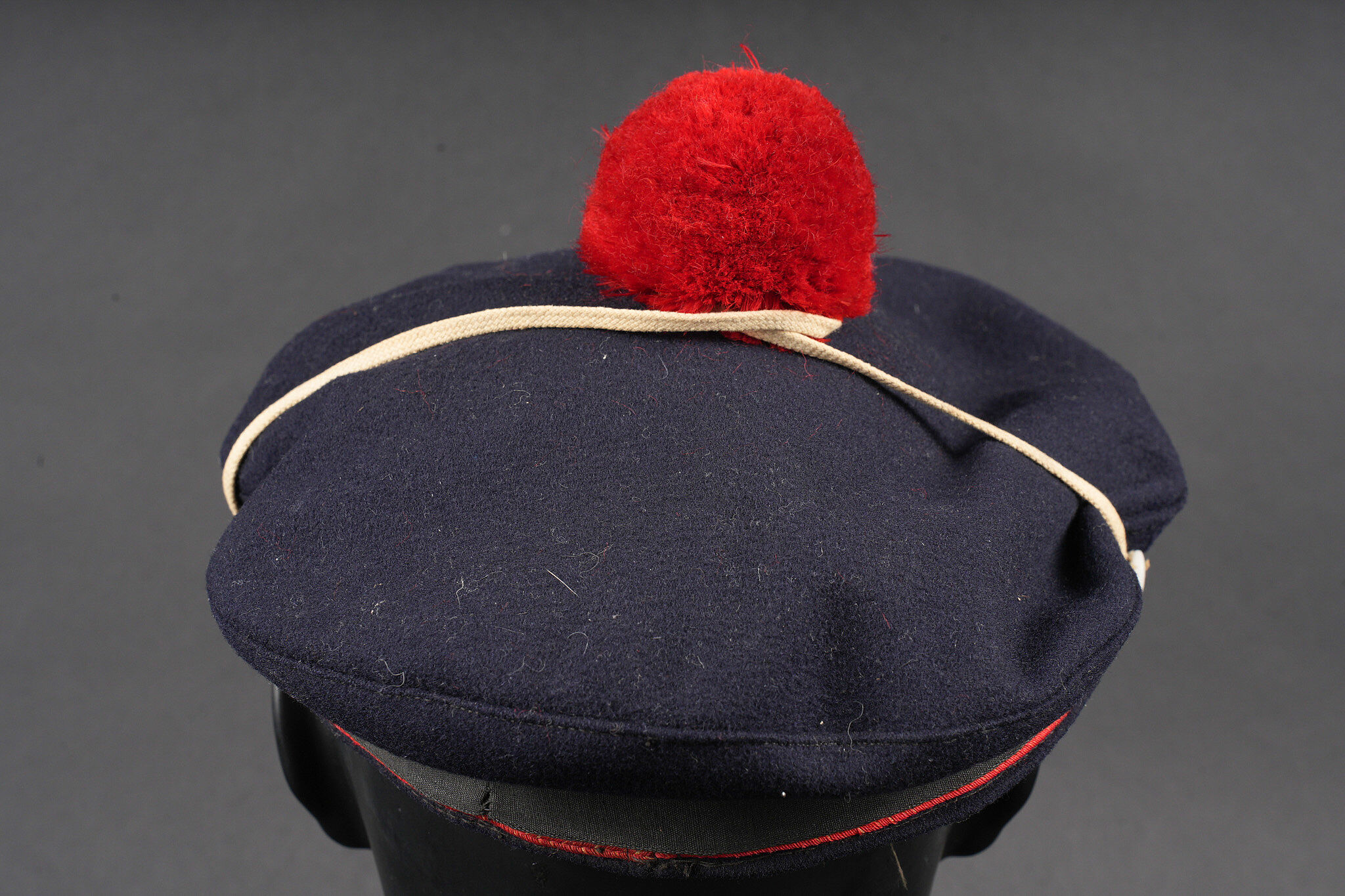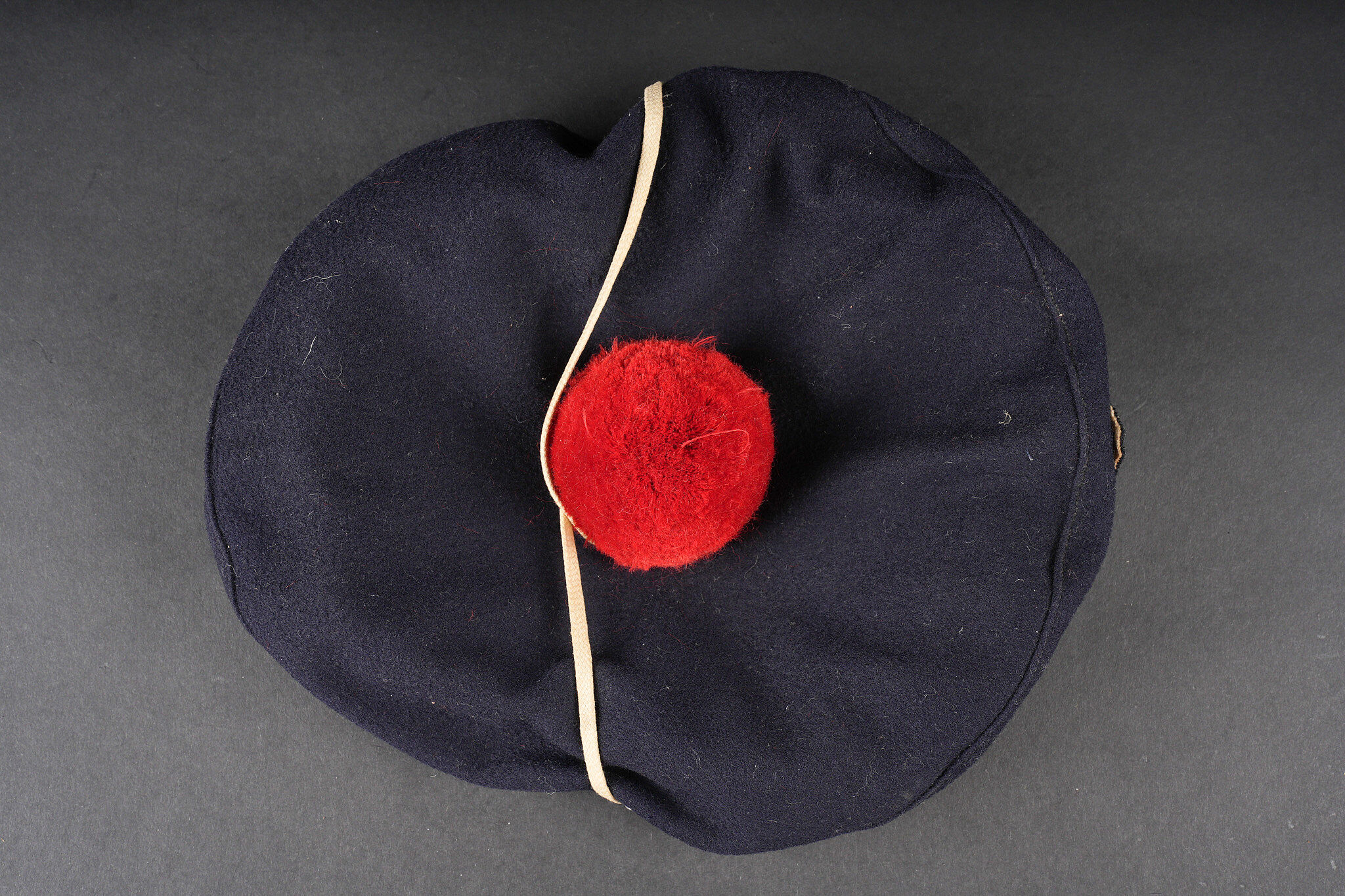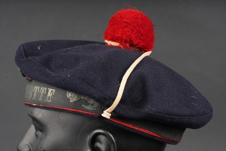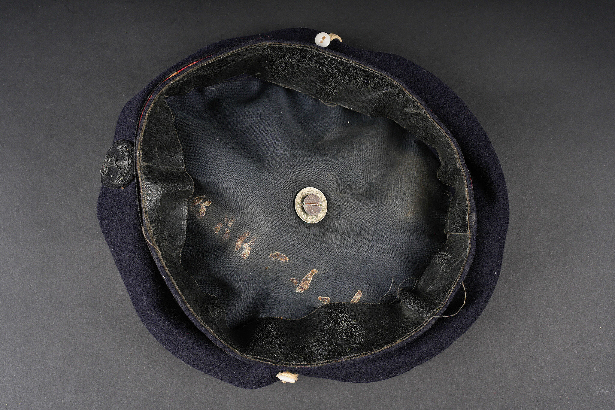 Bachis de marin portant la bande Equipage de la flotte suivi des deux ancres dorées, insigne brodé cannetille cousu à l’avant du bachis , petite jugulaire en coton blanc retenue par deux boutons. Pompon retenu par une vis surmontant une pièce de 1 franc datée 1924. Matricule 6874.I. Sailor’s cap tally. Naval cap bearing the tally Equipage de la Flotte followed by two gilt anchors. Bullion-embroidered insignia sewn to the front of the cap. Small white cotton chinstrap secured by two buttons. Pompon fixed by a screw mounted above a 1-franc coin dated 1924. Marked with service number 6874.I.