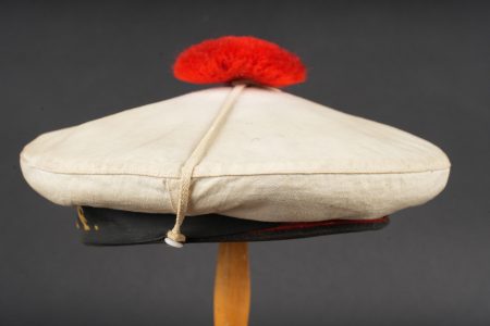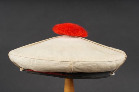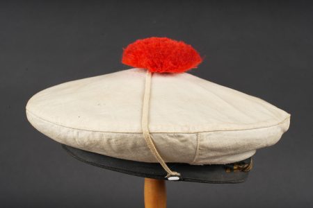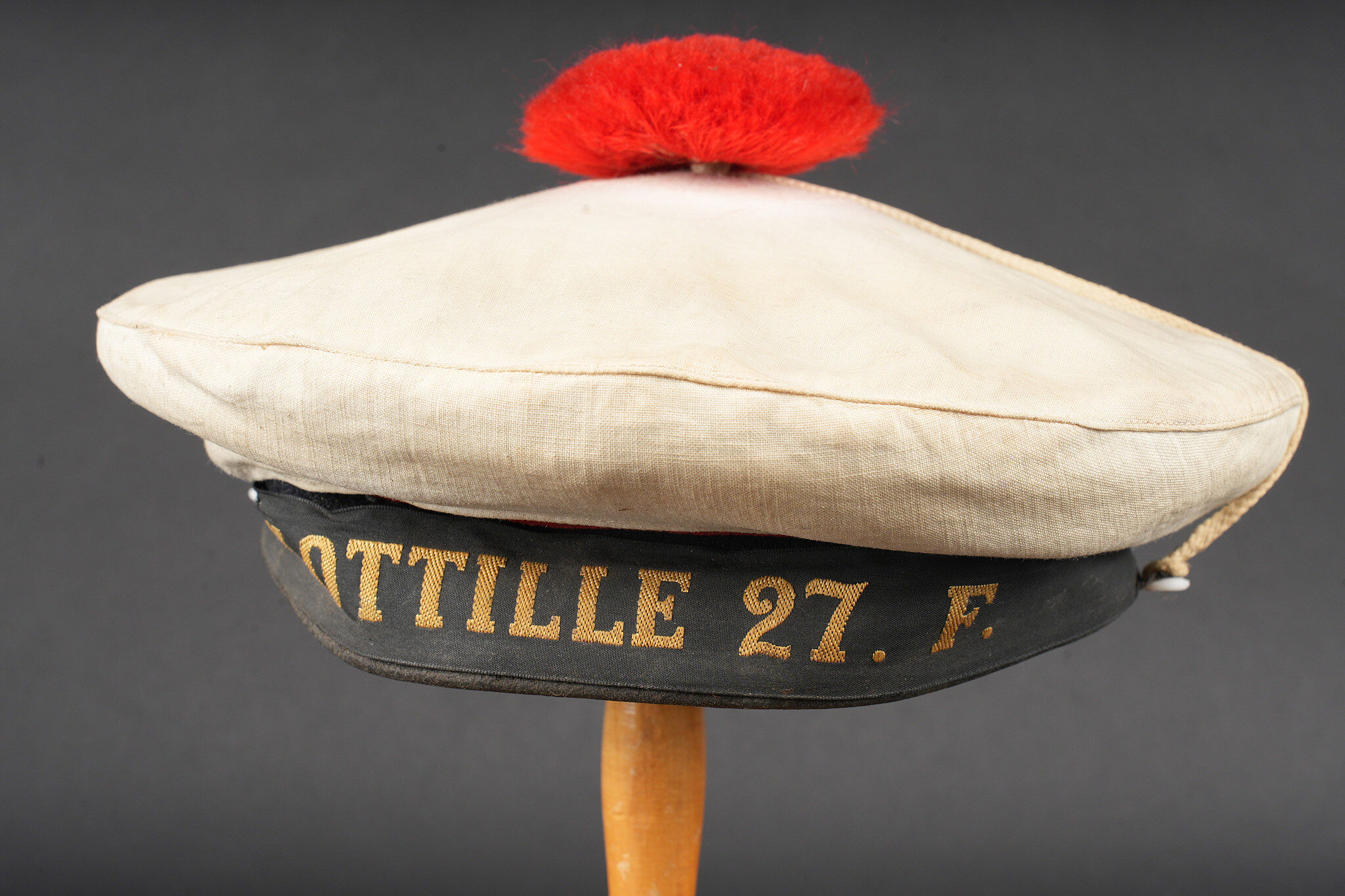 Un bachis de marin des années 1950 de la flottille 27F avec son couvre bachi en toile blanche. 1950s sailor’s cap from 27F Flotilla. Naval sailor’s cap dating from the 1950s, bearing the tally of 27F Flotilla, complete with its white canvas cap cover.