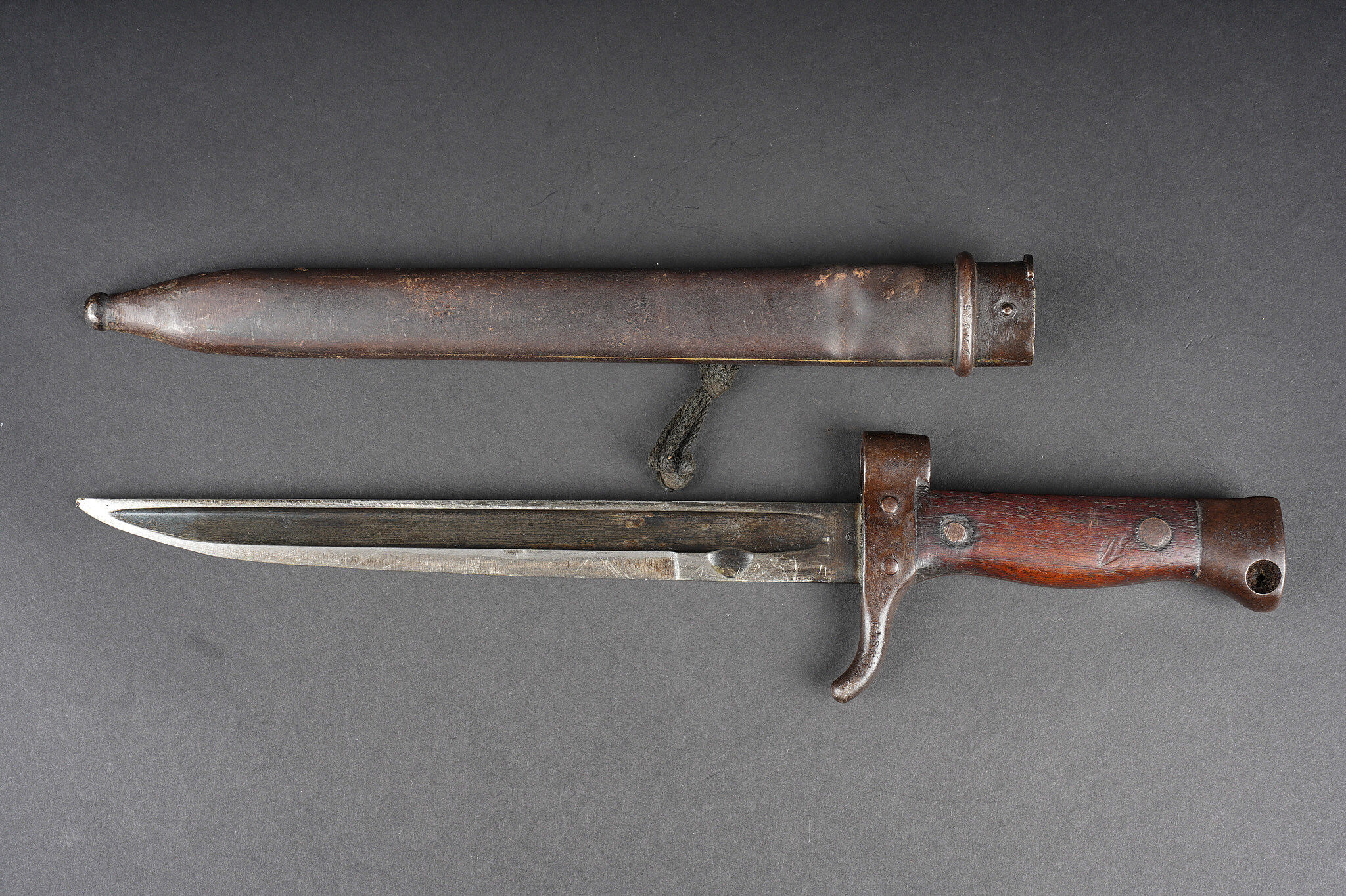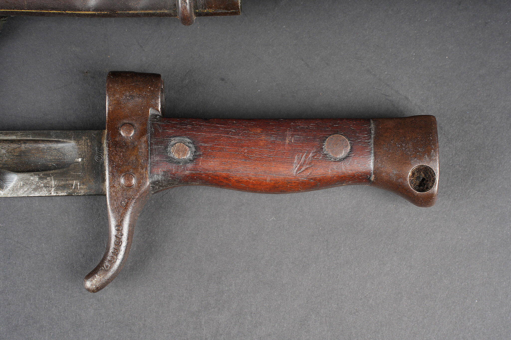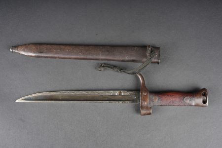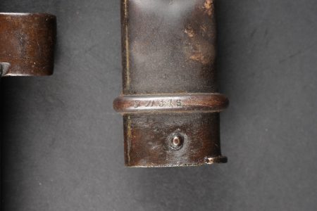 Baïonnette Berthier raccourcie. Quillon raccourci, plaquettes en bois, bouton poussoir supprimé, fourreau raccourci présentant quelques bosses et pas au même numéro. Lame possédant encore une partie de son bronzage, longueur totale 38,5cm. Shortened Berthier bayonet. Shortened quillon wooden grips push button removed shortened scabbard with several dents and mismatched number. Blade retaining part of its original bluing overall length 38.5 centimetres.