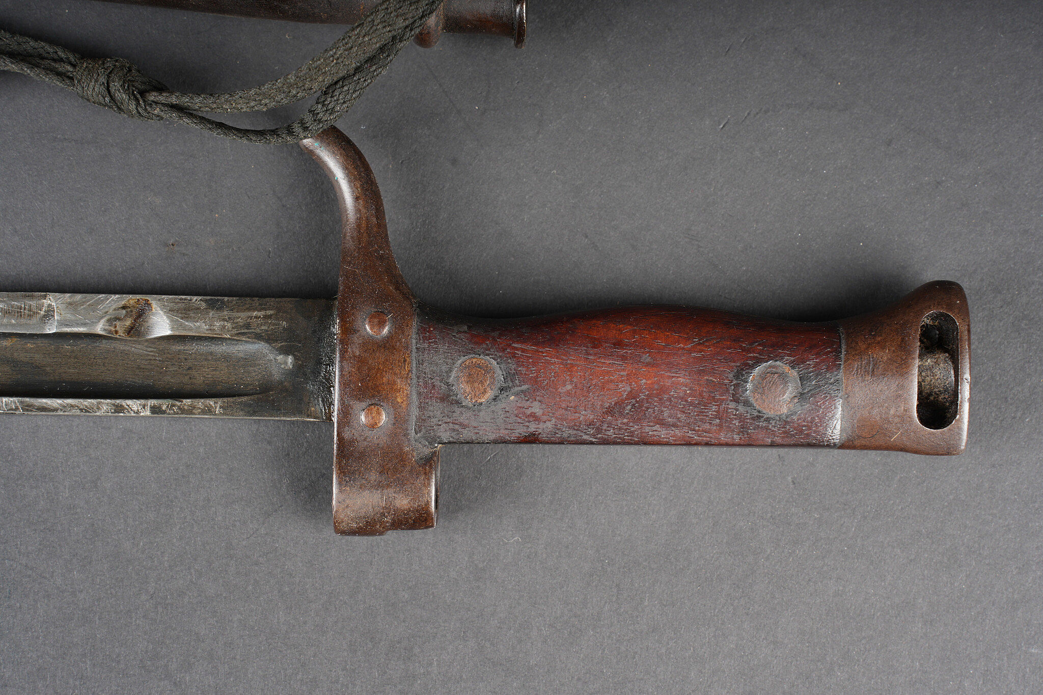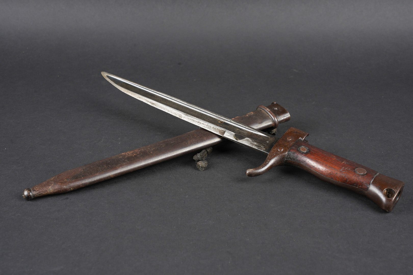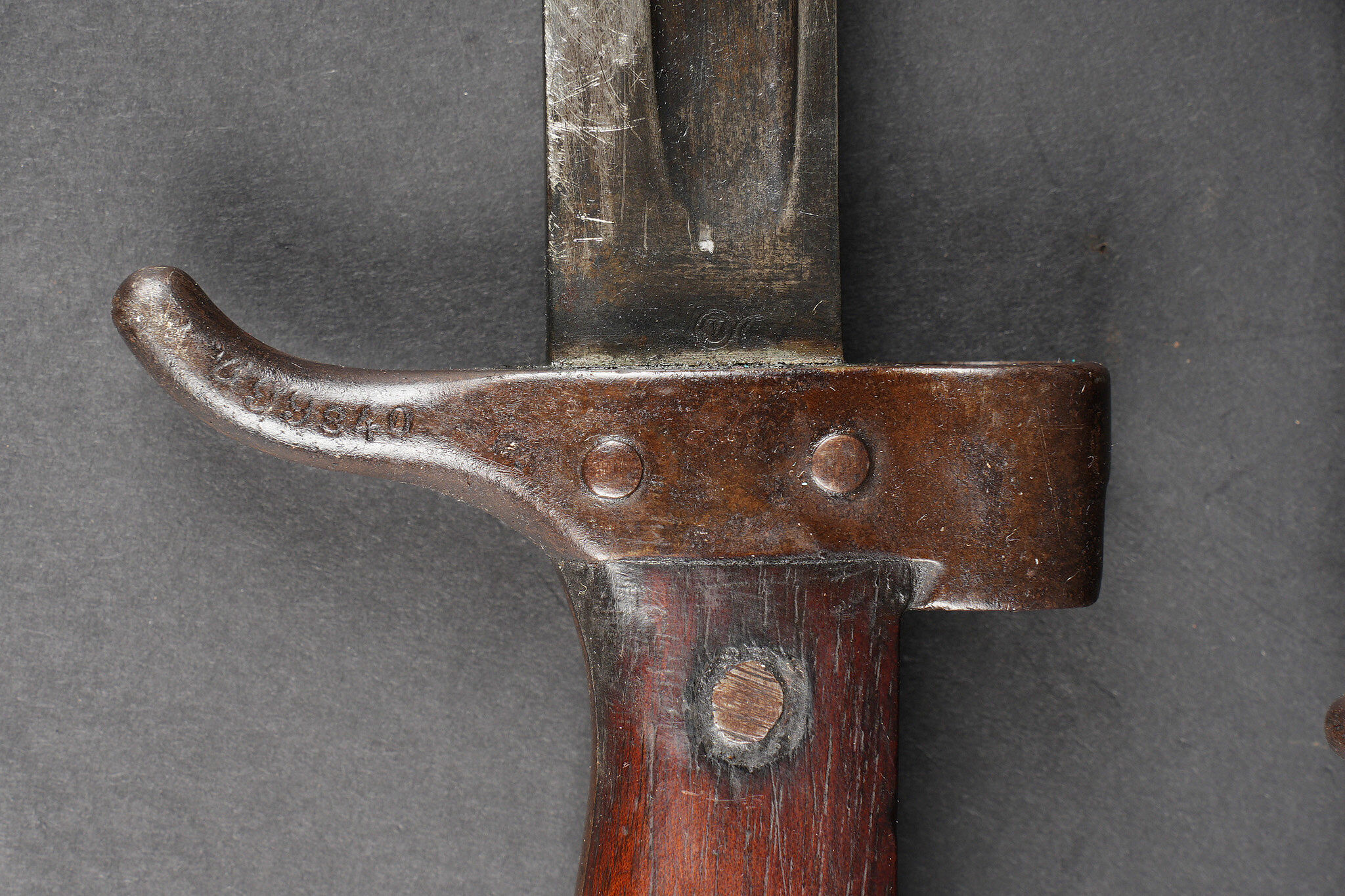 Baïonnette Berthier raccourcie. Quillon raccourci, plaquettes en bois, bouton poussoir supprimé, fourreau raccourci présentant quelques bosses et pas au même numéro. Lame possédant encore une partie de son bronzage, longueur totale 38,5cm. Shortened Berthier bayonet. Shortened quillon wooden grips push button removed shortened scabbard with several dents and mismatched number. Blade retaining part of its original bluing overall length 38.5 centimetres.