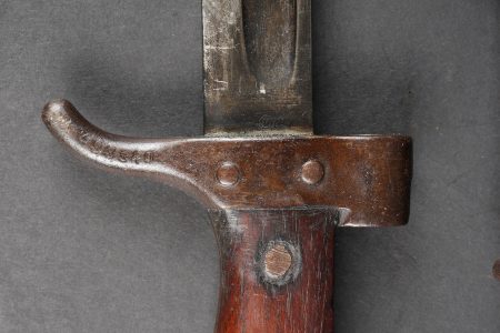 Baïonnette Berthier raccourcie. Quillon raccourci, plaquettes en bois, bouton poussoir supprimé, fourreau raccourci présentant quelques bosses et pas au même numéro. Lame possédant encore... en savoir plus