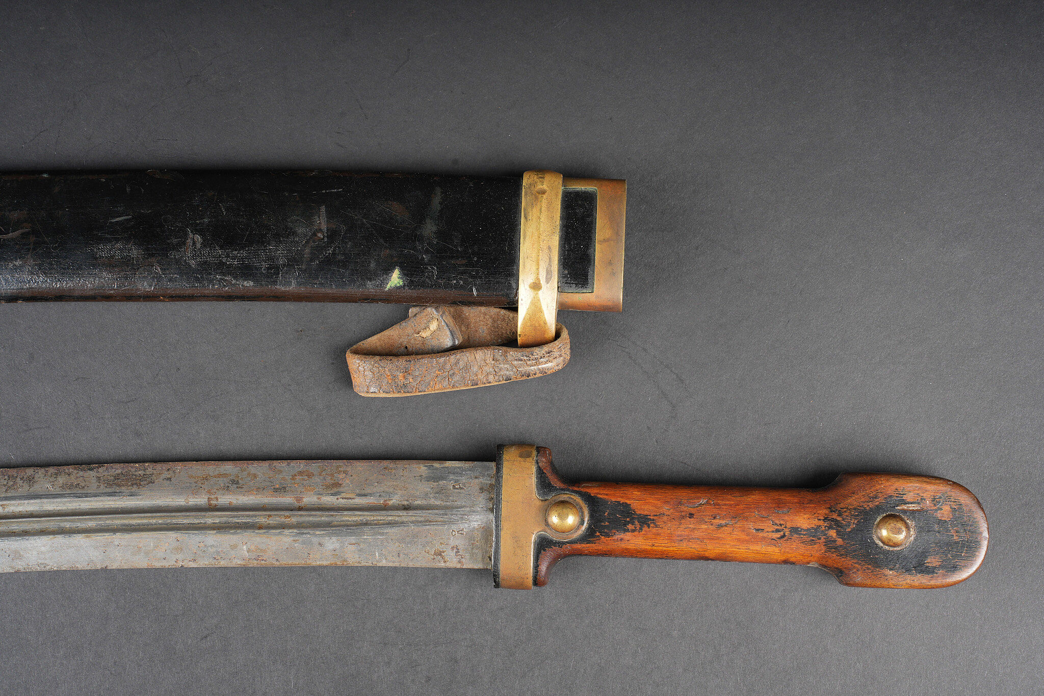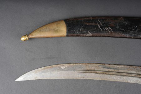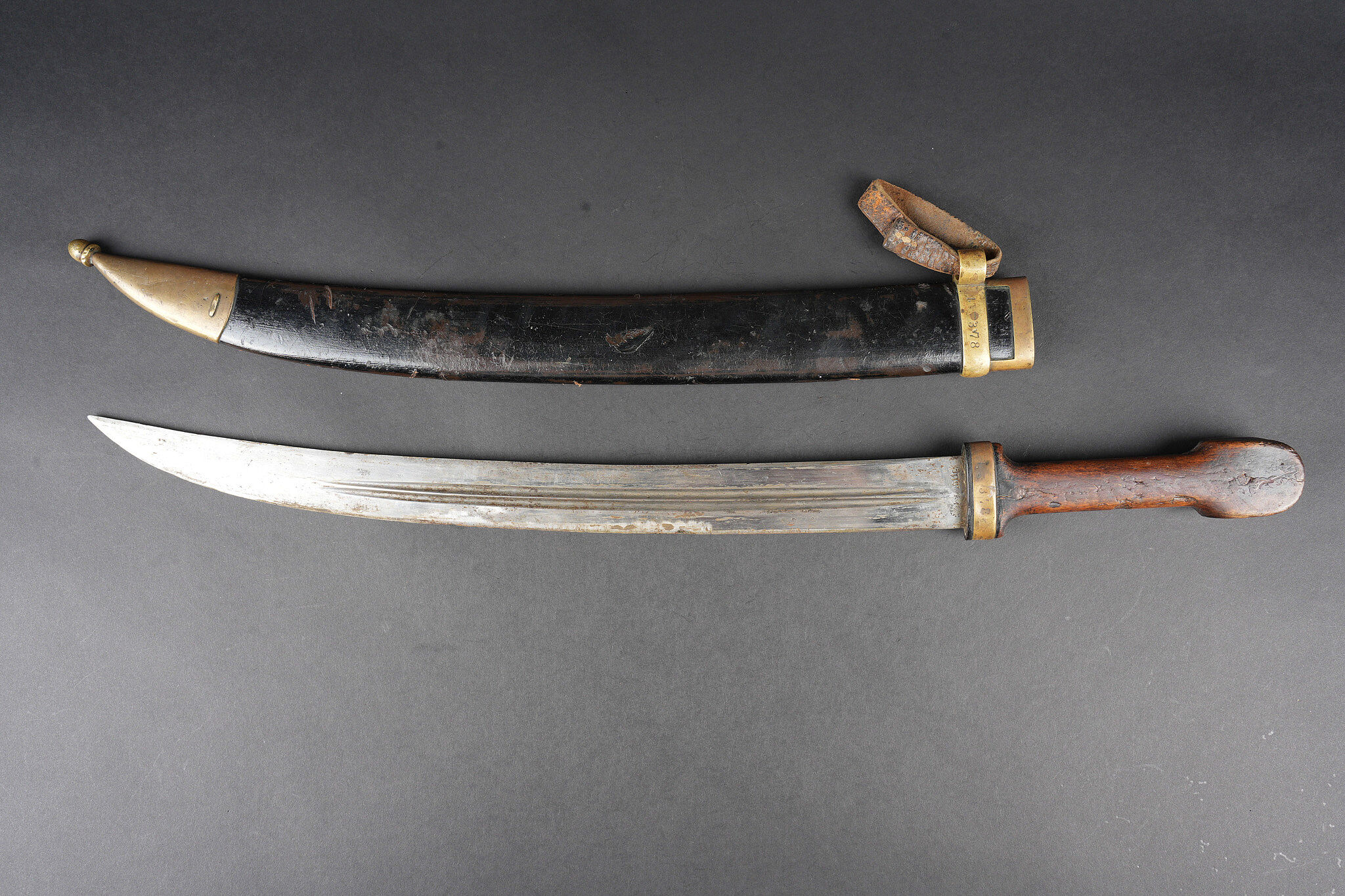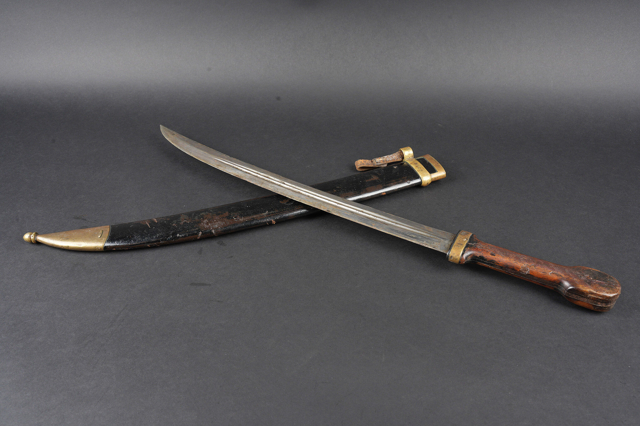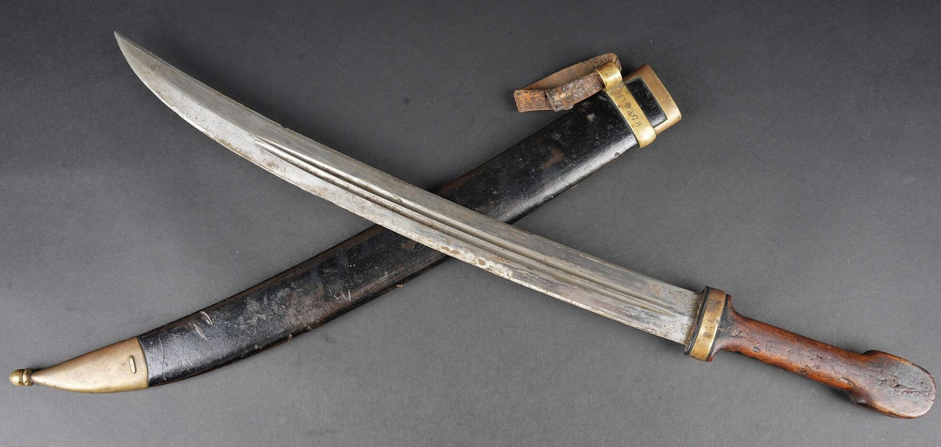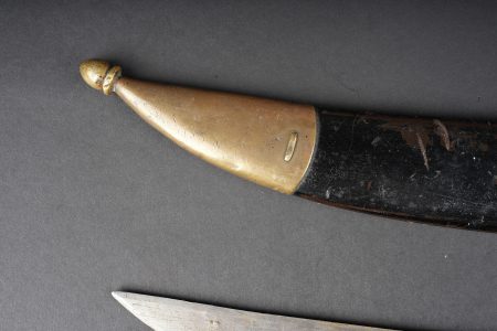 Bebou 1909 artillerie. Beau bebou d’artillerie russe modèle 1909, la lame est dans sa longueur d’origine et possède le poinçon à l’aigle bicéphale ainsi que l’année 1911. Sur l’autre face on trouve un poinçon surmonté d’une couronne. Poignée composée de deux plaquettes en bois maintenues par deux rivets en laiton, la garde en laiton porte le numéro 378. Fourreau réglementaire avec garnitures en laiton et portant également le numéro 378, petit passant de ceinturon en cuir. Arme en bon état et peu courante. Selon les informations du vendeur, cette pièce proviendrait de La Courtine, camp occupait par les soldats russes à partir de 1917, près de 20.000 hommes y auraient séjourné. Russian artillery bebou model 1909. Blade in original length with double-headed eagle proof and the date 1911, the reverse bears a crowned stamp. Grip with two wooden scales secured by brass rivets, brass guard numbered 378. Regulation scabbard with brass mounts also numbered 378 and small leather belt loop. Scarce example in good condition. Reportedly from La Courtine Russian camp occupied from 1917.