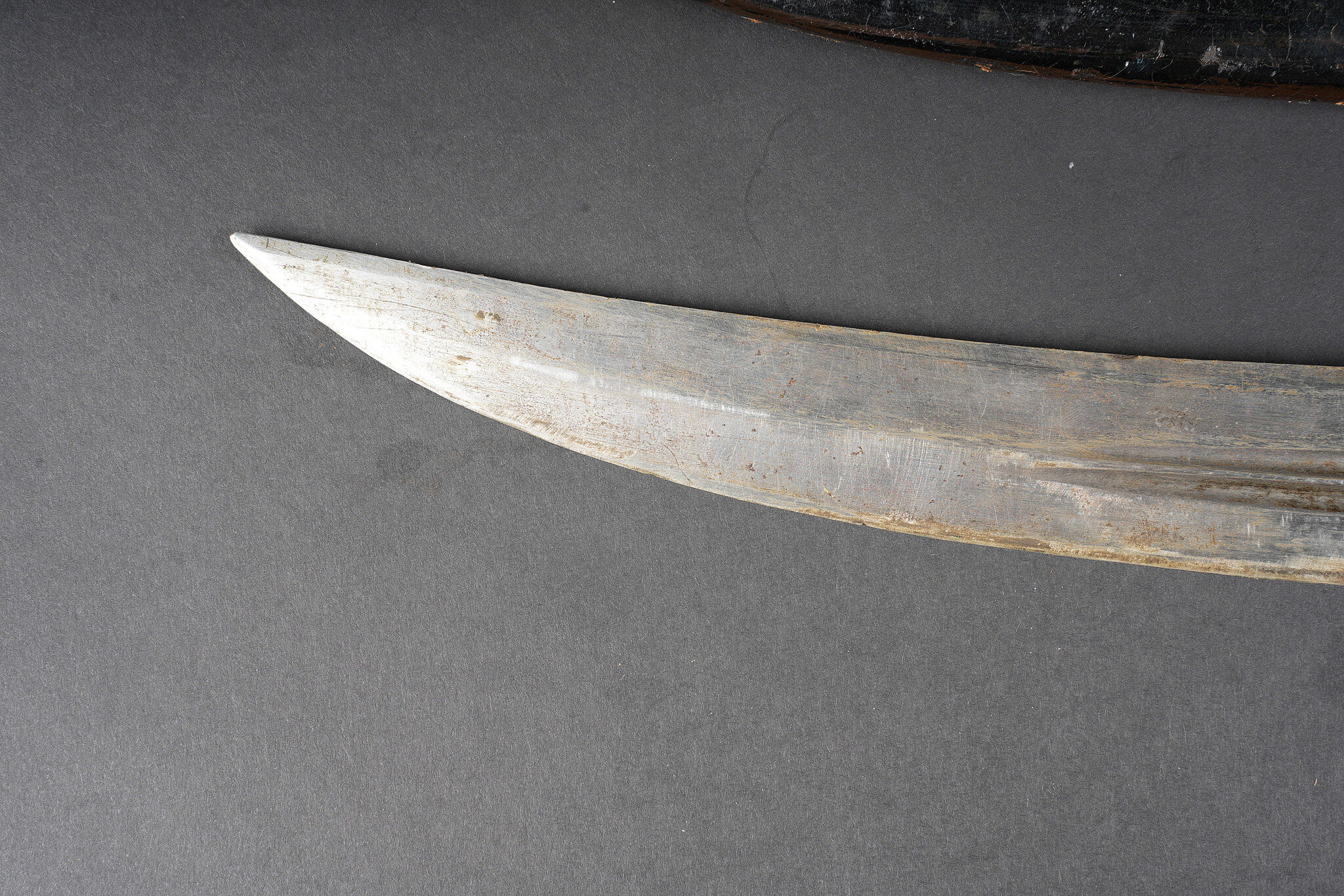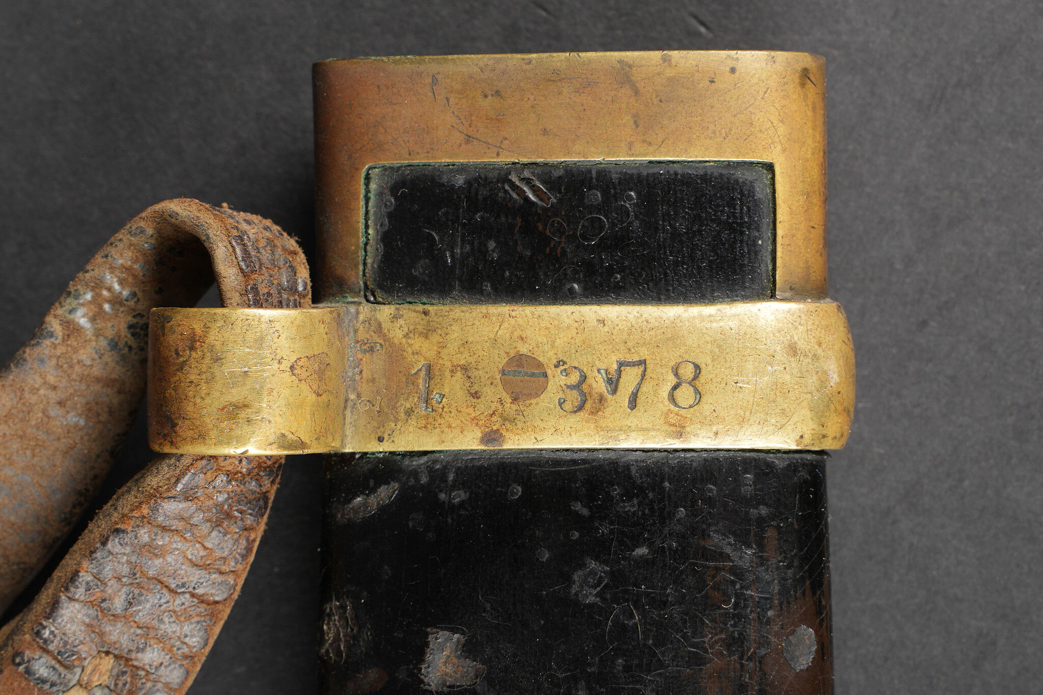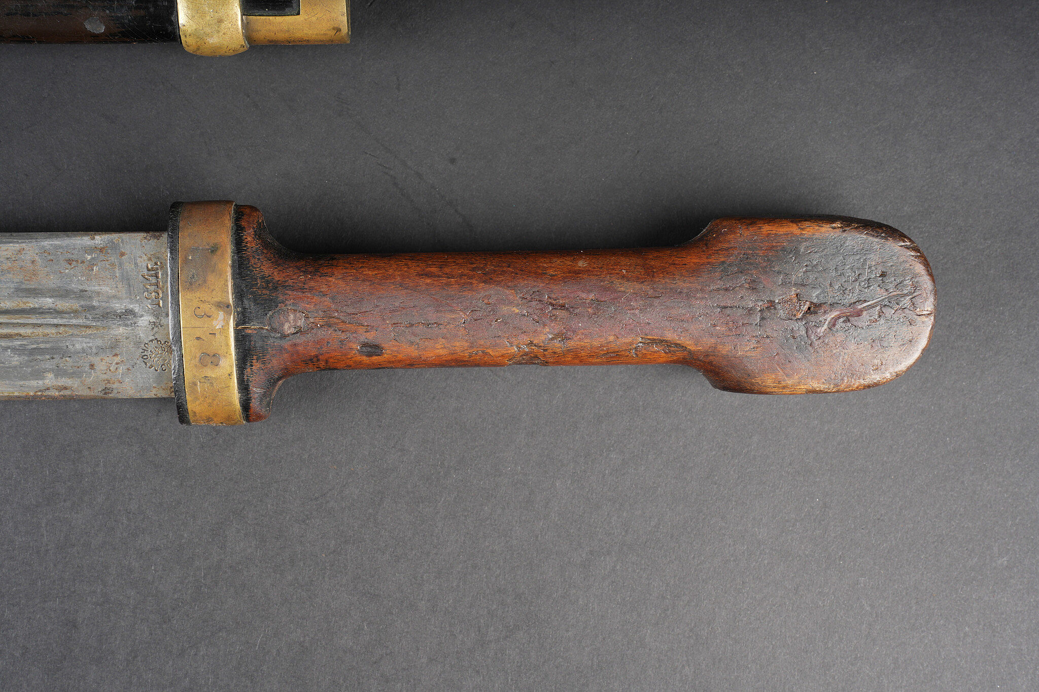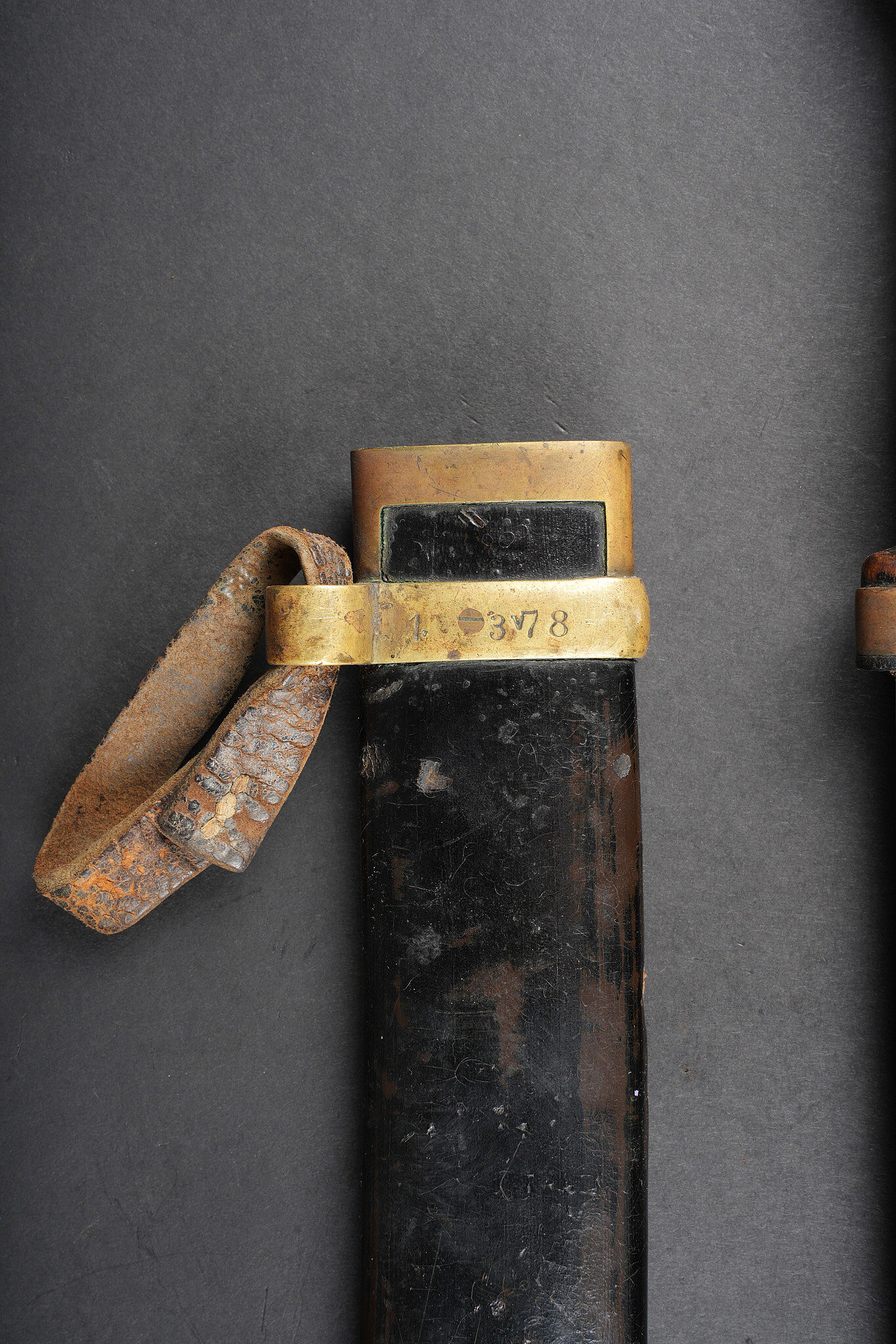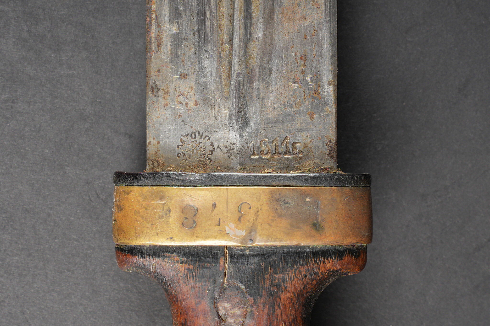 Bebou 1909 artillerie. Beau bebou d’artillerie russe modèle 1909, la lame est dans sa longueur d’origine et possède le poinçon à l’aigle bicéphale ainsi que l’année 1911. Sur l’autre face on trouve un poinçon surmonté d’une couronne. Poignée composée de deux plaquettes en bois maintenues par deux rivets en laiton, la garde en laiton porte le numéro 378. Fourreau réglementaire avec garnitures en laiton et portant également le numéro 378, petit passant de ceinturon en cuir. Arme en bon état et peu courante. Selon les informations du vendeur, cette pièce proviendrait de La Courtine, camp occupait par les soldats russes à partir de 1917, près de 20.000 hommes y auraient séjourné. Russian artillery bebou model 1909. Blade in original length with double-headed eagle proof and the date 1911, the reverse bears a crowned stamp. Grip with two wooden scales secured by brass rivets, brass guard numbered 378. Regulation scabbard with brass mounts also numbered 378 and small leather belt loop. Scarce example in good condition. Reportedly from La Courtine Russian camp occupied from 1917.