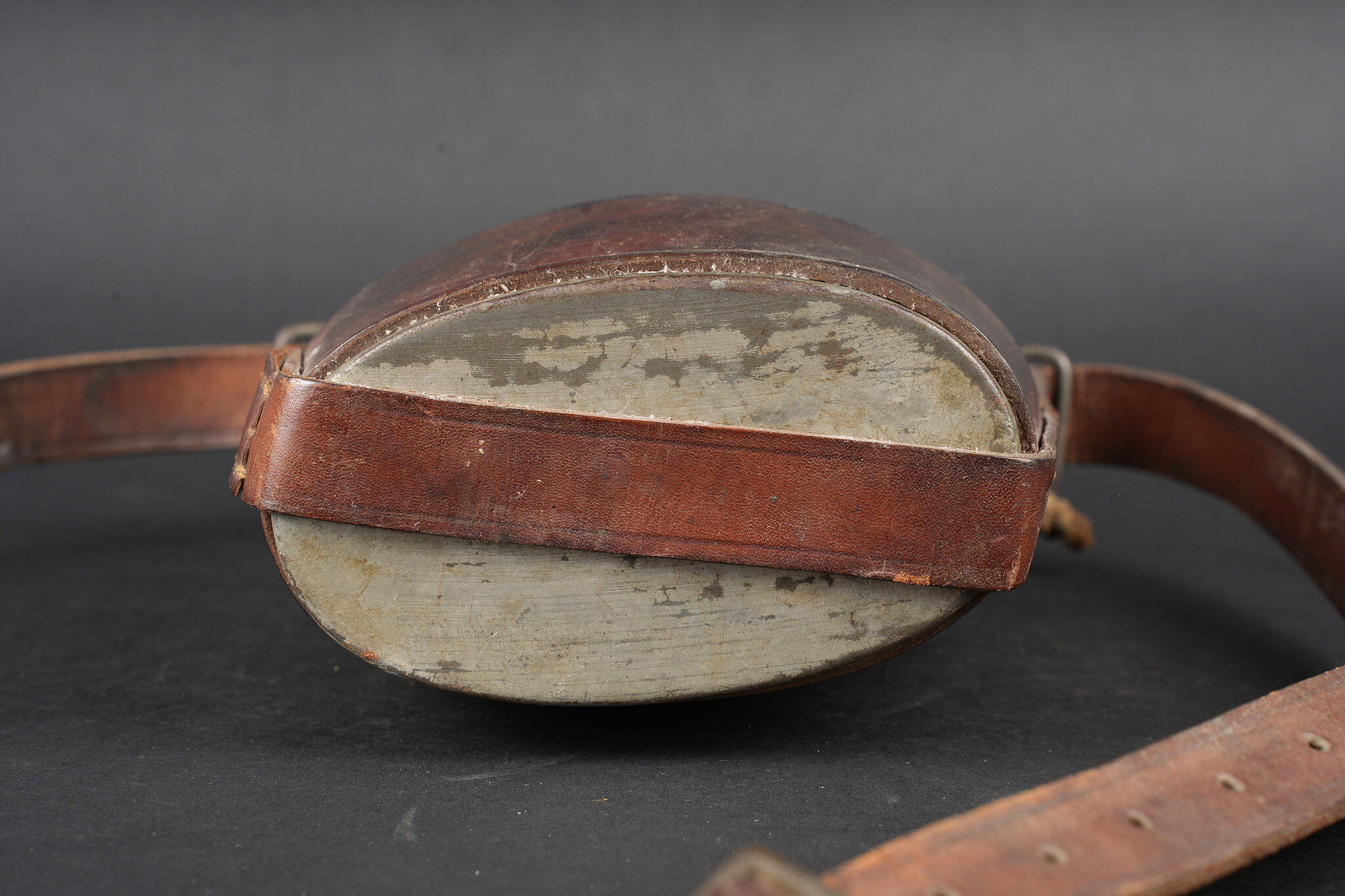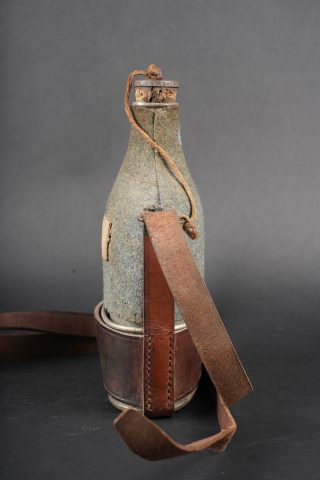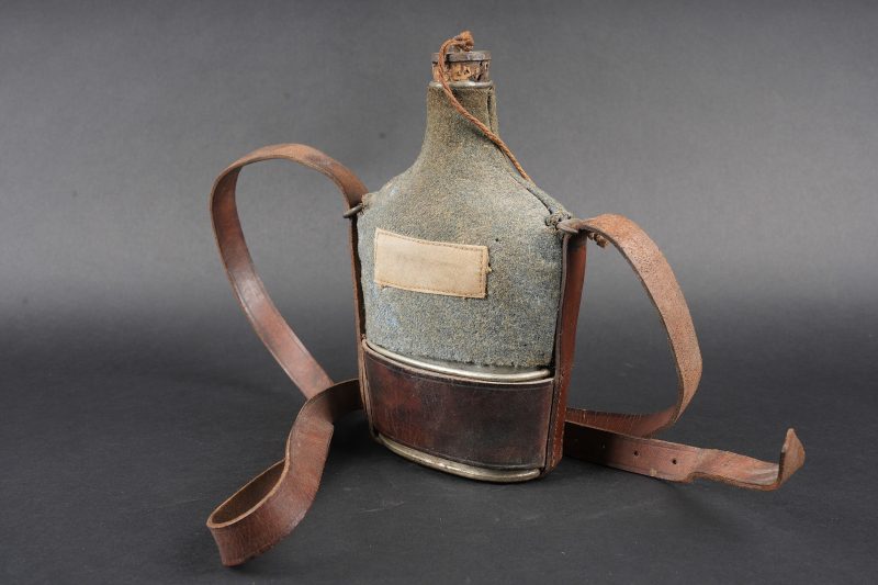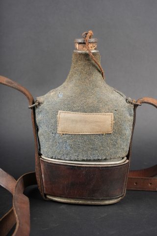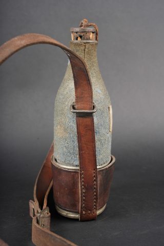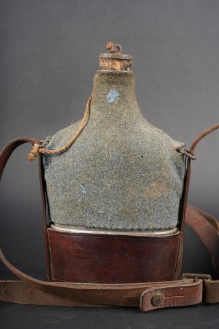 Bidon de cavalerie 1884. En fer étamé, quart d’origine recouvert de sa gaine en cuir. La partie supérieure de la gourde est recouverte d’un tissu bleu horizon et porte une petite étiquette en coton. Courroie de transport en cuir fauve. Cavalry water bottle model 1884. Tinned steel body with original drinking cup covered by its leather case. Upper part covered in horizon blue cloth with a small cotton label. Fawn leather carrying strap.