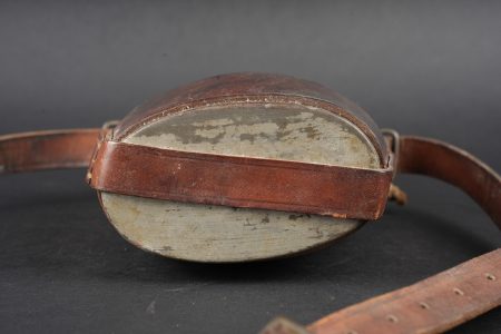Détails de la vente >Bidon de cavalerie 1884. En fer étamé, quart d’origine recouvert de sa gaine en cuir. La partie supérieure de la gourde est recouverte d’un tissu bleu horizon et porte une petite... en savoir plus