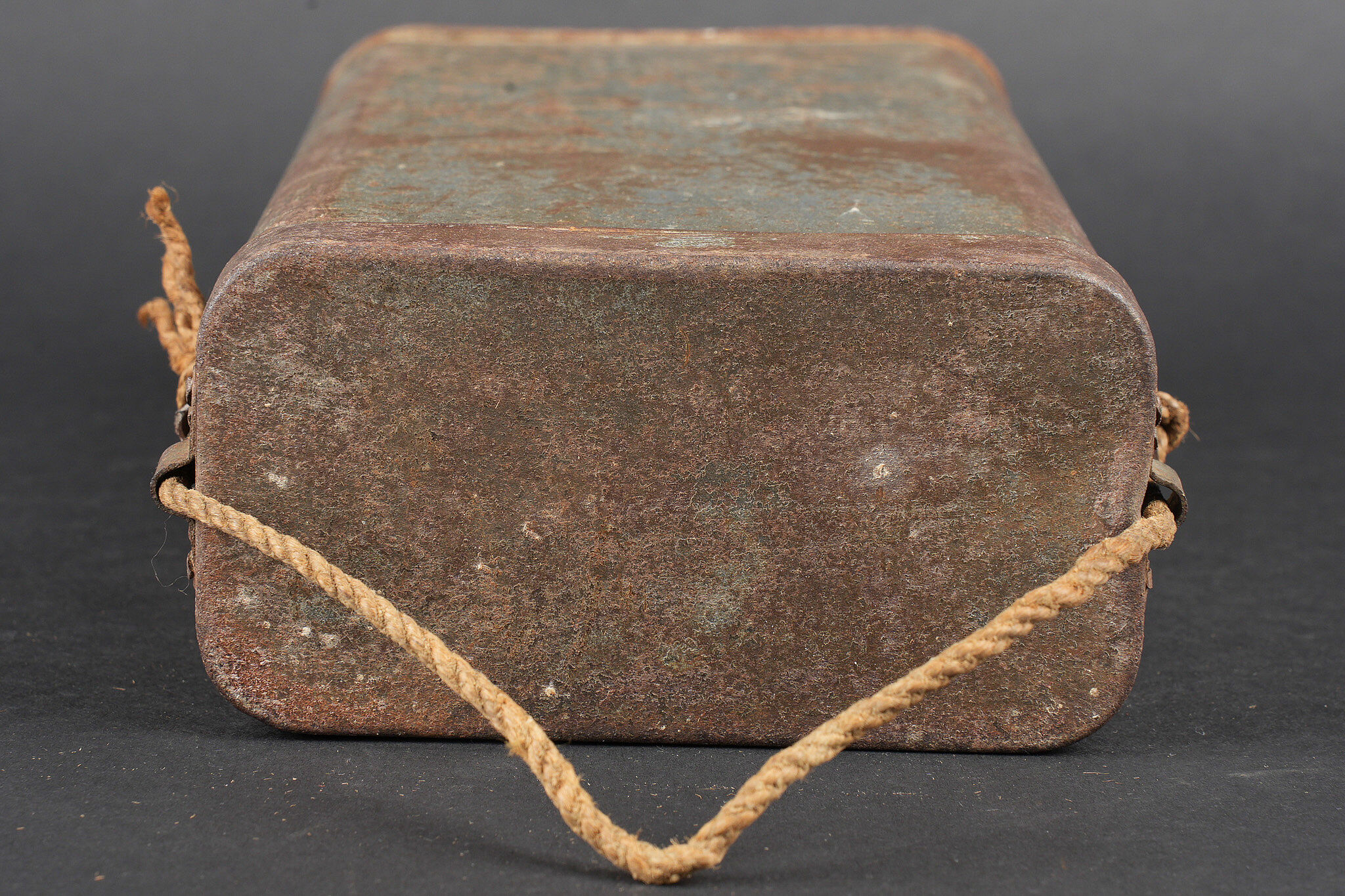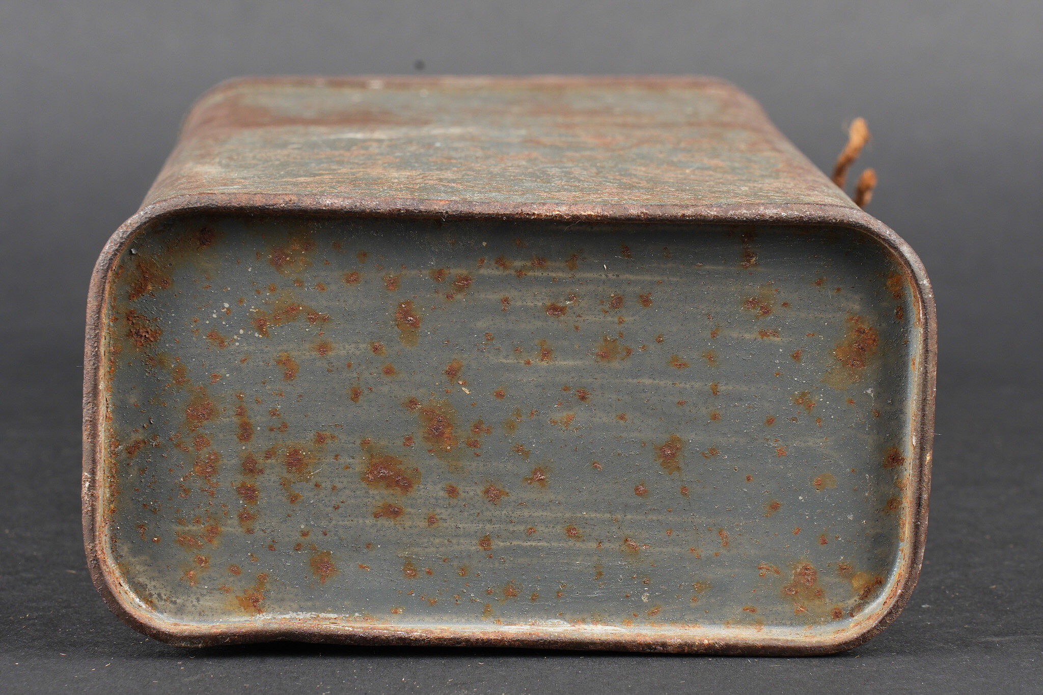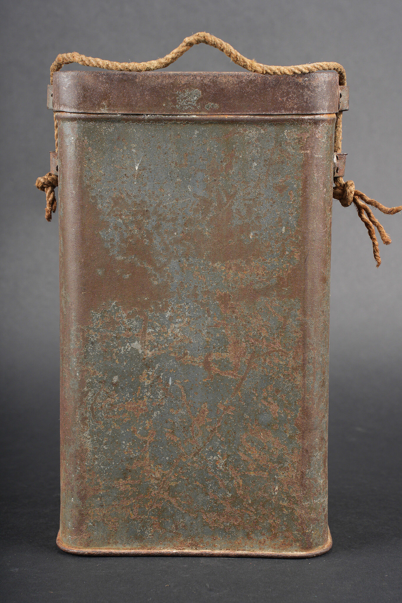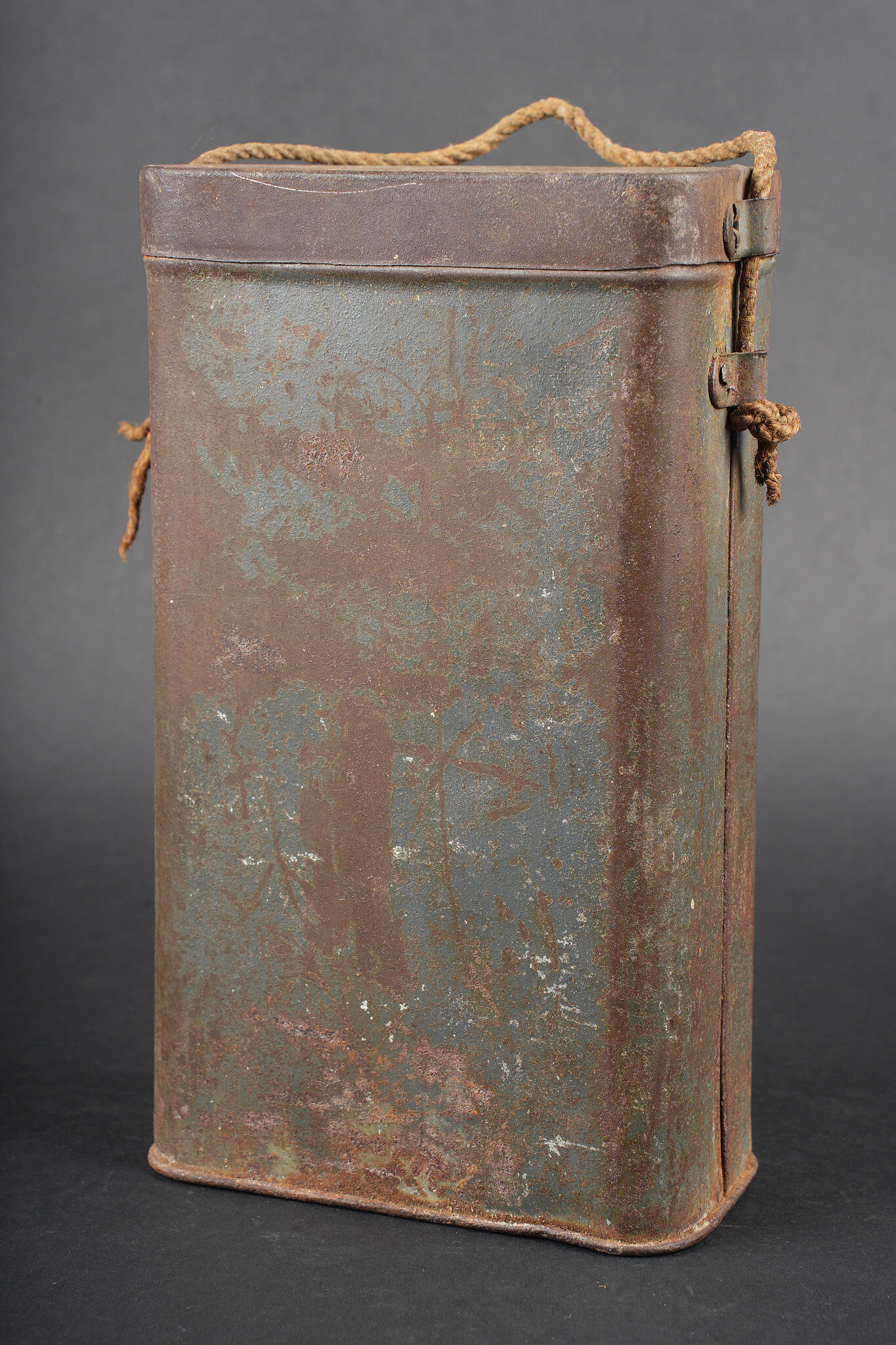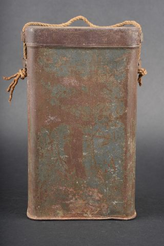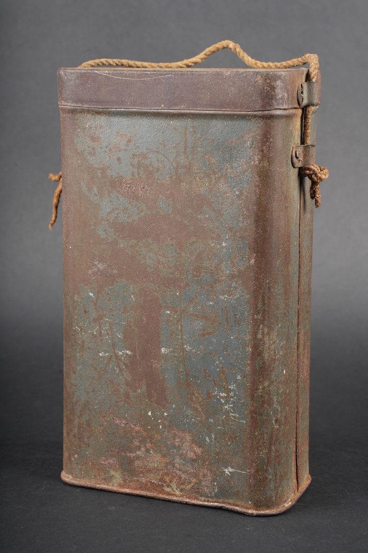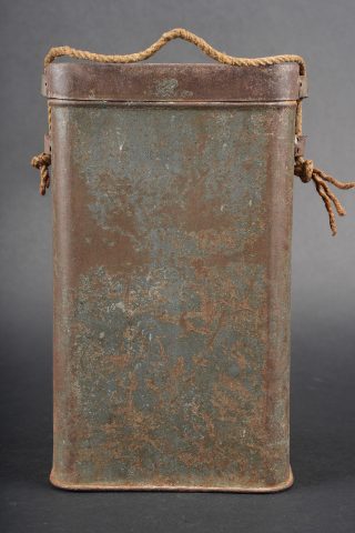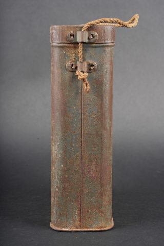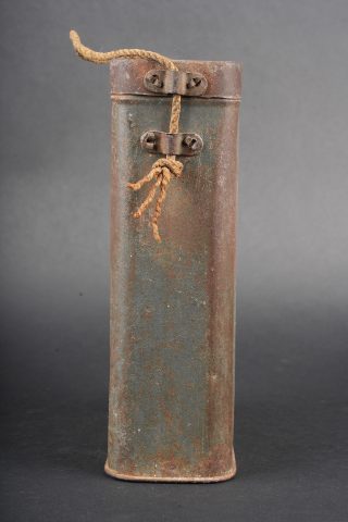 Boite masque anti gaz M2. Peinture bleu horizon à 60%, cordelette d’origine. Boite en bon état général non percée. M2 gas mask canister. Horizon blue paint remaining at 60 percent. Original suspension cord. Canister in good condition not perforated.