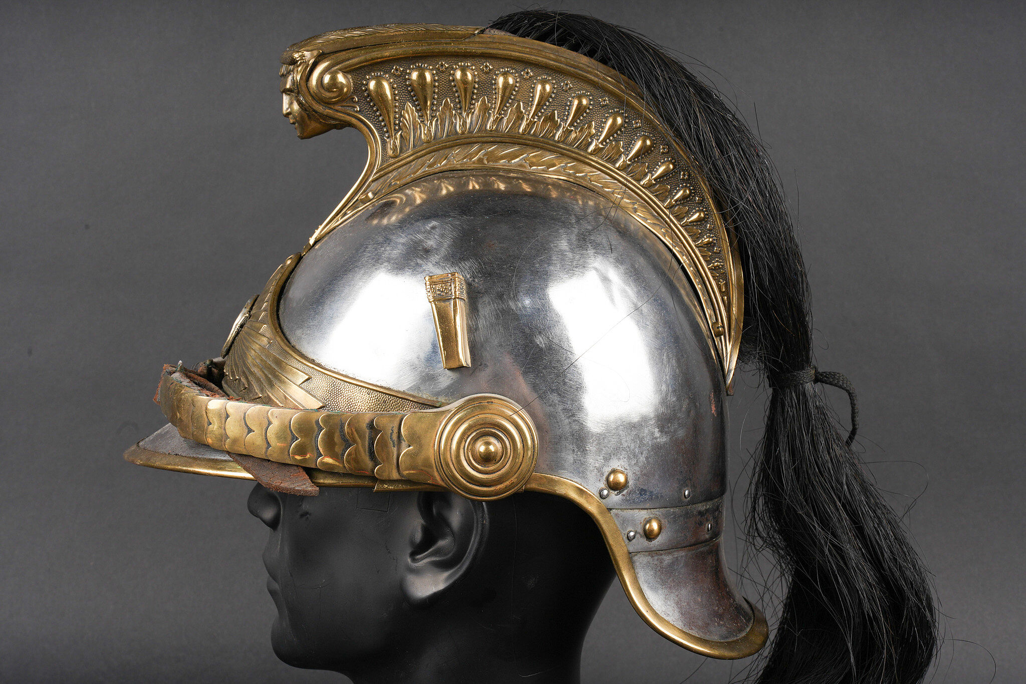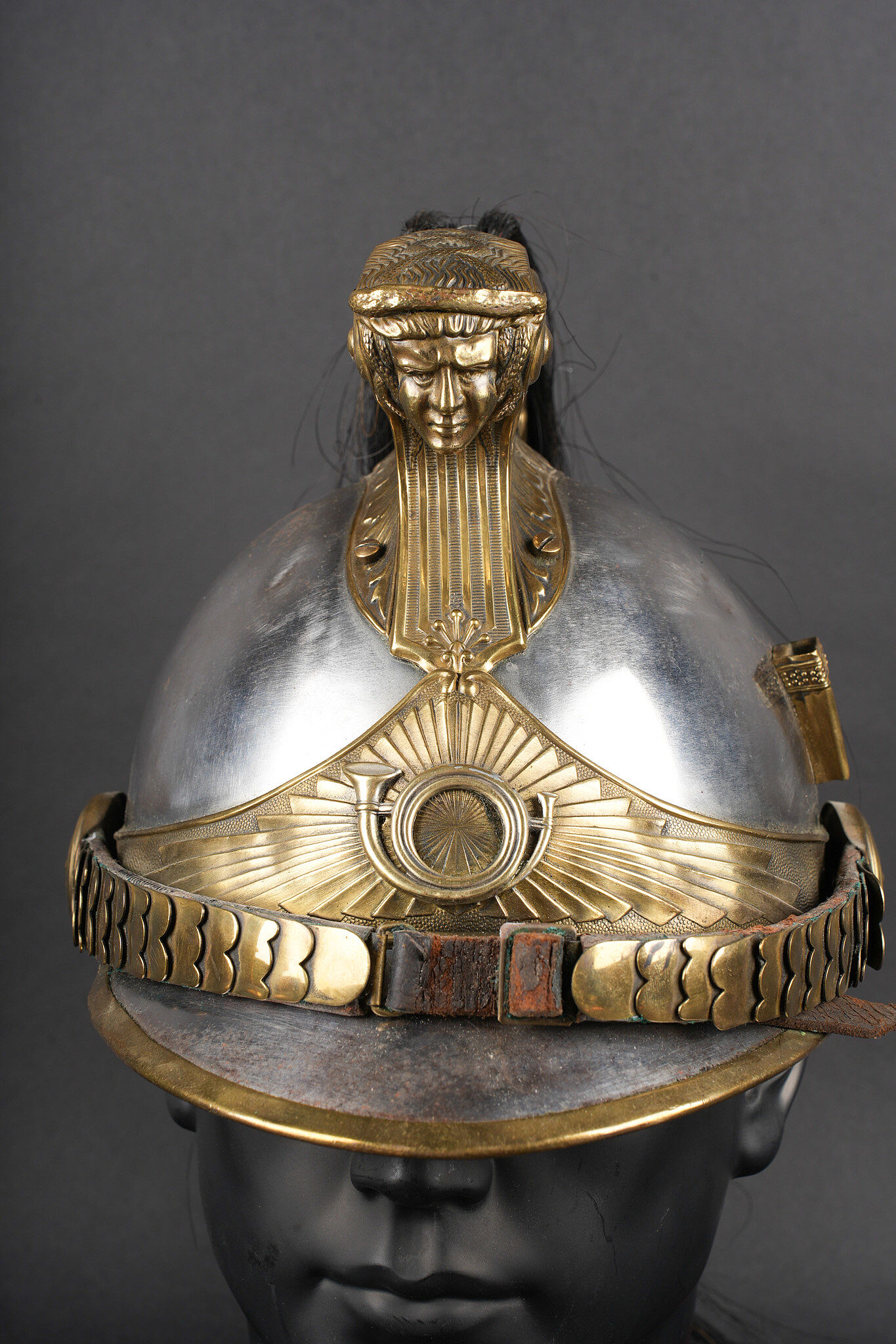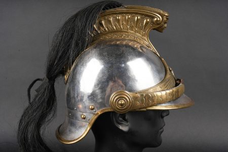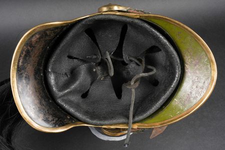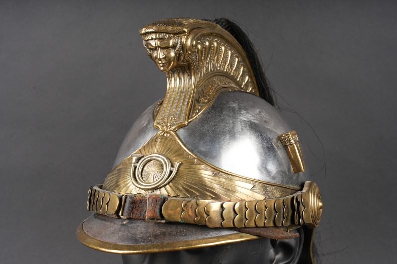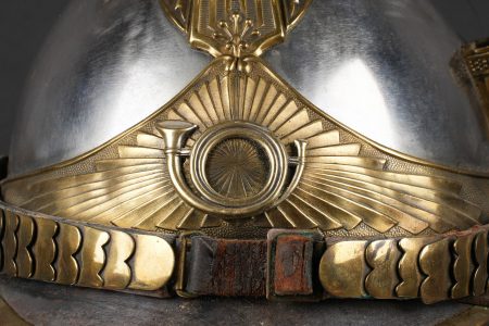 Casque 1910 troupe de chasseurs à cheval. Casque identique au modèle 1874 mais de dimensions plus petites. Bombe en acier nickelé en taille 57 comme l’indique le marquage au dos et fabriqué par la maison Franck à Aubervilliers. Bandeau avec cor de chasse rapporté spécifique aux chasseurs à cheval, porte plumet identique au modèle des dragons. Jonc en laiton, jugulaire à écailles montées sur cuir. Coiffe en cuir à huit dents de loup postérieure. Nuquière peinte en noire et visière en peinture verte. Other ranks’ mounted Chasseurs helmet Model 1910. Identical in form to the 1874 pattern but of reduced dimensions. Nickel-plated steel skull, size 57 stamped to the rear, manufactured by Franck, Aubervilliers. Front band fitted with the hunting horn badge specific to the Chasseurs à cheval, plume holder as per the Dragoon model. Brass edging, scaled chinstrap on leather. Replacement leather liner with eight wolf-tooth tongues. Neck guard painted black and peak painted green.