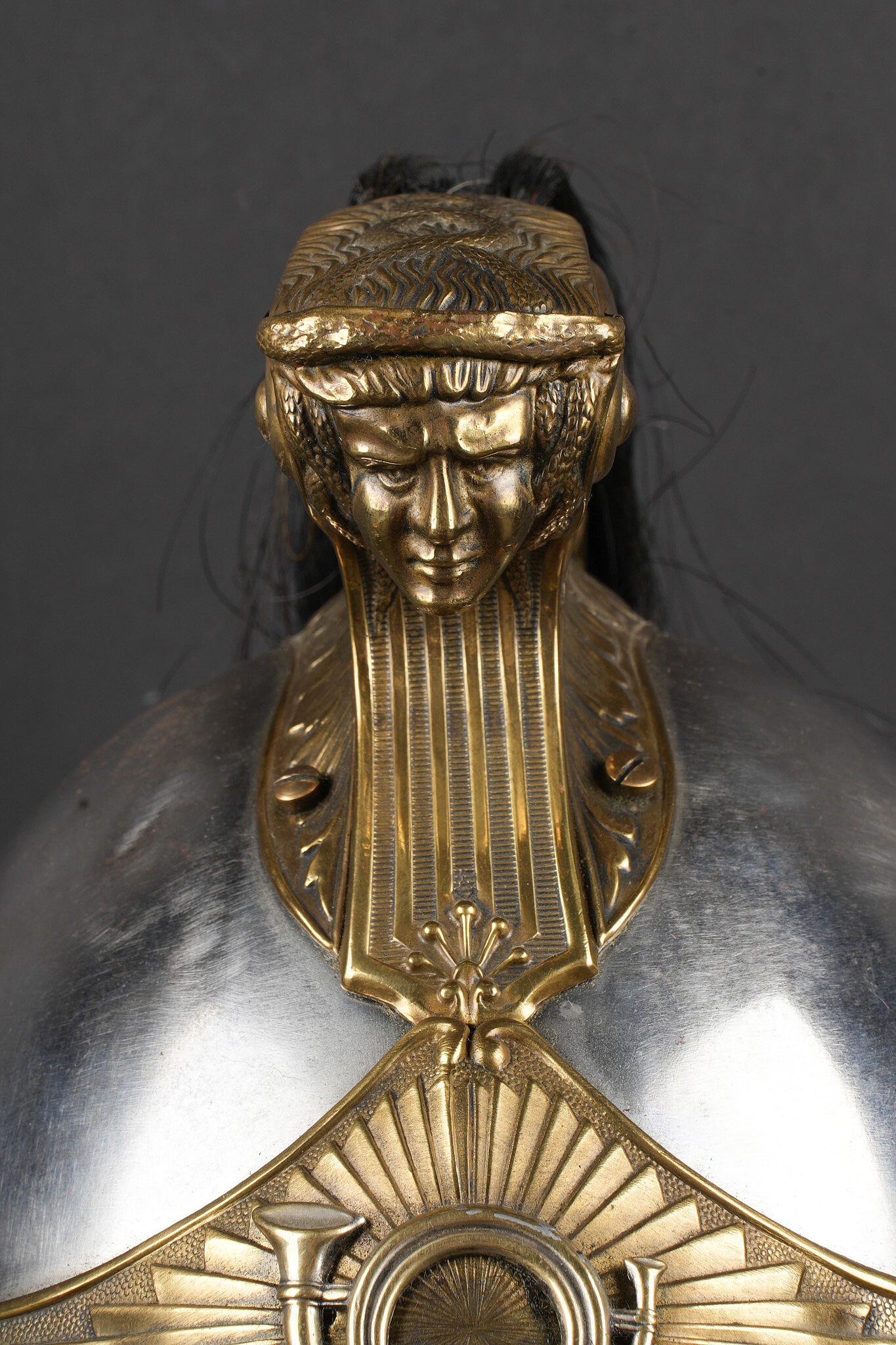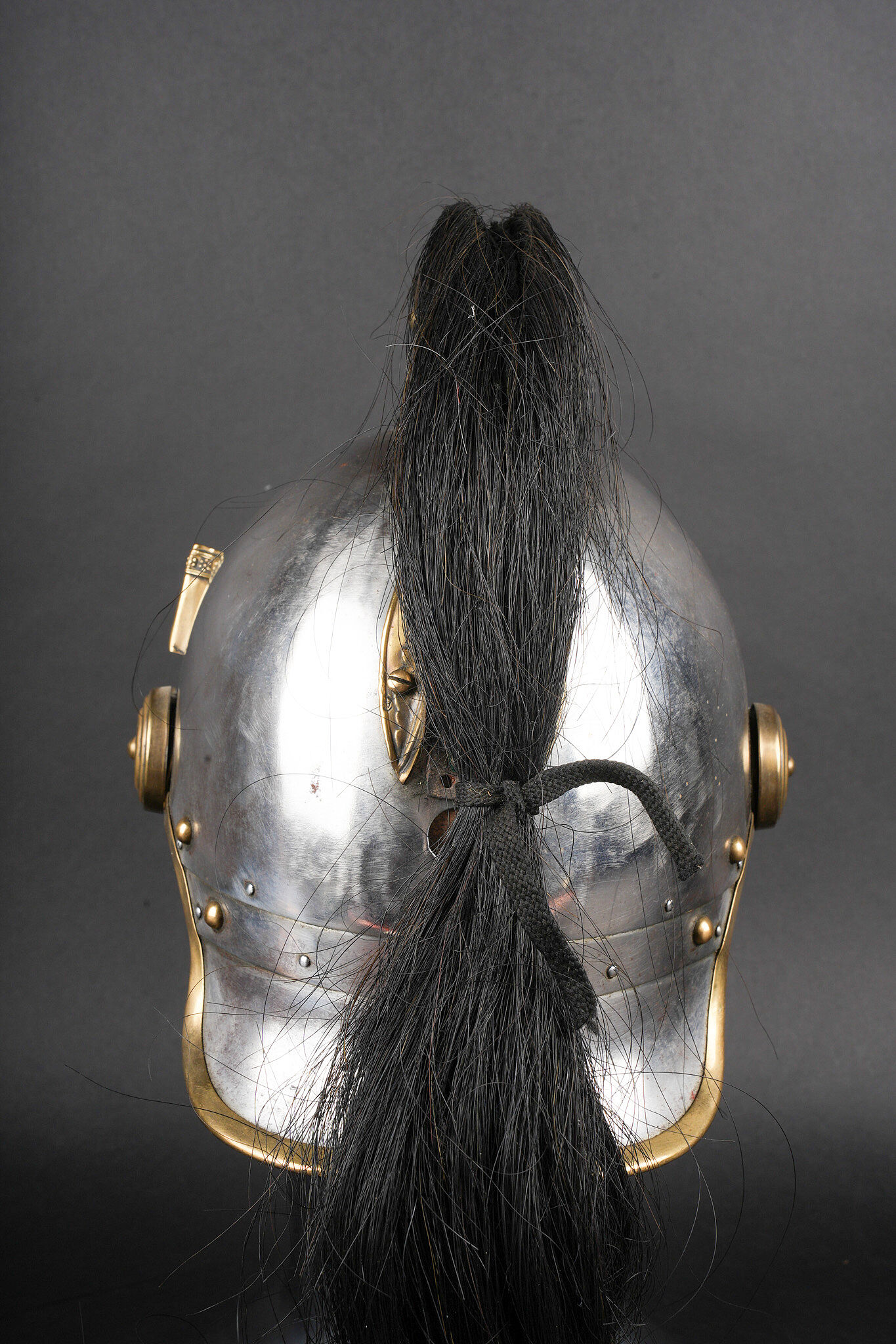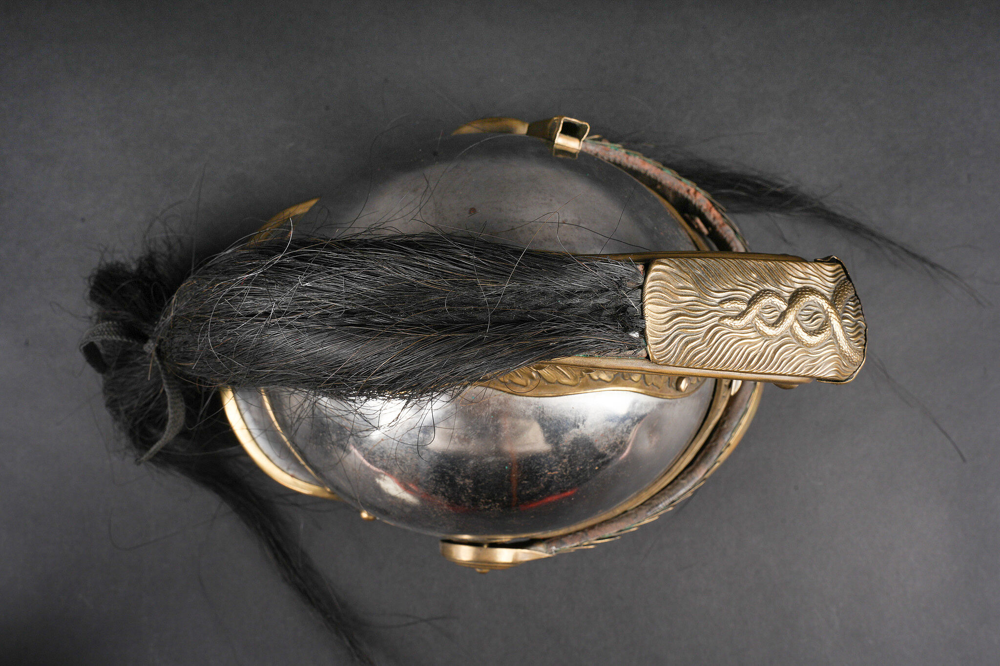 Casque 1910 troupe de chasseurs à cheval. Casque identique au modèle 1874 mais de dimensions plus petites. Bombe en acier nickelé en taille 57 comme l’indique le marquage au dos et fabriqué par la maison Franck à Aubervilliers. Bandeau avec cor de chasse rapporté spécifique aux chasseurs à cheval, porte plumet identique au modèle des dragons. Jonc en laiton, jugulaire à écailles montées sur cuir. Coiffe en cuir à huit dents de loup postérieure. Nuquière peinte en noire et visière en peinture verte. Other ranks’ mounted Chasseurs helmet Model 1910. Identical in form to the 1874 pattern but of reduced dimensions. Nickel-plated steel skull, size 57 stamped to the rear, manufactured by Franck, Aubervilliers. Front band fitted with the hunting horn badge specific to the Chasseurs à cheval, plume holder as per the Dragoon model. Brass edging, scaled chinstrap on leather. Replacement leather liner with eight wolf-tooth tongues. Neck guard painted black and peak painted green.