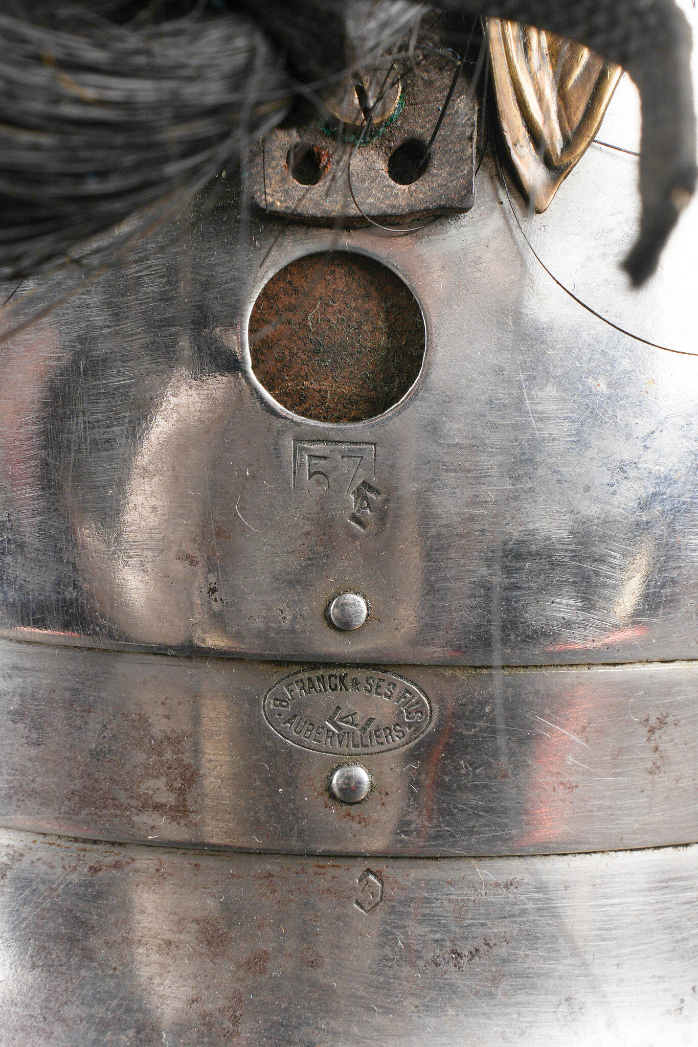 Détails de la vente >Casque 1910 troupe de chasseurs à cheval. Casque identique au modèle 1874 mais de dimensions plus petites. Bombe en acier nickelé en taille 57 comme l’indique le marquage au dos et... en savoir plus