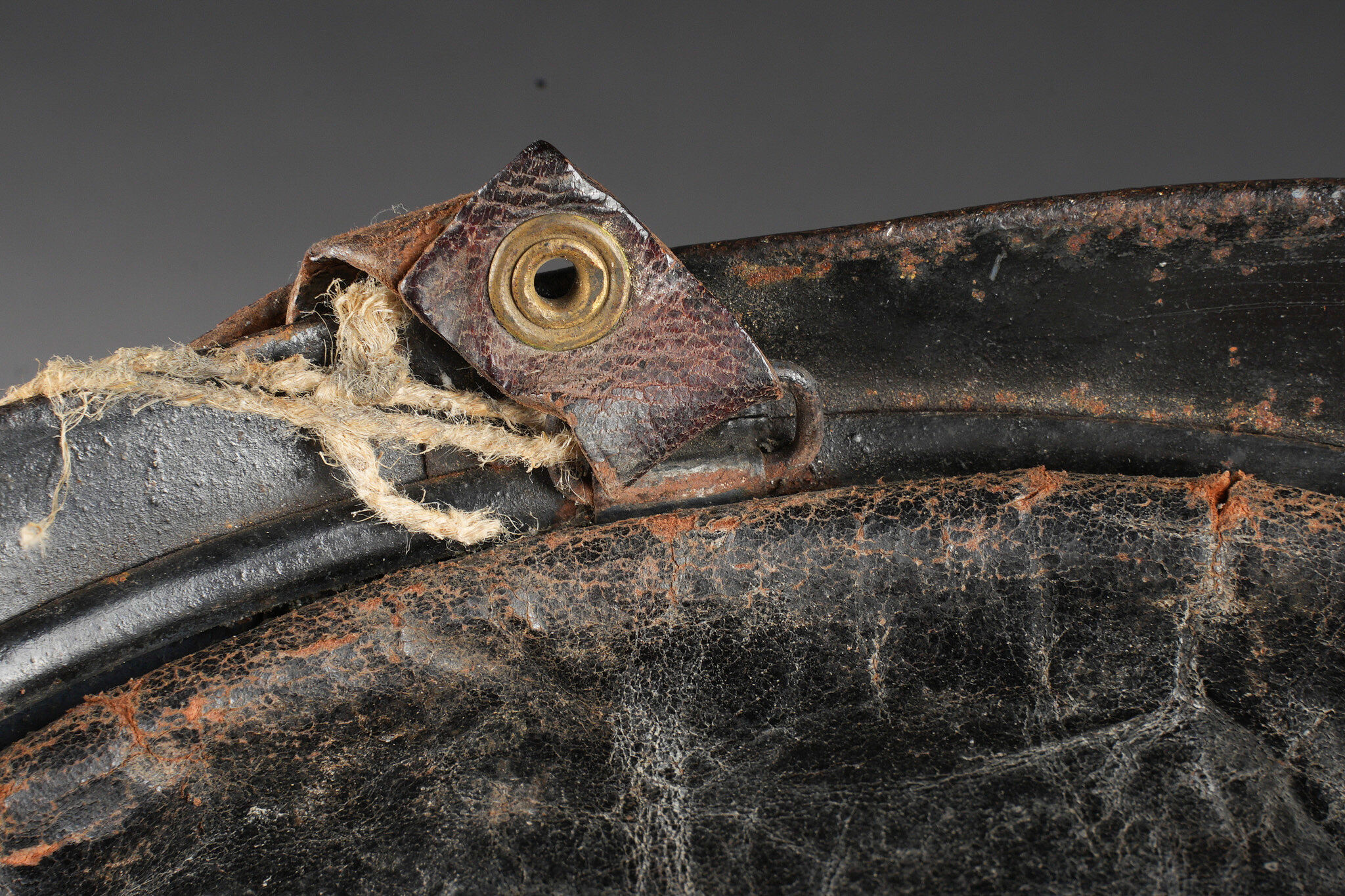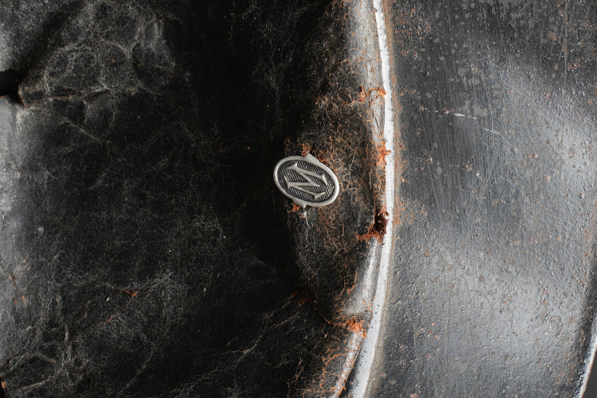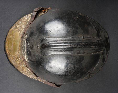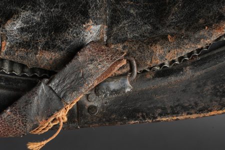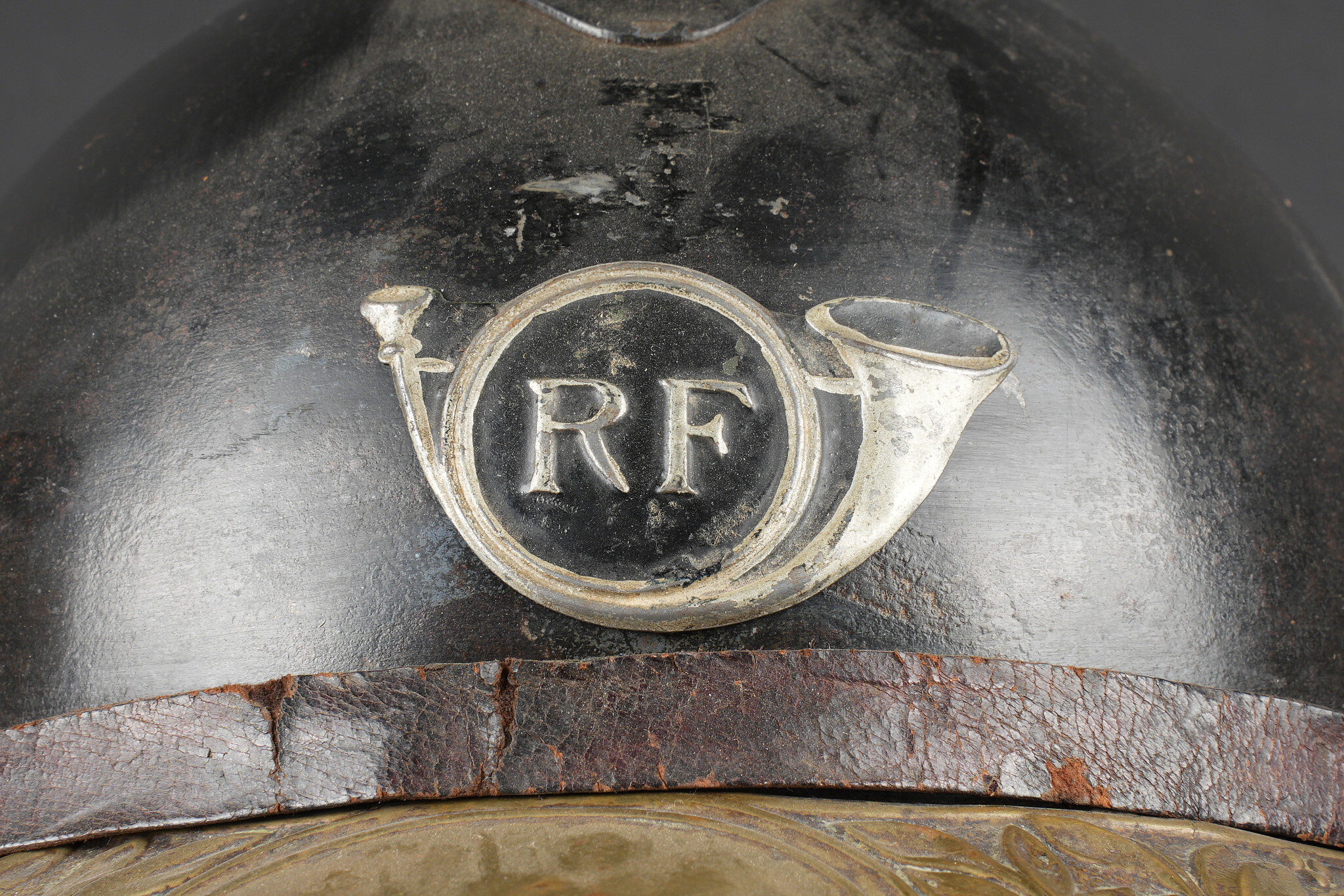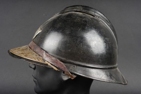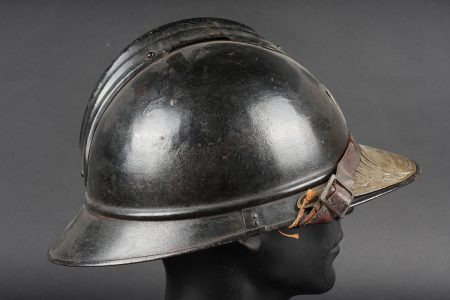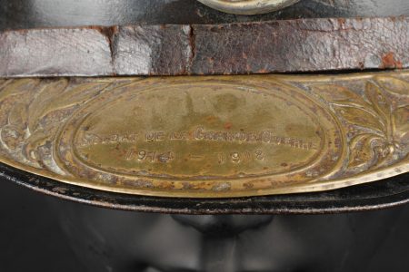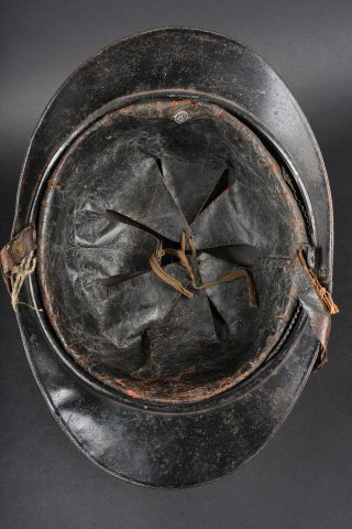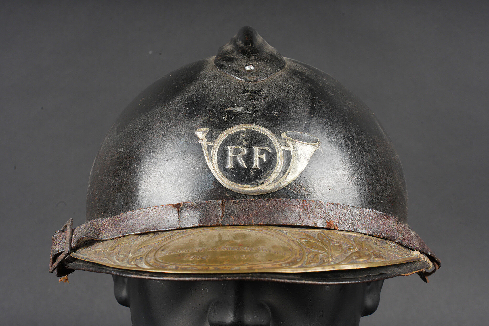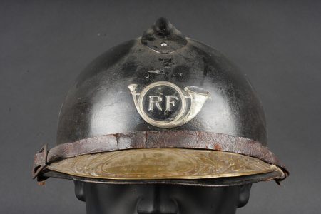Casque Adrian 1915 chasseurs. Casque modèle 1915 en peinture bleu horizon d’usine recouverte d’une peinture noire. Attribut modèle 1915 les chasseurs dont le cor de chasse et les lettrés RF ont été réhaussées à la peinture argentée. Coiffe en cuir du premier type à sept dents de loup, bandeau en drap bleu horizon, deux gaufrettes en aluminium. Jugulaire en cuir fauve fragilisée et recollée. Plaque commémorative de la grande guerre retenue par deux cordelettes. Adrian helmet model 1915 Chasseurs. Factory horizon blue paint overpainted in black. Model 1915 Chasseur badge with the hunting horn and RF letters highlighted in silver paint. First pattern leather liner with seven wolf’s teeth, horizon blue cloth band and two aluminium liner pads. Fawn leather chinstrap weakened and reglued. Great War commemorative plaque held by two cords.