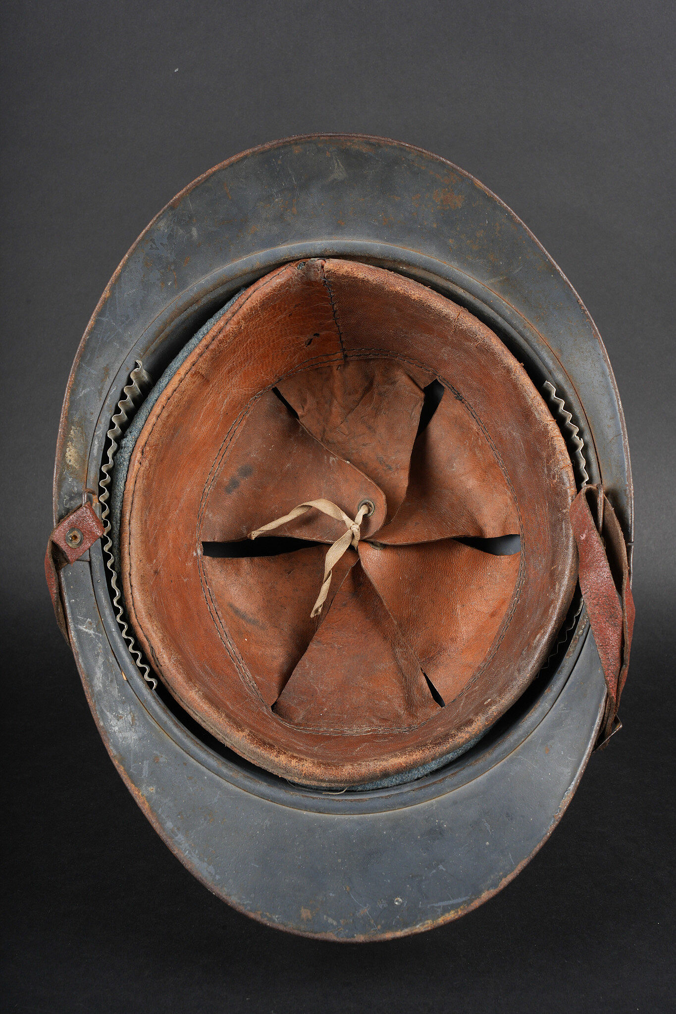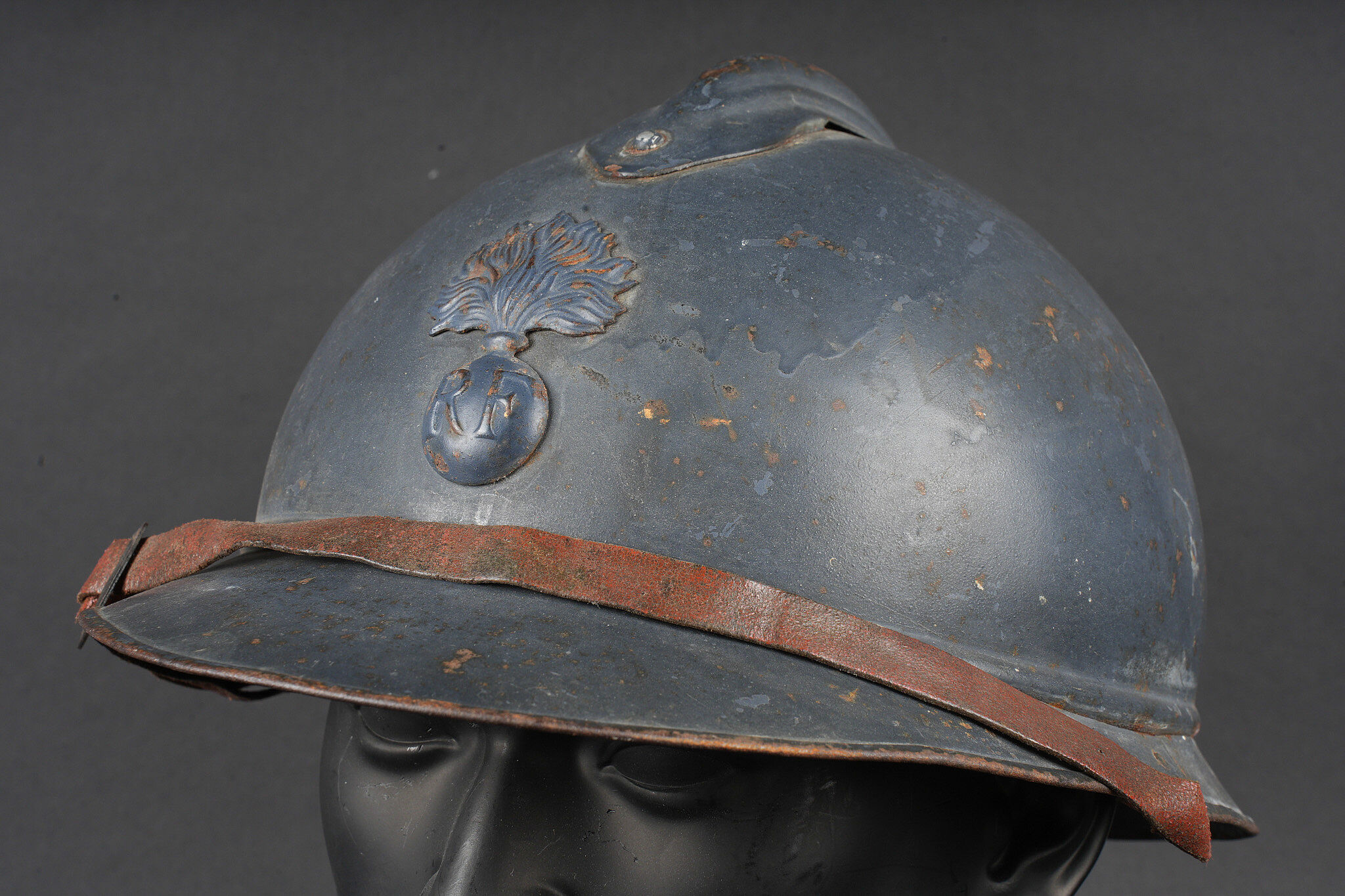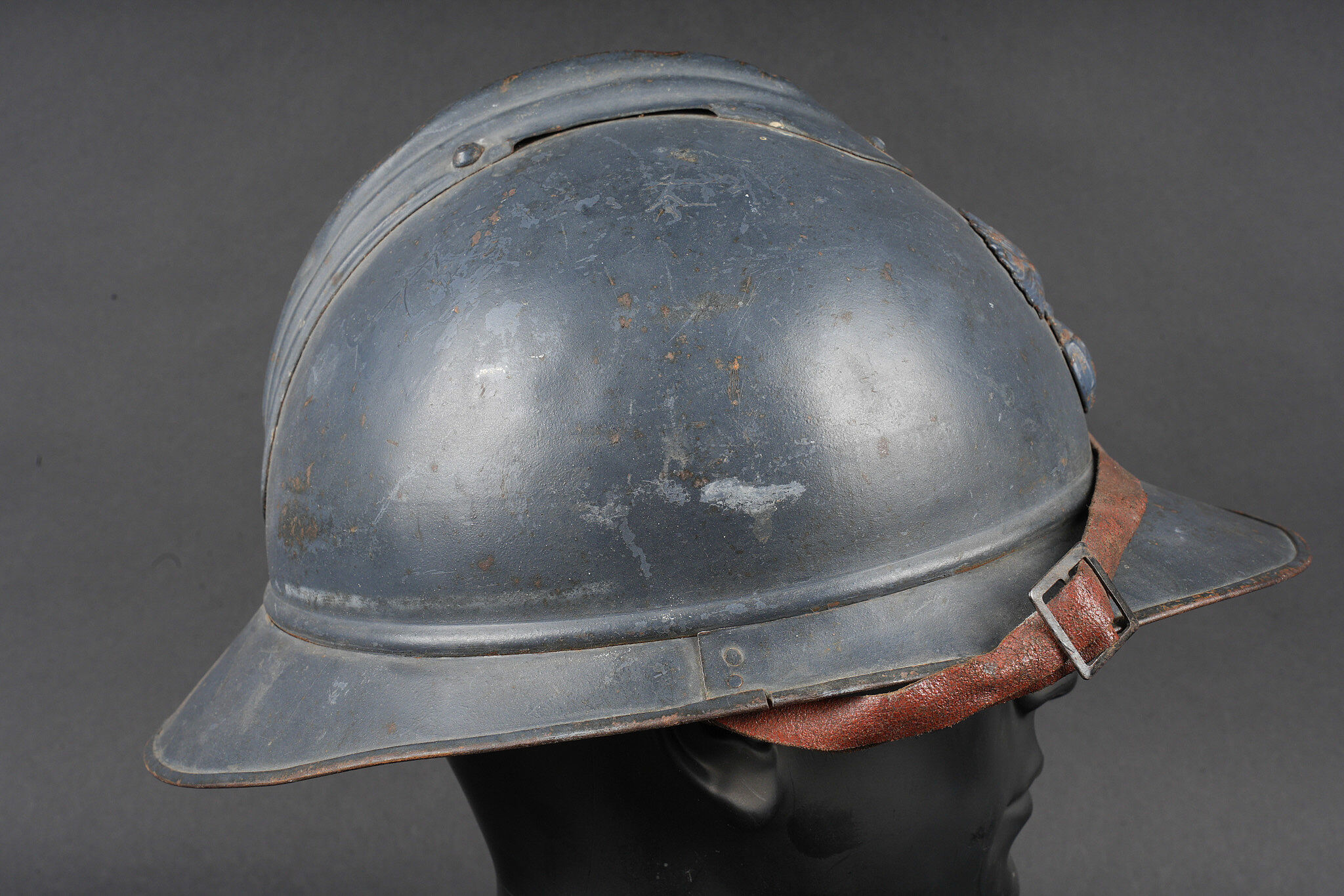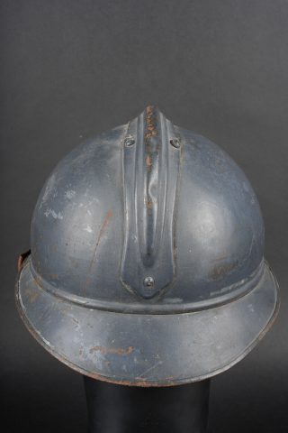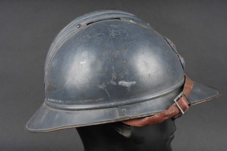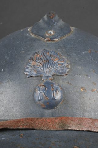 Casque Adrian 1915 infanterie. Casque modèle 1915 en peinture bleu horizon recouverte par une peinture plus foncée. Attribut modèle 1915 de l’infanterie, coiffe du second type en cuir marron à six dents de loup. Bandeau en drap bleu horizon, deux gaufrettes présente, jugulaire en cuir rougeâtre. Adrian helmet Model 1915 infantry. Helmet in horizon blue paint overpainted in a darker shade. Model 1915 infantry badge. Second pattern brown leather liner with six tongues. Horizon blue cloth band. Two aluminium liner corrugations present. Reddish leather chinstrap.