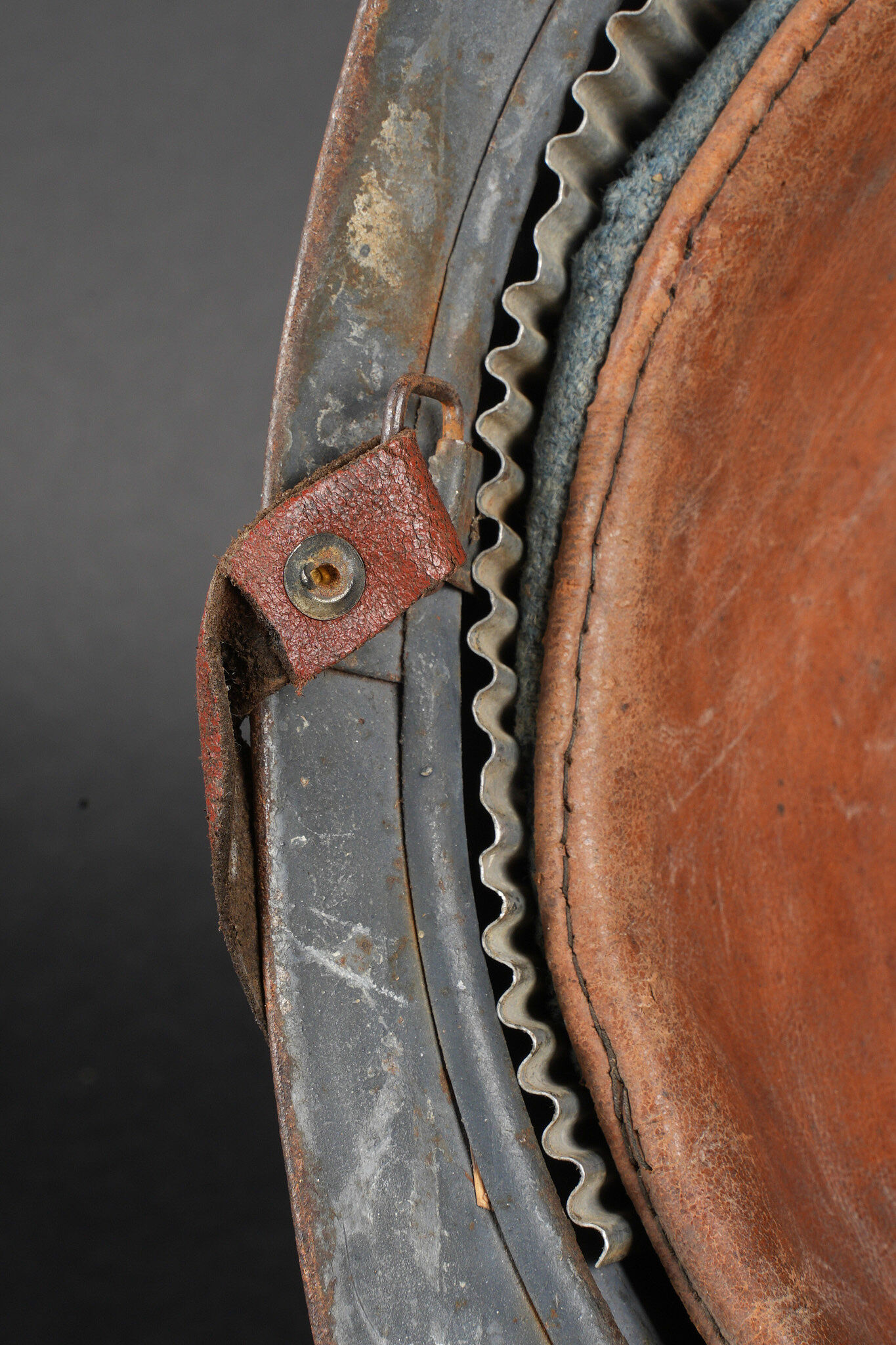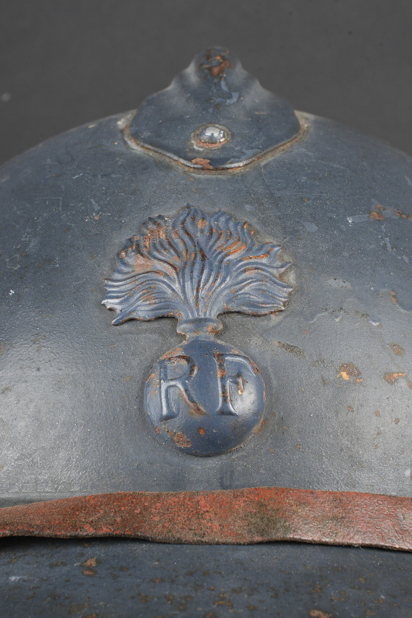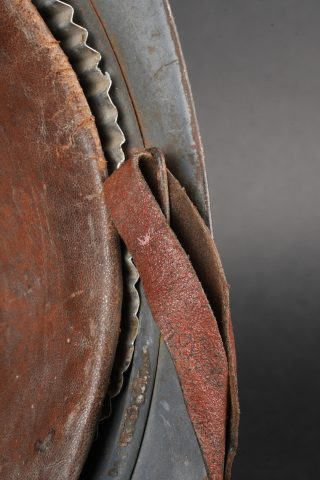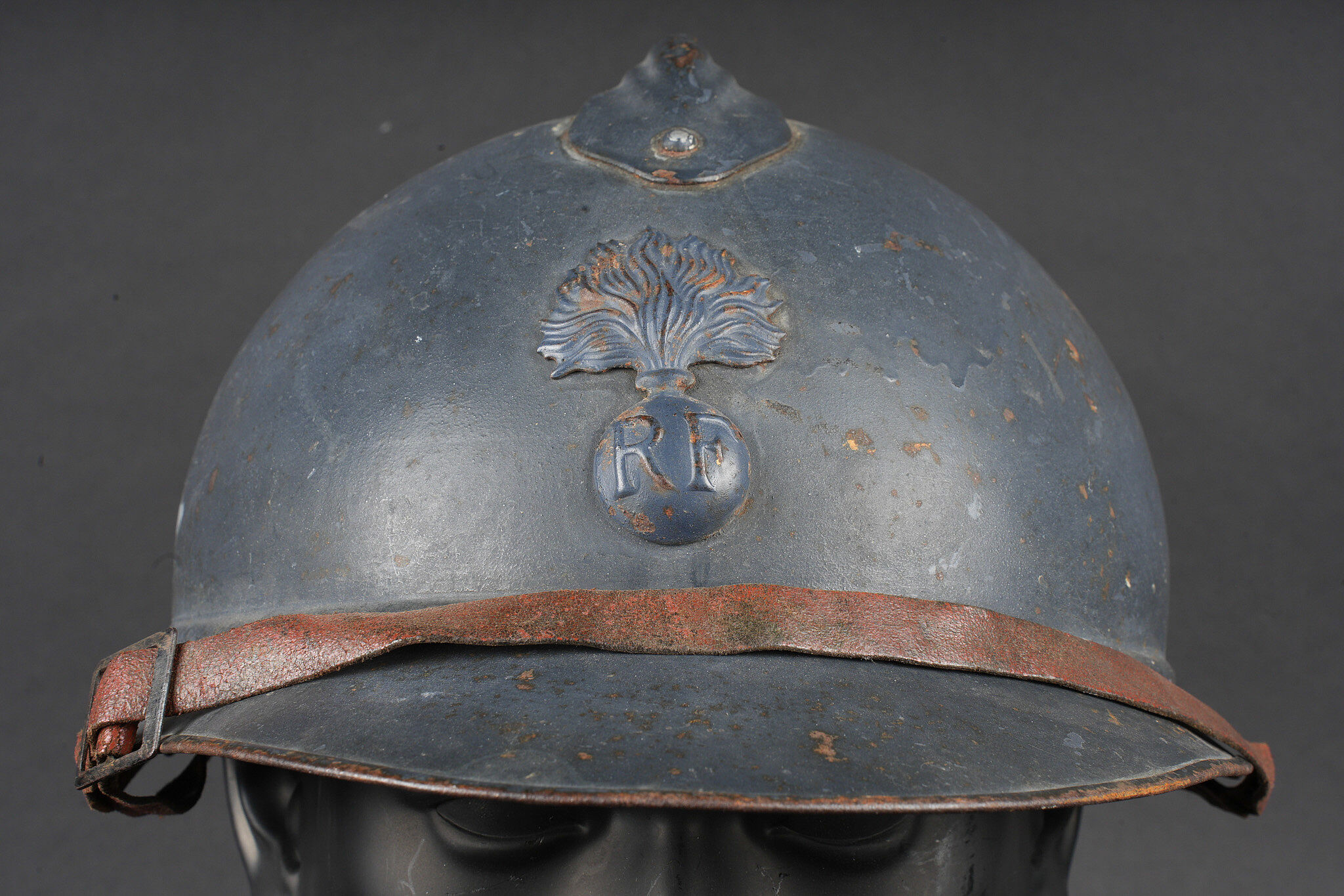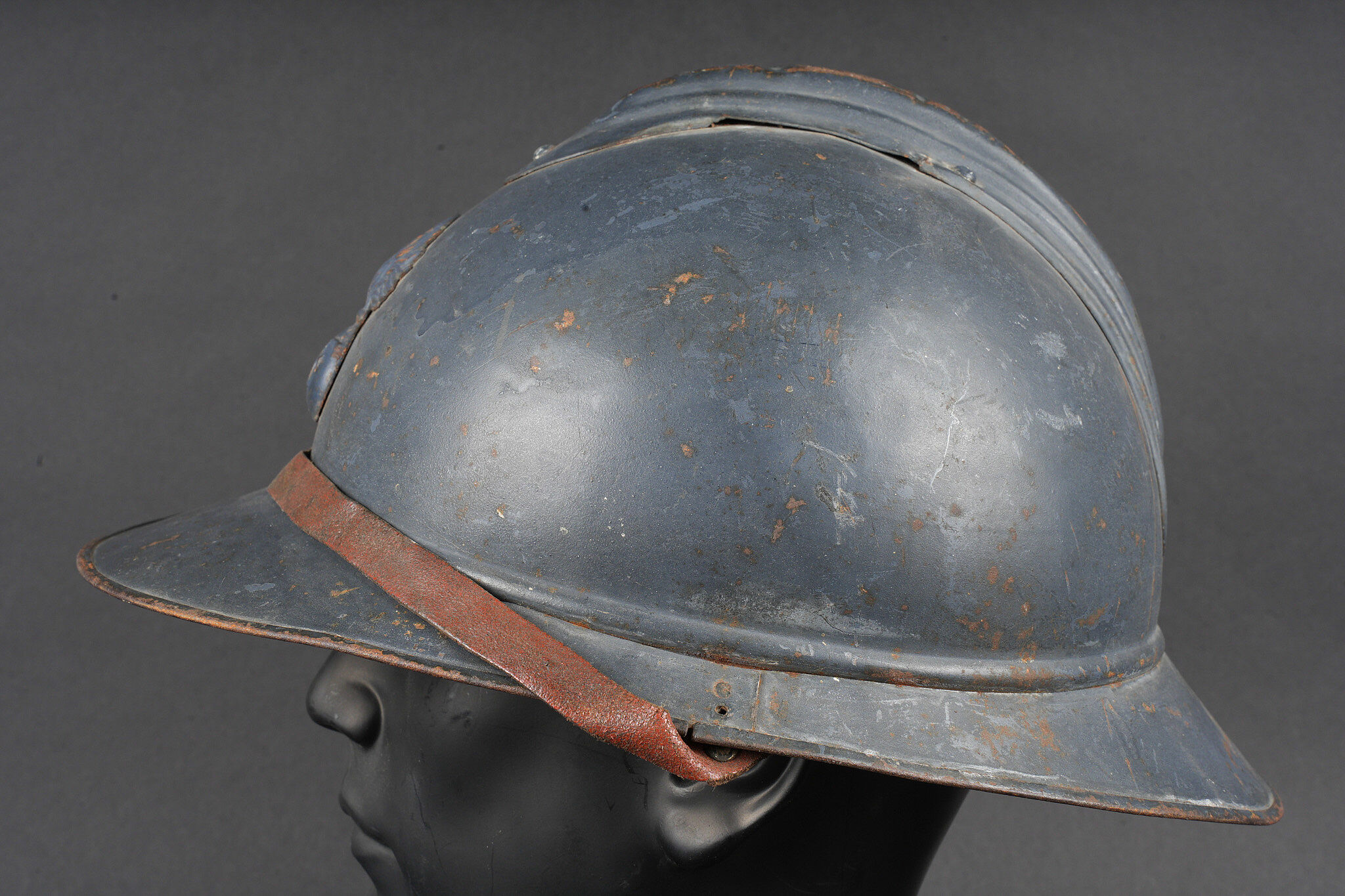 Casque Adrian 1915 infanterie. Casque modèle 1915 en peinture bleu horizon recouverte par une peinture plus foncée. Attribut modèle 1915 de l’infanterie, coiffe du second type en cuir marron à six dents de loup. Bandeau en drap bleu horizon, deux gaufrettes présente, jugulaire en cuir rougeâtre. Adrian helmet Model 1915 infantry. Helmet in horizon blue paint overpainted in a darker shade. Model 1915 infantry badge. Second pattern brown leather liner with six tongues. Horizon blue cloth band. Two aluminium liner corrugations present. Reddish leather chinstrap.
