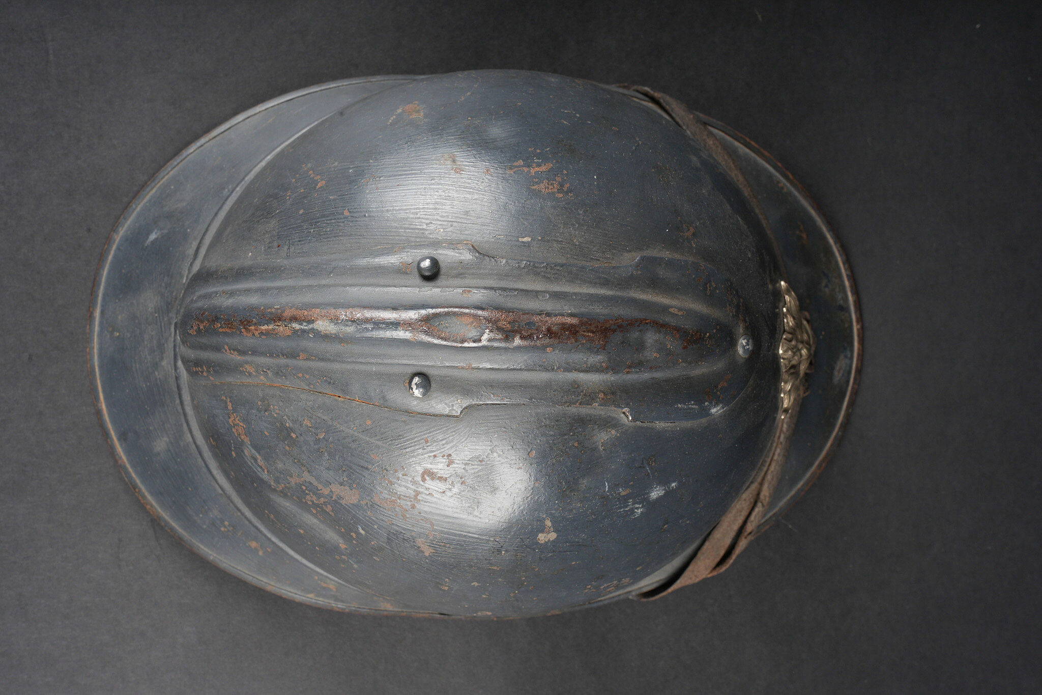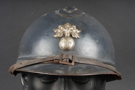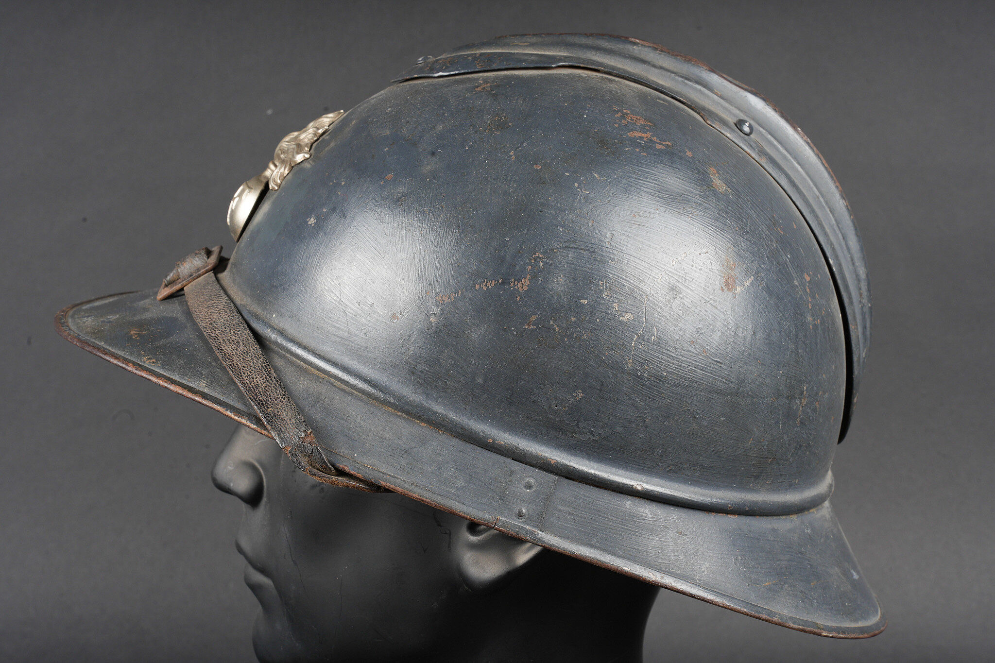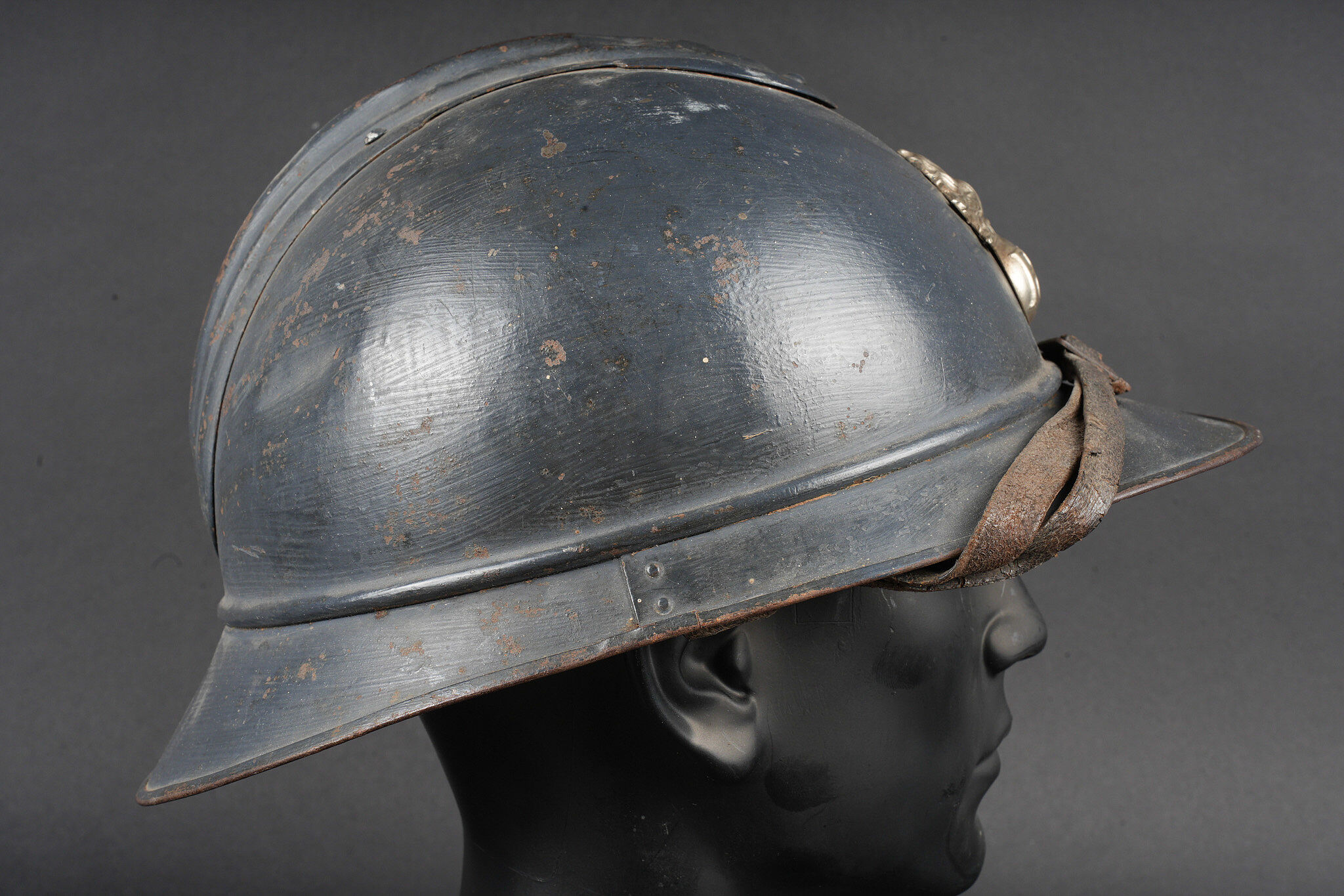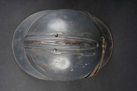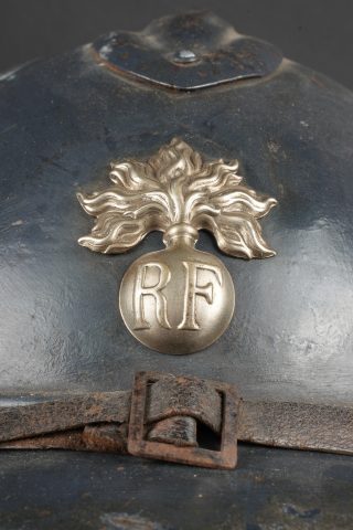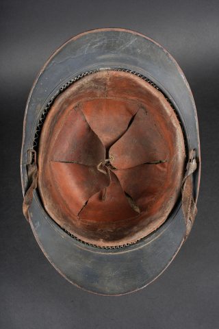 Casque Adrian 1915 Prévôté militaire. Casque modèle 1915 ayant reçu une seconde couche de peinture au pinceau, attribut d’officier à la grenade argentée portée par les officiers de gendarmerie. Coiffe du second type en cuir marron à six dents de loup, bandeau en drap gris de fer bleuté, quatre gaufrettes. Au fond du casque se trouve un journal placé par le soldat. Adrian helmet Model 1915, Military Provost. Model 1915 helmet repainted with a second brush-applied coat, fitted with the officer’s silver grenade badge worn by Gendarmerie officers. Second-pattern brown leather liner with six wolf-tooth tongues, blue-grey cloth sweatband with four pads. A newspaper placed by the soldier is preserved inside the shell.