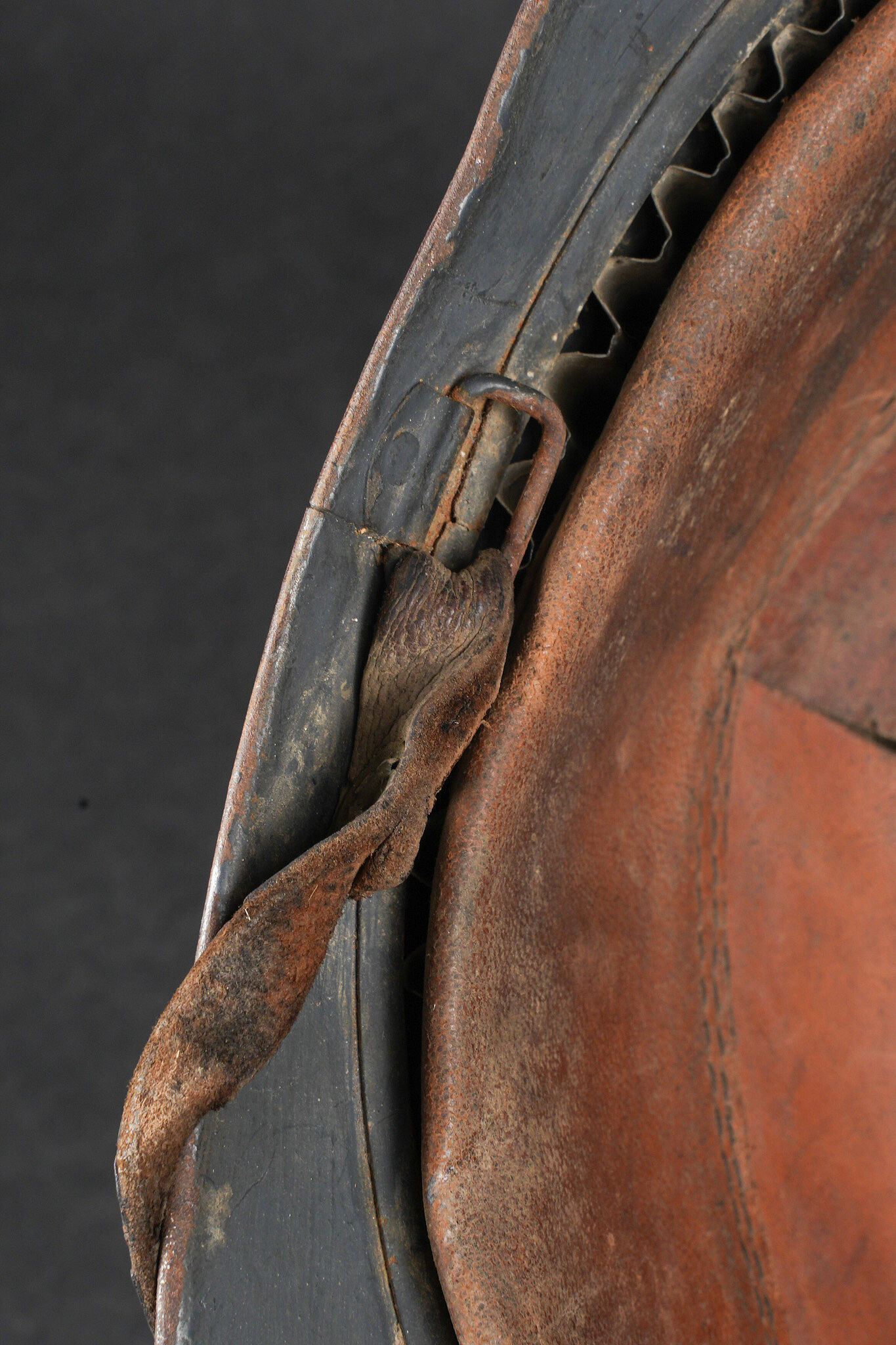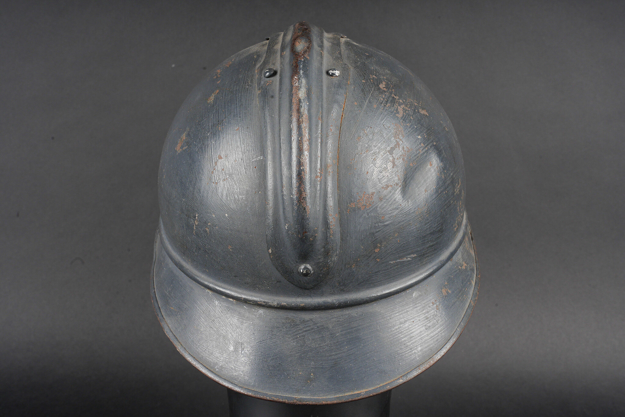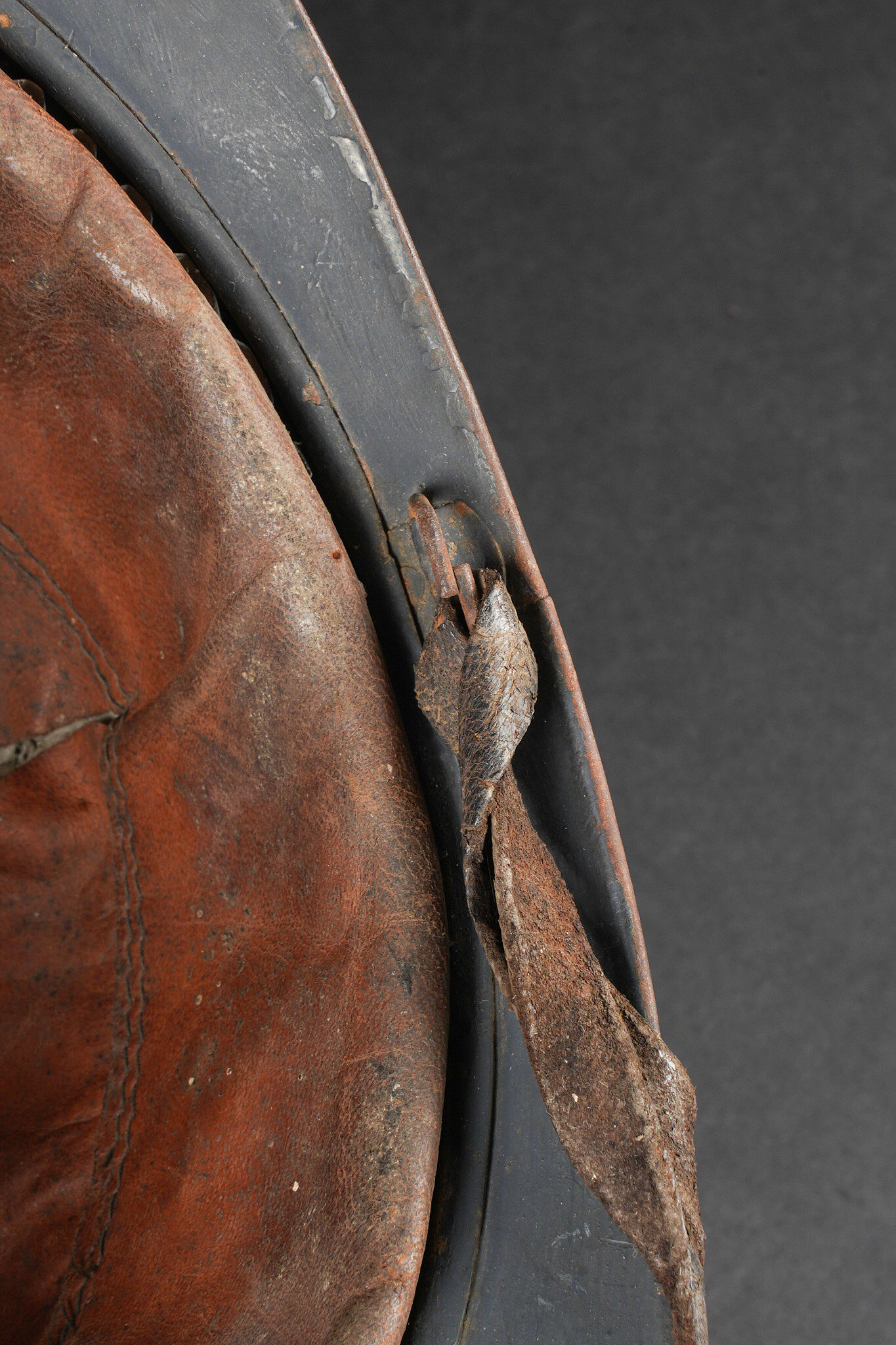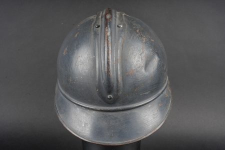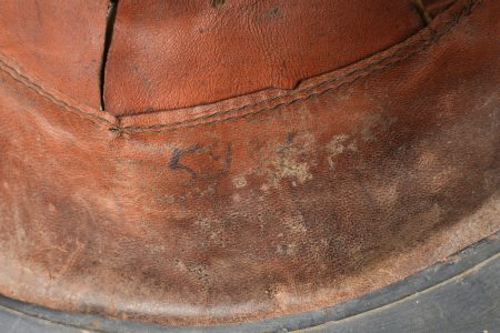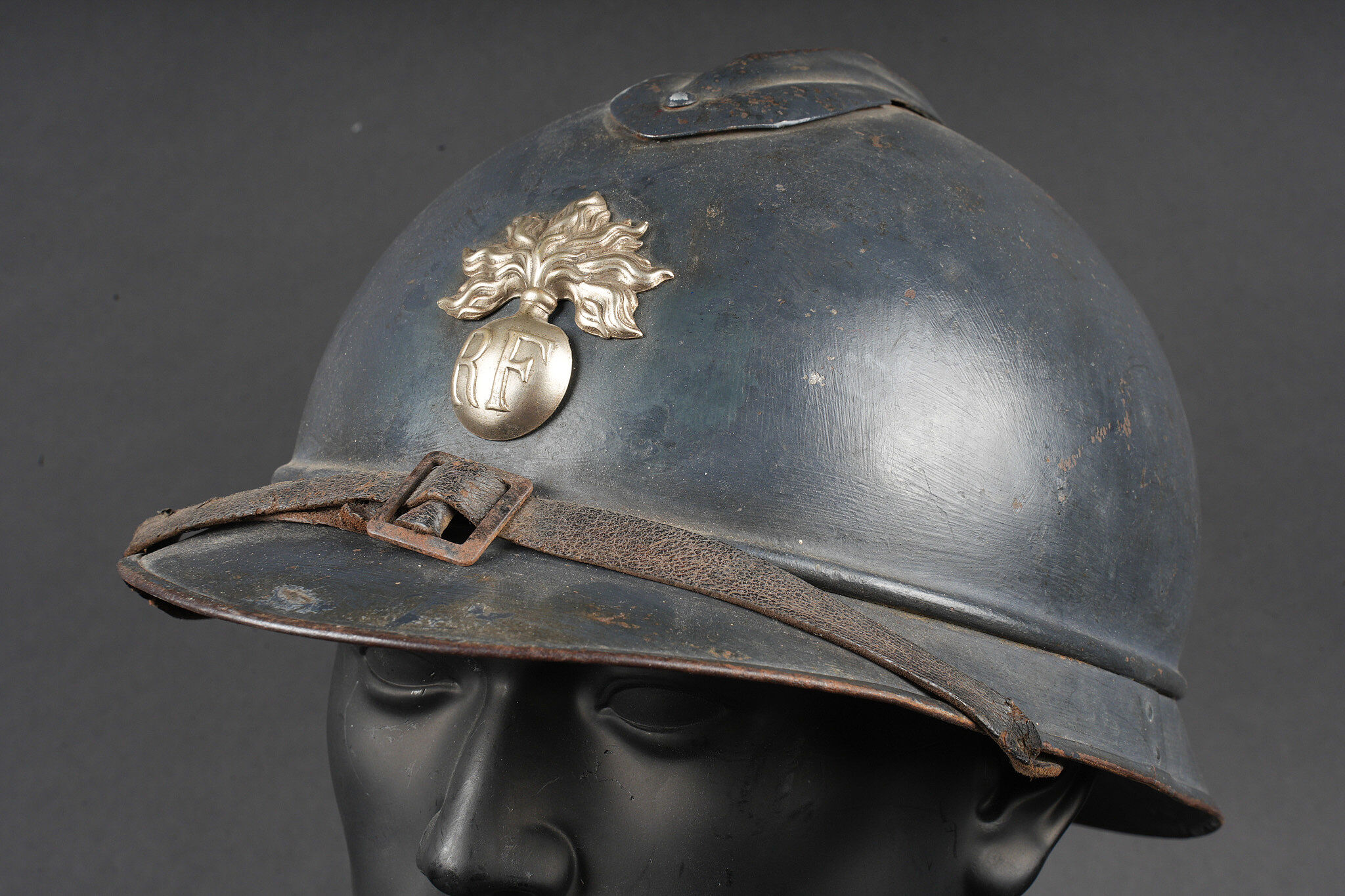 Casque Adrian 1915 Prévôté militaire. Casque modèle 1915 ayant reçu une seconde couche de peinture au pinceau, attribut d’officier à la grenade argentée portée par les officiers de gendarmerie. Coiffe du second type en cuir marron à six dents de loup, bandeau en drap gris de fer bleuté, quatre gaufrettes. Au fond du casque se trouve un journal placé par le soldat. Adrian helmet Model 1915, Military Provost. Model 1915 helmet repainted with a second brush-applied coat, fitted with the officer’s silver grenade badge worn by Gendarmerie officers. Second-pattern brown leather liner with six wolf-tooth tongues, blue-grey cloth sweatband with four pads. A newspaper placed by the soldier is preserved inside the shell.