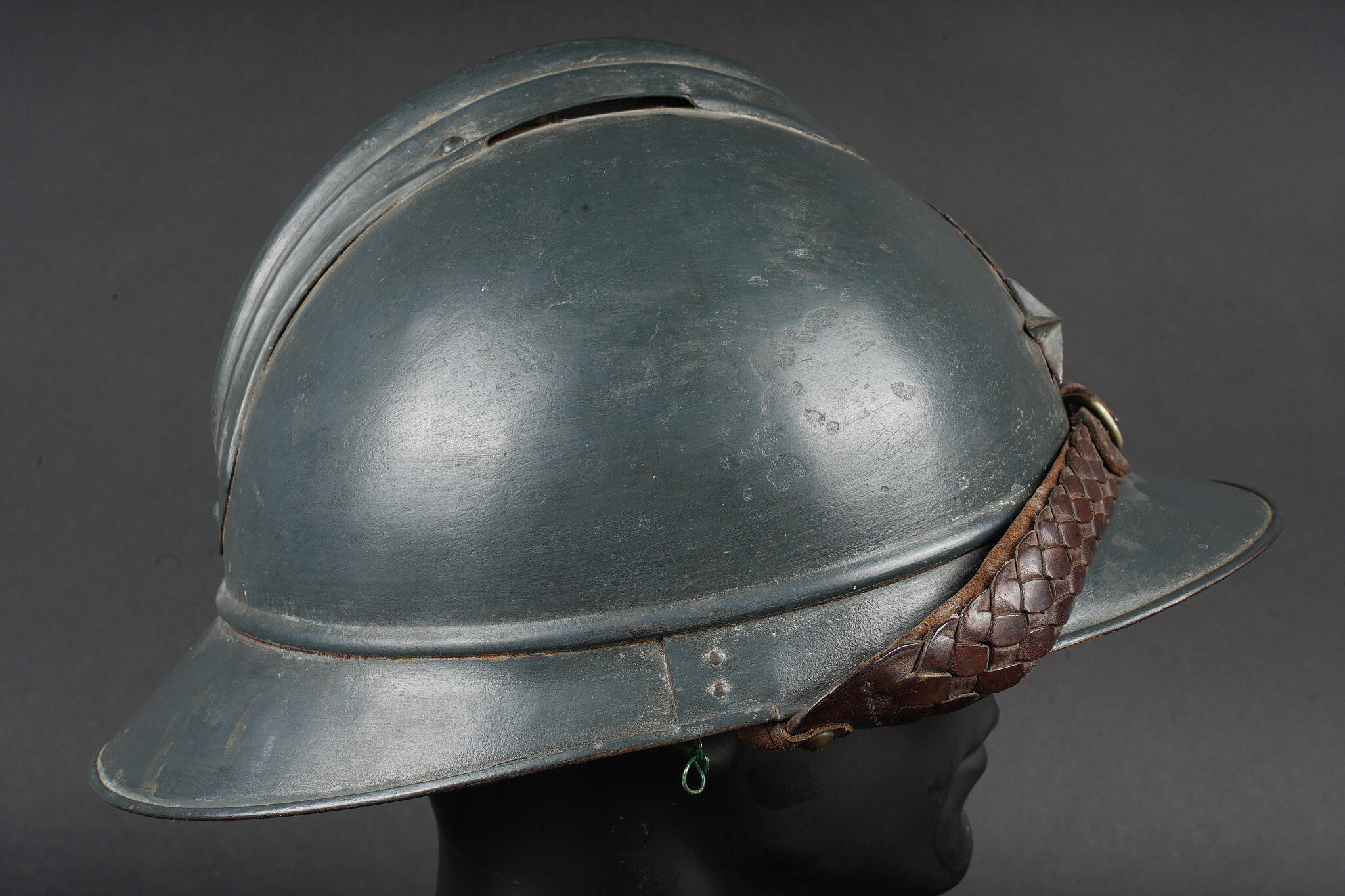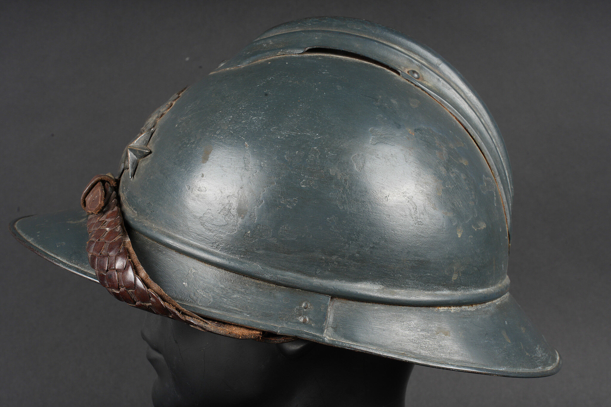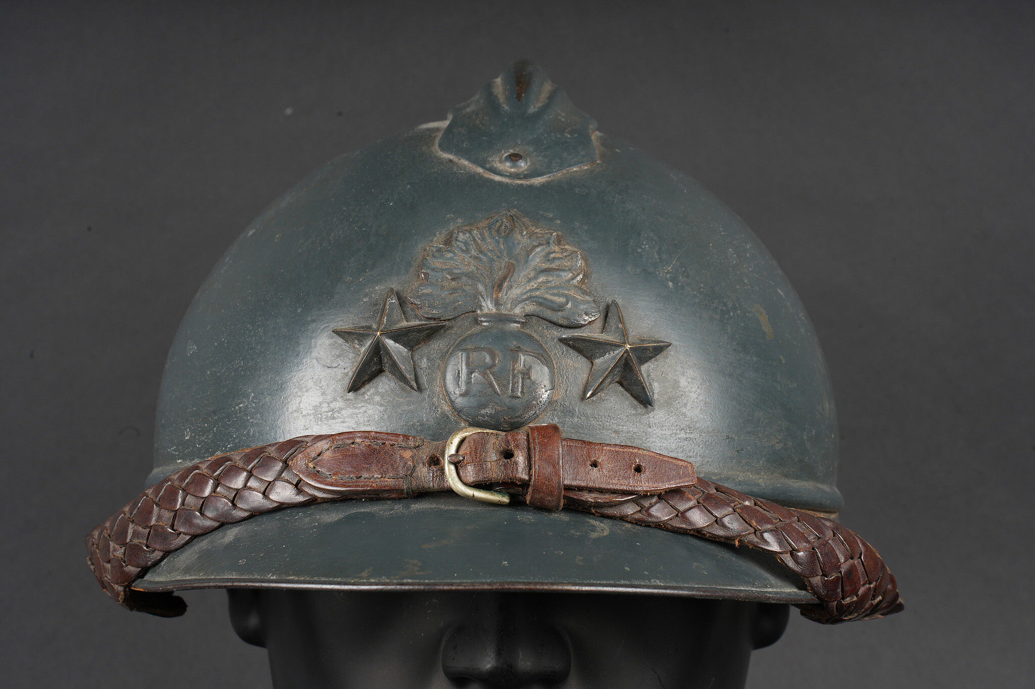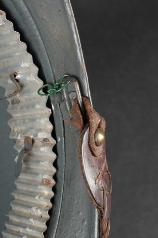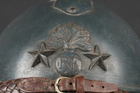 Casque Adrian général de brigade. Coque de casque Adrian modèle 1915, attribut frontal de l’infanterie entouré de deux étoiles argentées recouvertes par la même peinture que le reste du casque et étant retenues par deux vis. La coiffe est absente, quatre gaufrettes en aluminium toujours présentes. Jugulaire tressée en cuir de type officier, un accroc au niveau de l’attache côté gauche. Adrian helmet model 1915 Brigadier General. Shell with infantry badge surrounded by two silver stars repainted in the same colour as the helmet and fixed by two screws. Liner absent. Four aluminium spacers present. Officer type plaited leather chinstrap with damage at the left attachment.