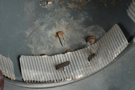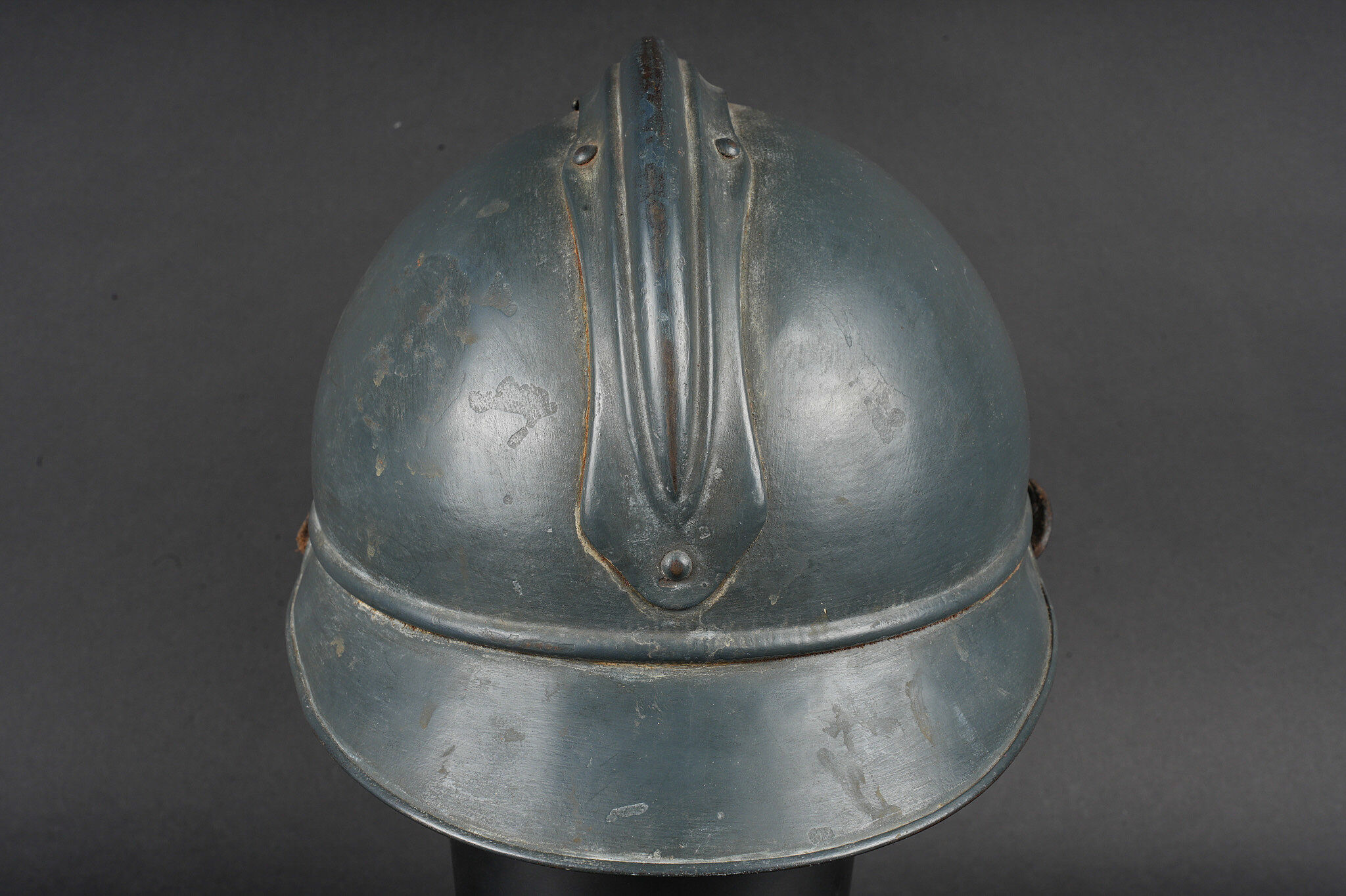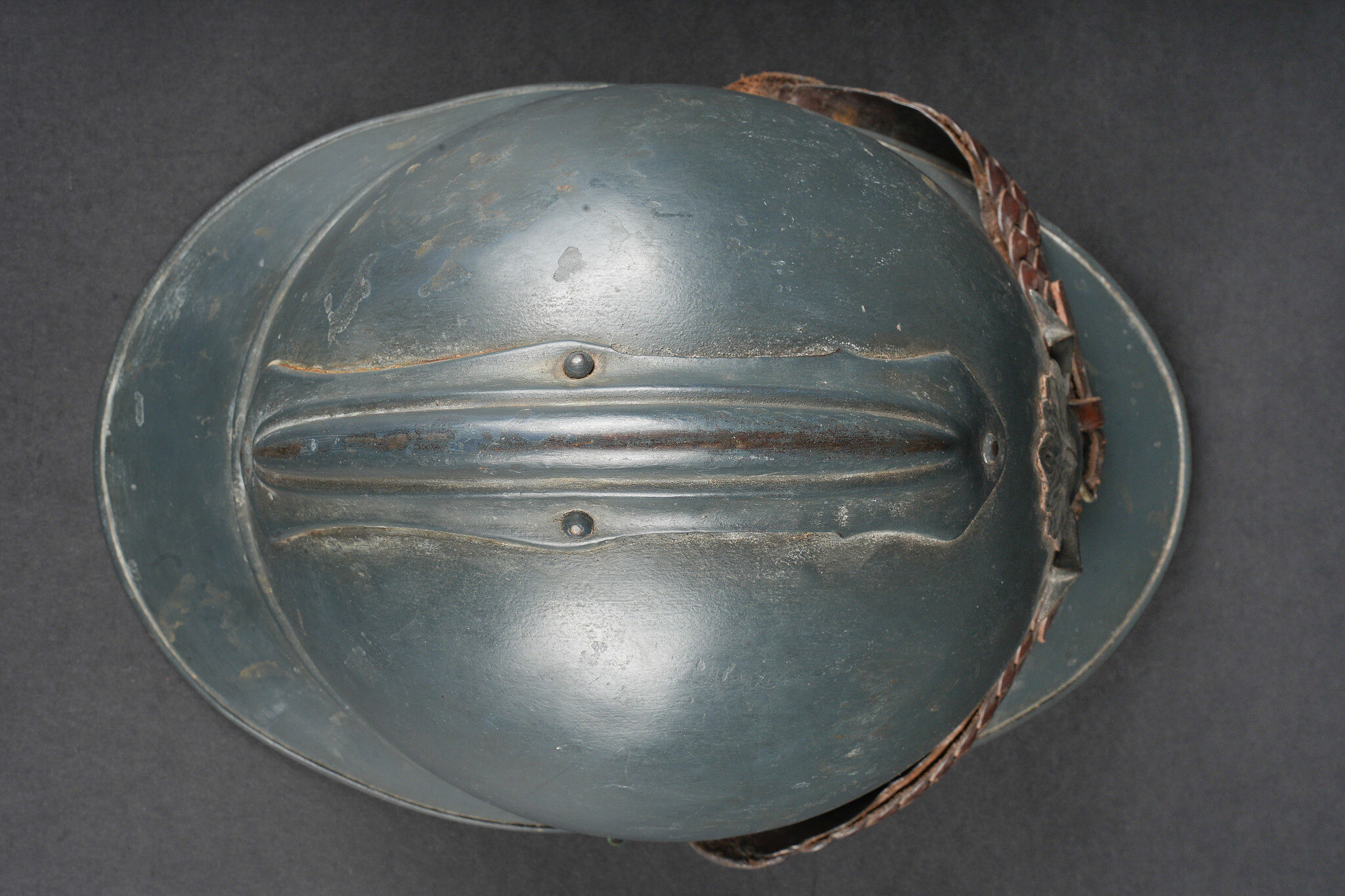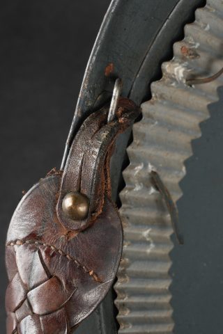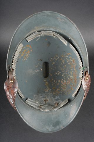 Casque Adrian général de brigade. Coque de casque Adrian modèle 1915, attribut frontal de l’infanterie entouré de deux étoiles argentées recouvertes par la même peinture que le reste du casque et étant retenues par deux vis. La coiffe est absente, quatre gaufrettes en aluminium toujours présentes. Jugulaire tressée en cuir de type officier, un accroc au niveau de l’attache côté gauche. Adrian helmet model 1915 Brigadier General. Shell with infantry badge surrounded by two silver stars repainted in the same colour as the helmet and fixed by two screws. Liner absent. Four aluminium spacers present. Officer type plaited leather chinstrap with damage at the left attachment.