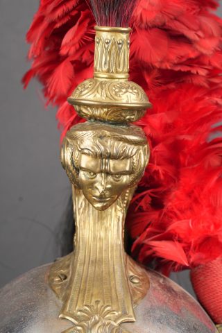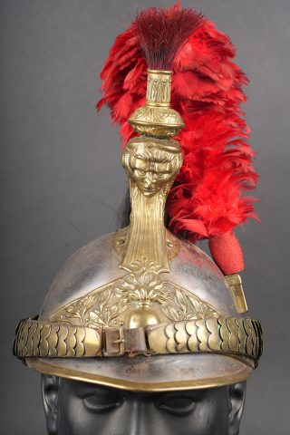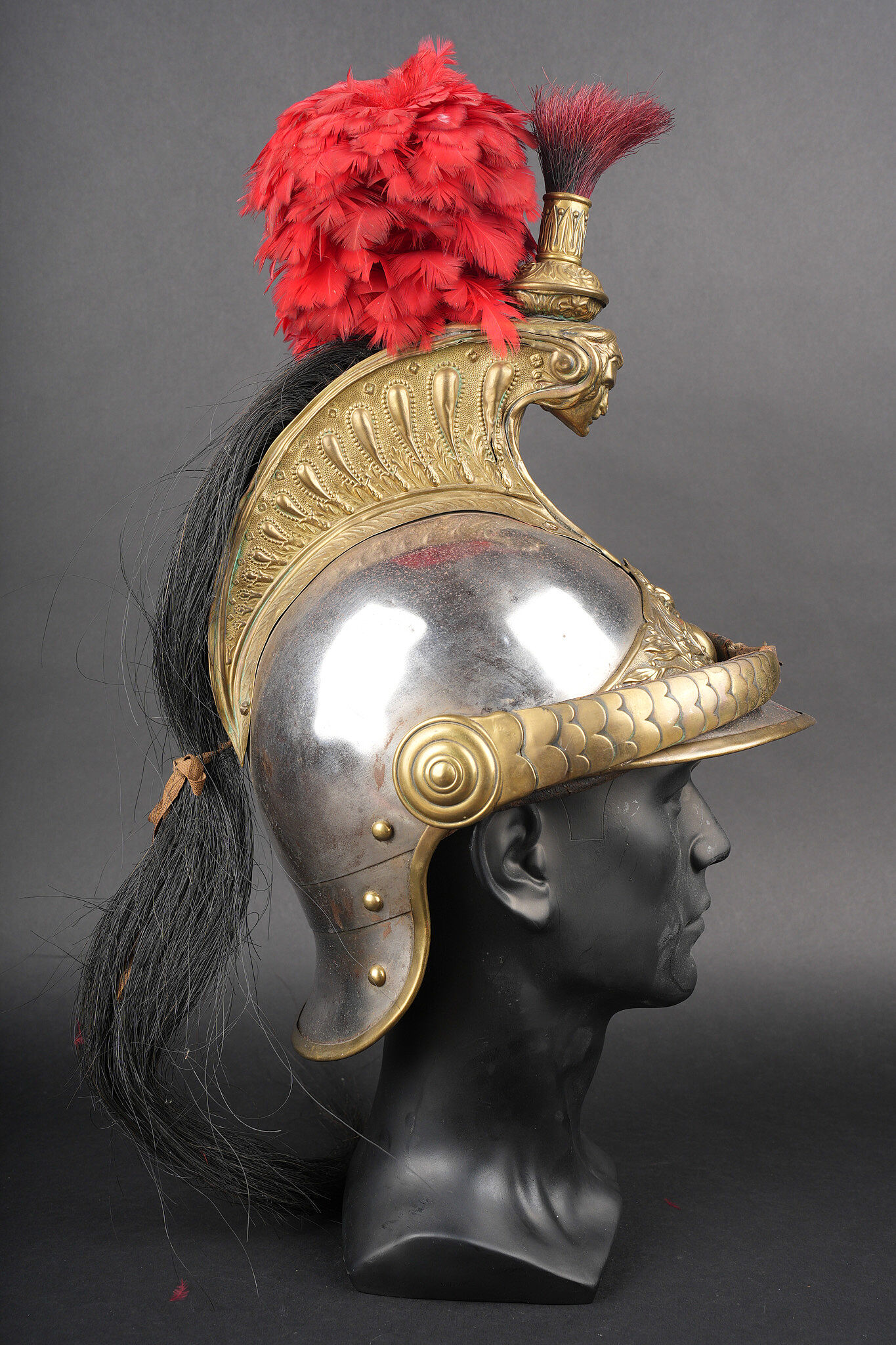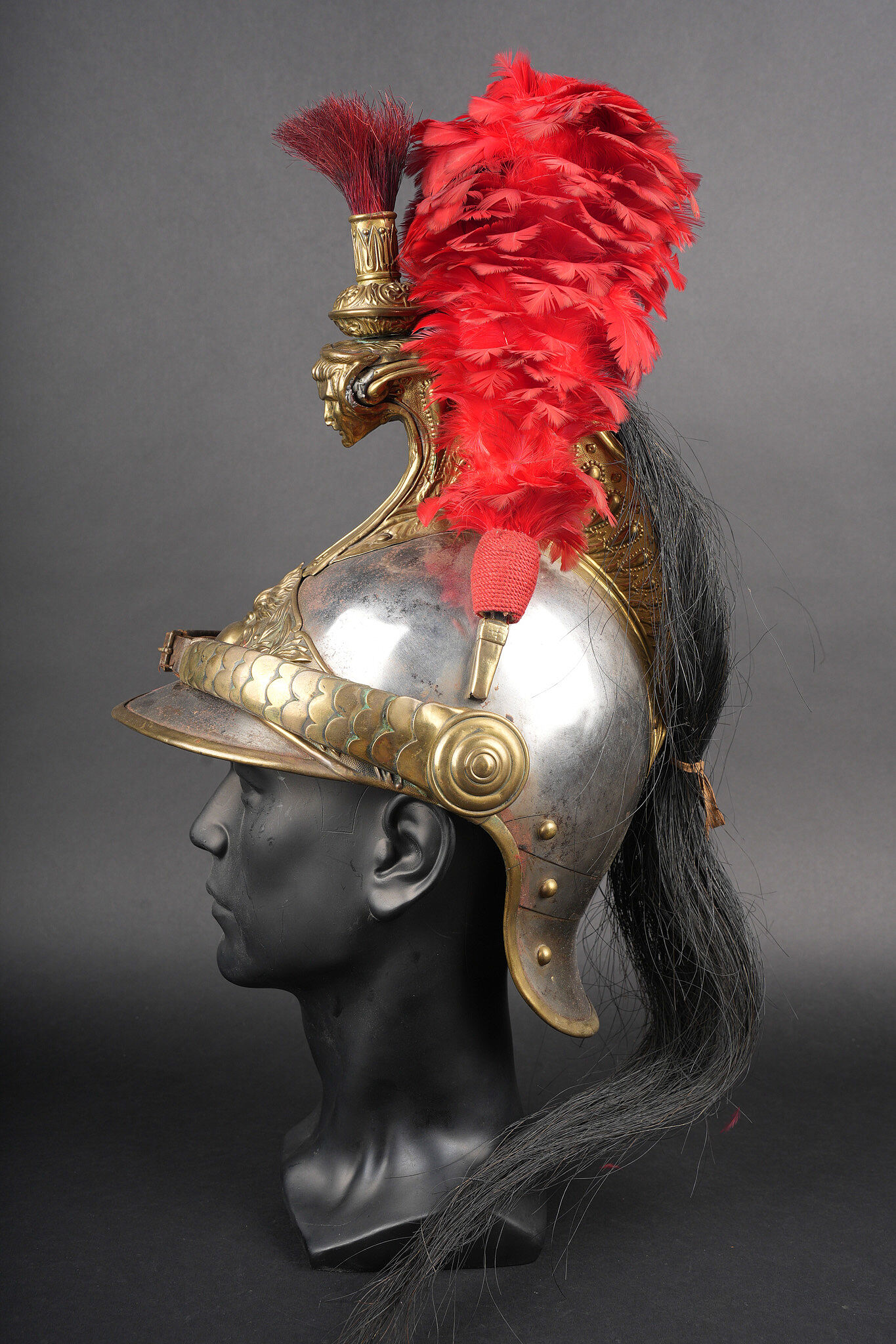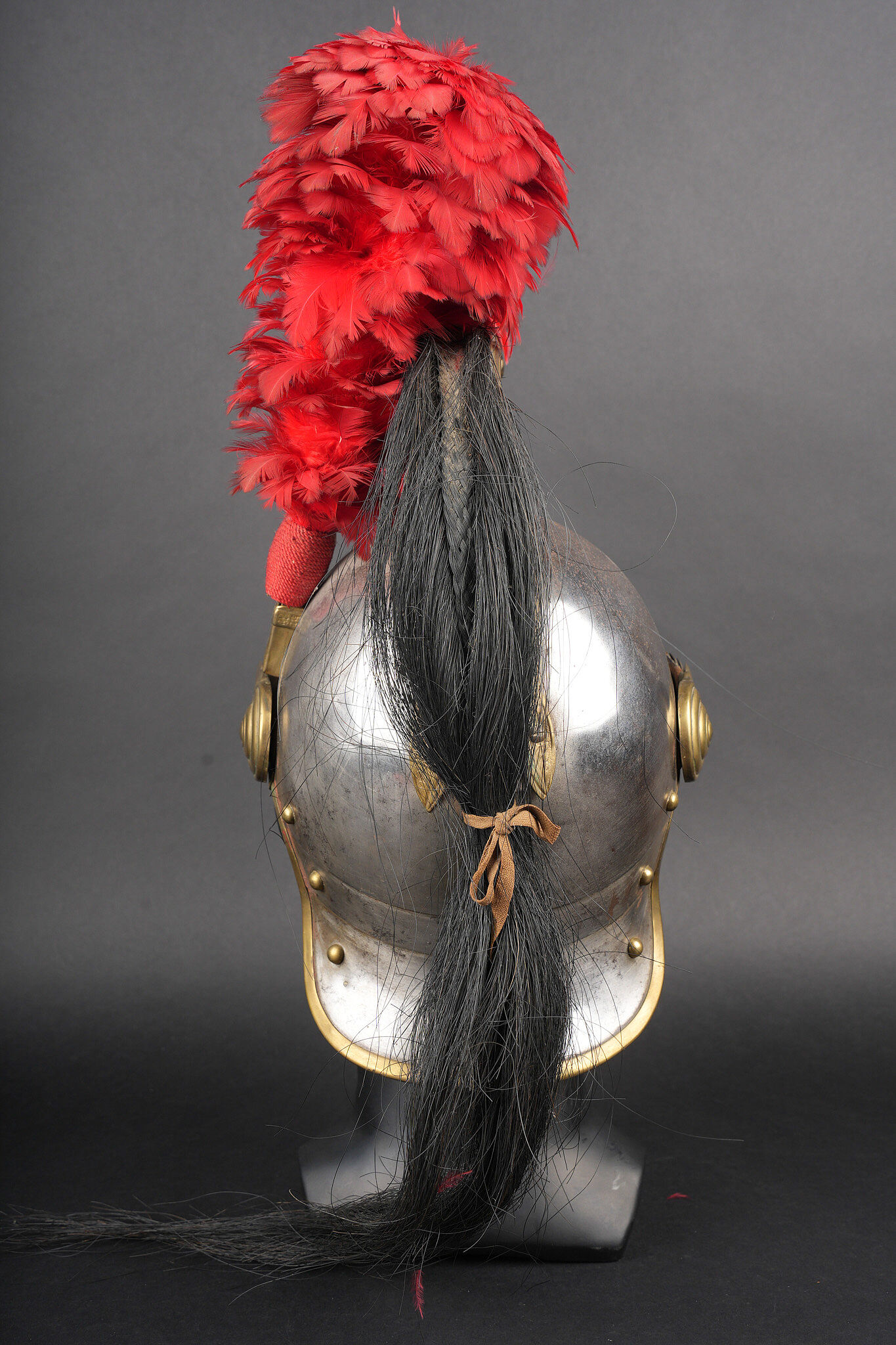 Casque de cuirassier troupe 1872/74. Casque en acier, bandeau en laiton estampé portant l’attribut de la grenade, cimier se terminant par une tête de méduse surmontée de son marmouset en crin rouge et supportant une crinière noire de 63cm. Nuquière queue de homard à deux rangées de trois rivets, marquage fabricant illisible, deux trous postérieurs réalisés au dessus des marquages. Absence de protection dans la nuquière, visière recouverte d’un fin cuir brin. Jugulaire à écailles montée sur cuir dont la patte de réglage a été probablement remplacée. Coiffe du modèle troupe à sept dents de loup, deux écrous postérieurs. Avec son plumet en plumes rouges. Trooper’s cuirassier helmet Model 1872/74. Steel skull with stamped brass band bearing the grenade device, crest terminating in a Medusa head surmounted by a red horsehair tuft and supporting a 63 cm black mane. Lobster-tail neck guard with two rows of three rivets. Maker’s mark illegible, two later holes above the stamp. Absence of the internal neck-guard lining. Peak covered in fine brown leather. Brass-scaled chinstrap on leather, the adjustment tongue probably replaced. Other ranks’ liner with seven wolf-tooth tongues, two rear nuts. With its red feather plume.