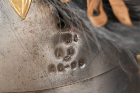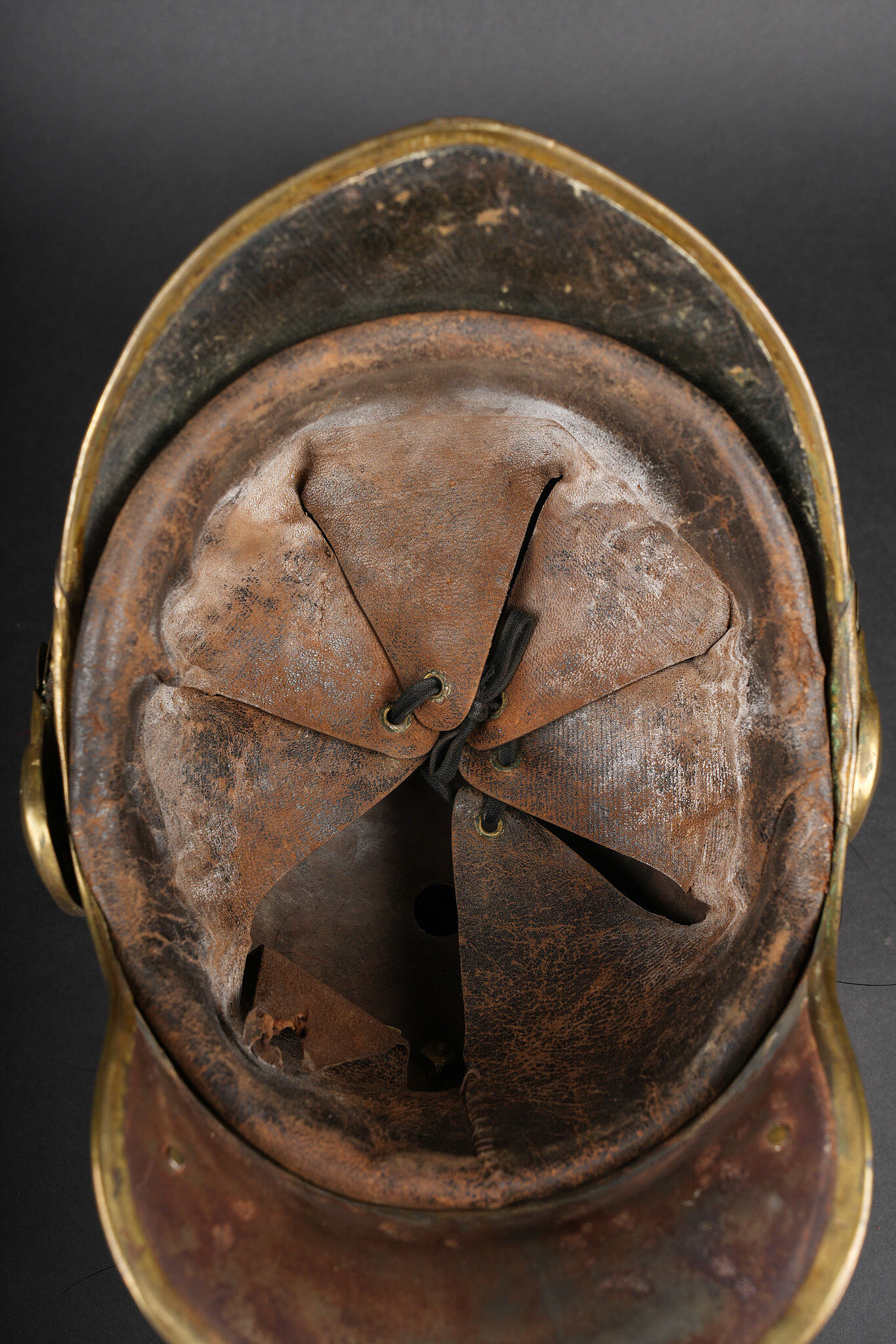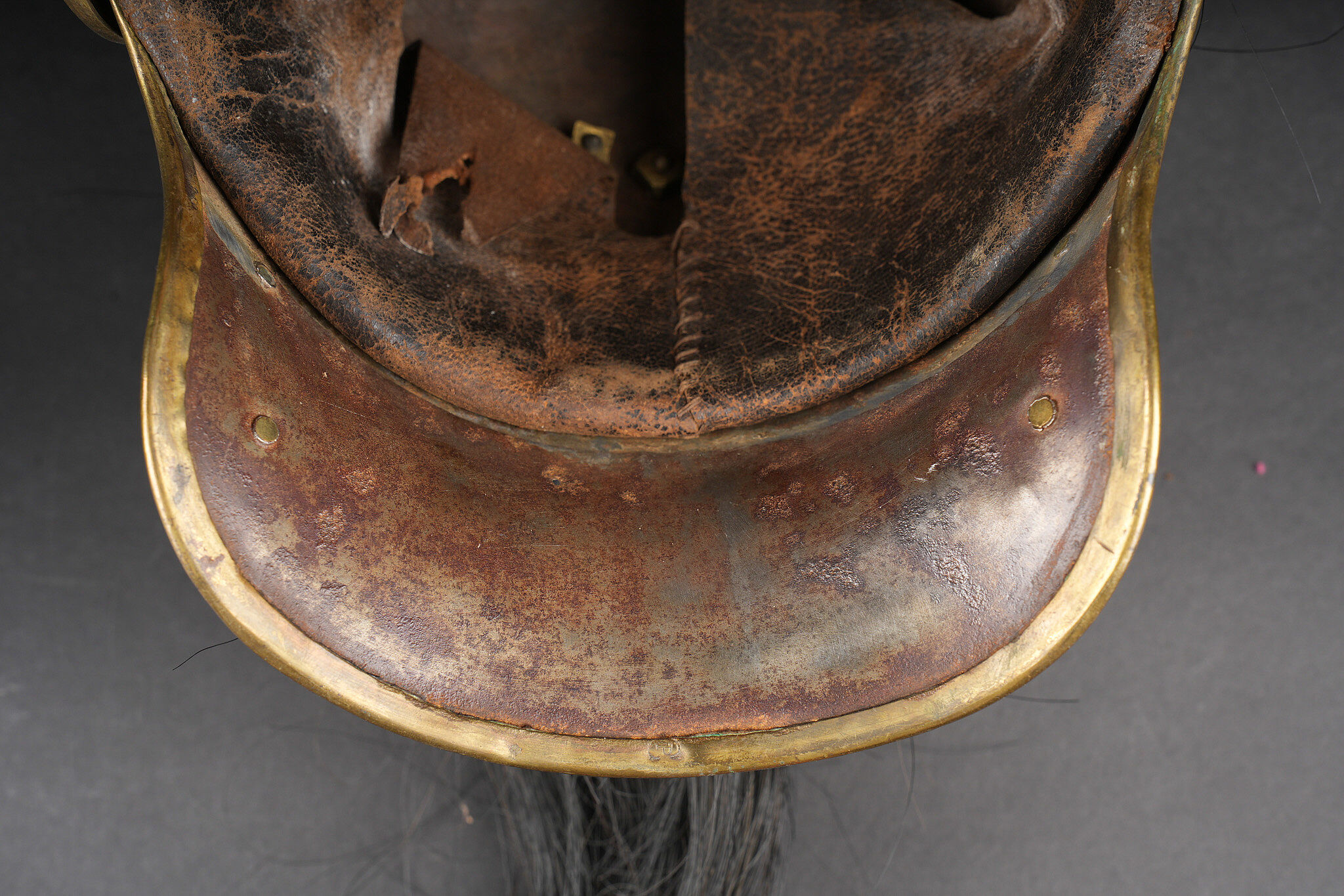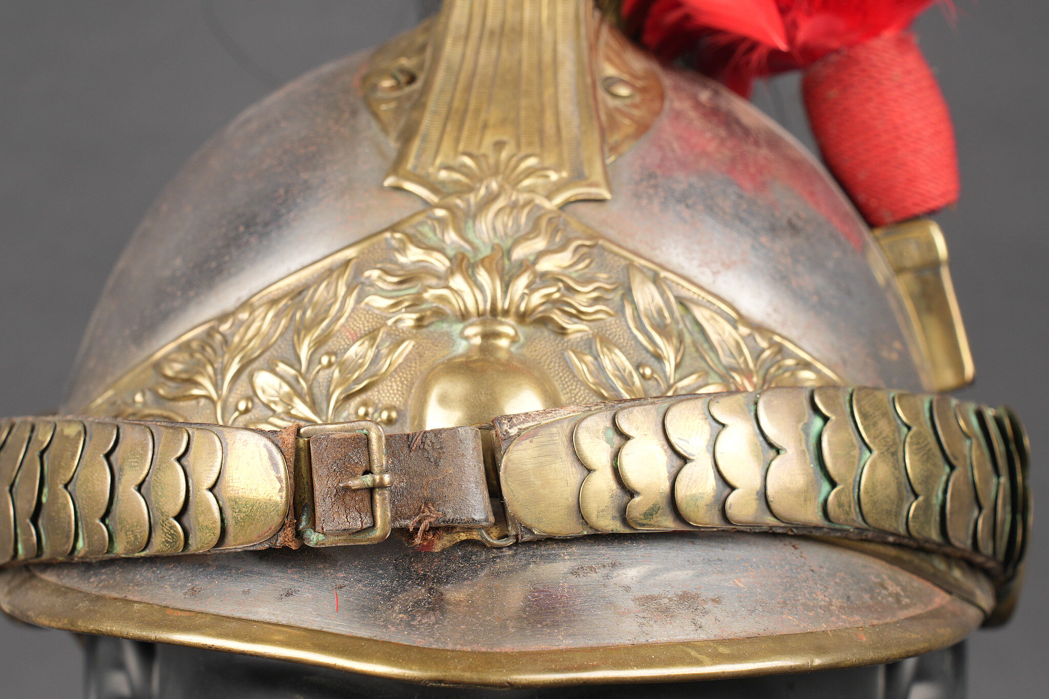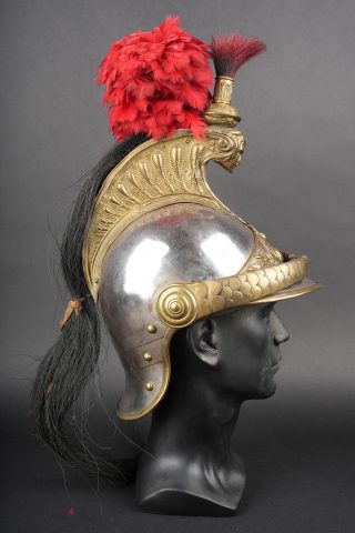 Casque de cuirassier troupe 1872/74. Casque en acier, bandeau en laiton estampé portant l’attribut de la grenade, cimier se terminant par une tête de méduse surmontée de son marmouset en crin rouge et supportant une crinière noire de 63cm. Nuquière queue de homard à deux rangées de trois rivets, marquage fabricant illisible, deux trous postérieurs réalisés au dessus des marquages. Absence de protection dans la nuquière, visière recouverte d’un fin cuir brin. Jugulaire à écailles montée sur cuir dont la patte de réglage a été probablement remplacée. Coiffe du modèle troupe à sept dents de loup, deux écrous postérieurs. Avec son plumet en plumes rouges. Trooper’s cuirassier helmet Model 1872/74. Steel skull with stamped brass band bearing the grenade device, crest terminating in a Medusa head surmounted by a red horsehair tuft and supporting a 63 cm black mane. Lobster-tail neck guard with two rows of three rivets. Maker’s mark illegible, two later holes above the stamp. Absence of the internal neck-guard lining. Peak covered in fine brown leather. Brass-scaled chinstrap on leather, the adjustment tongue probably replaced. Other ranks’ liner with seven wolf-tooth tongues, two rear nuts. With its red feather plume.
