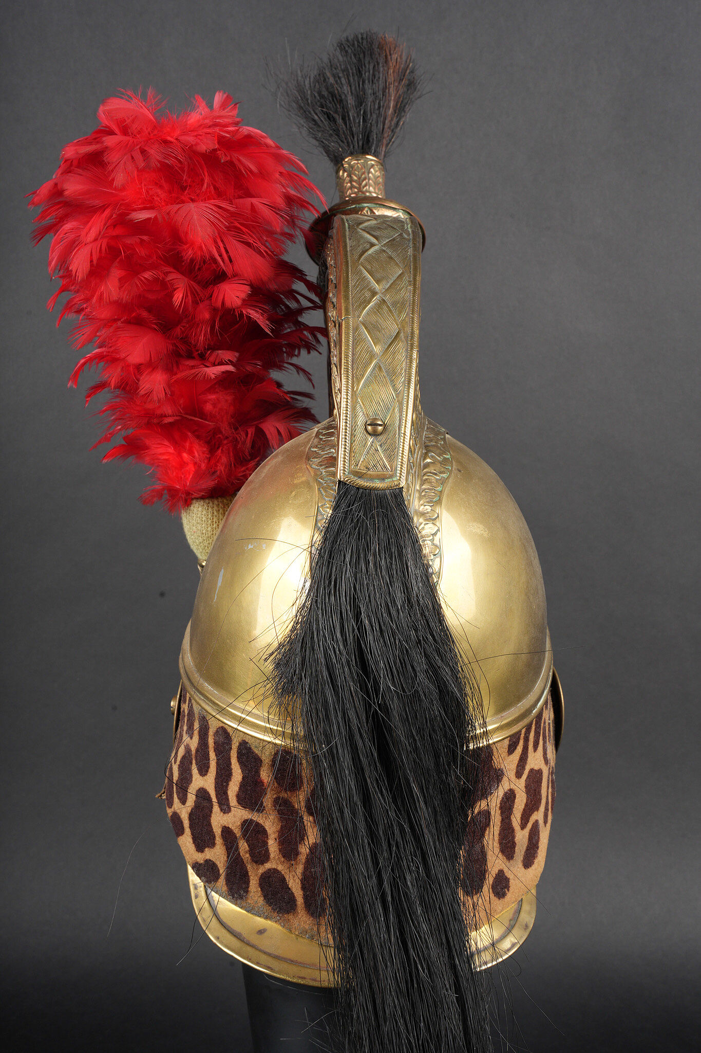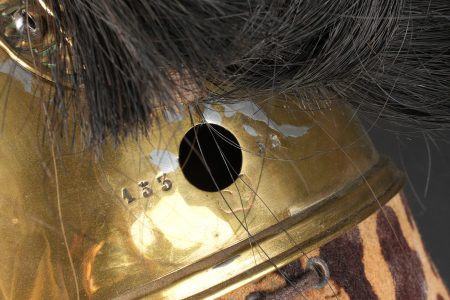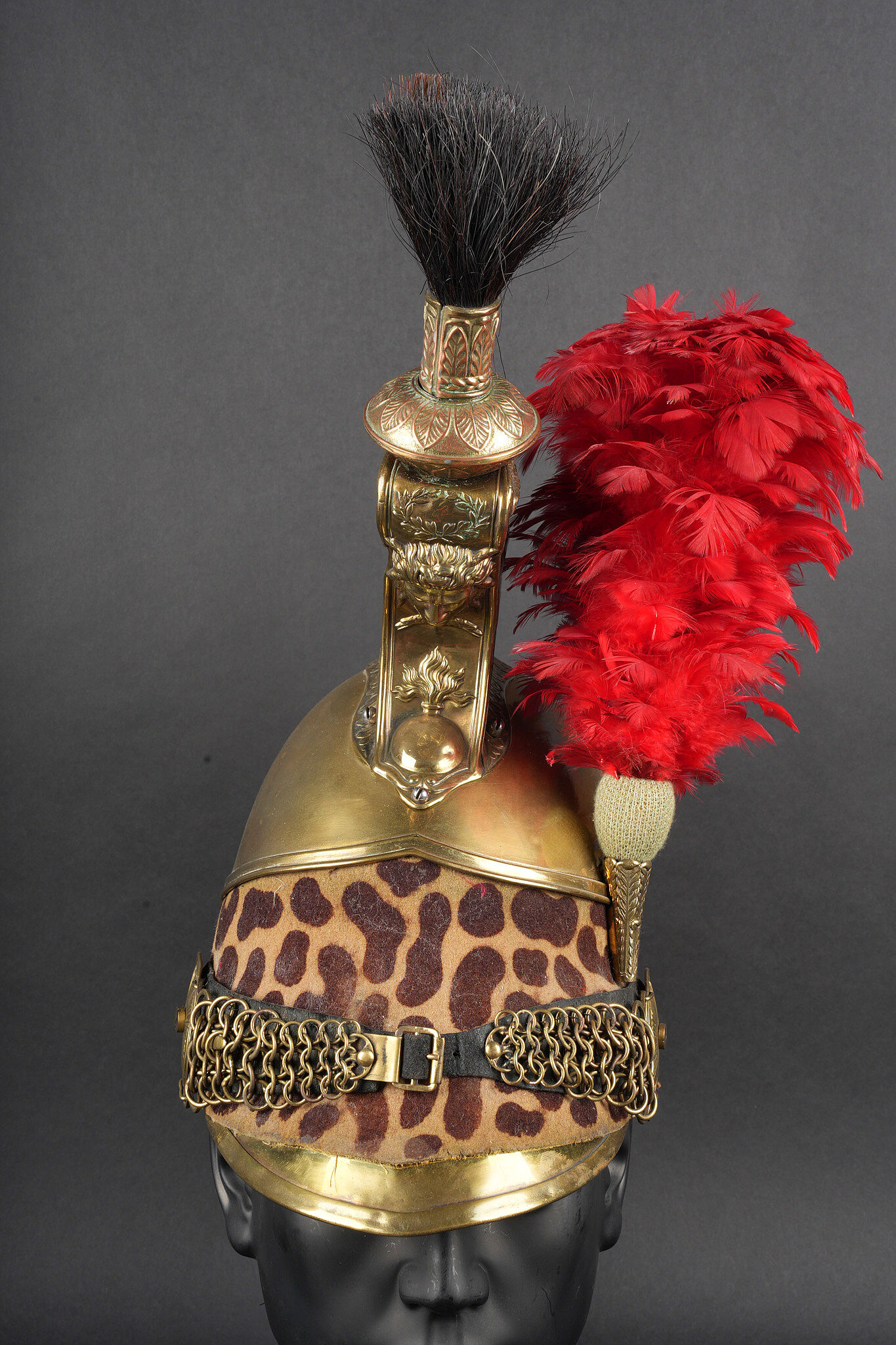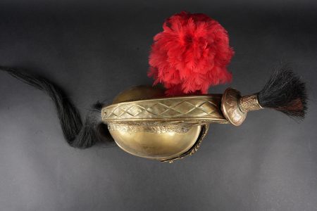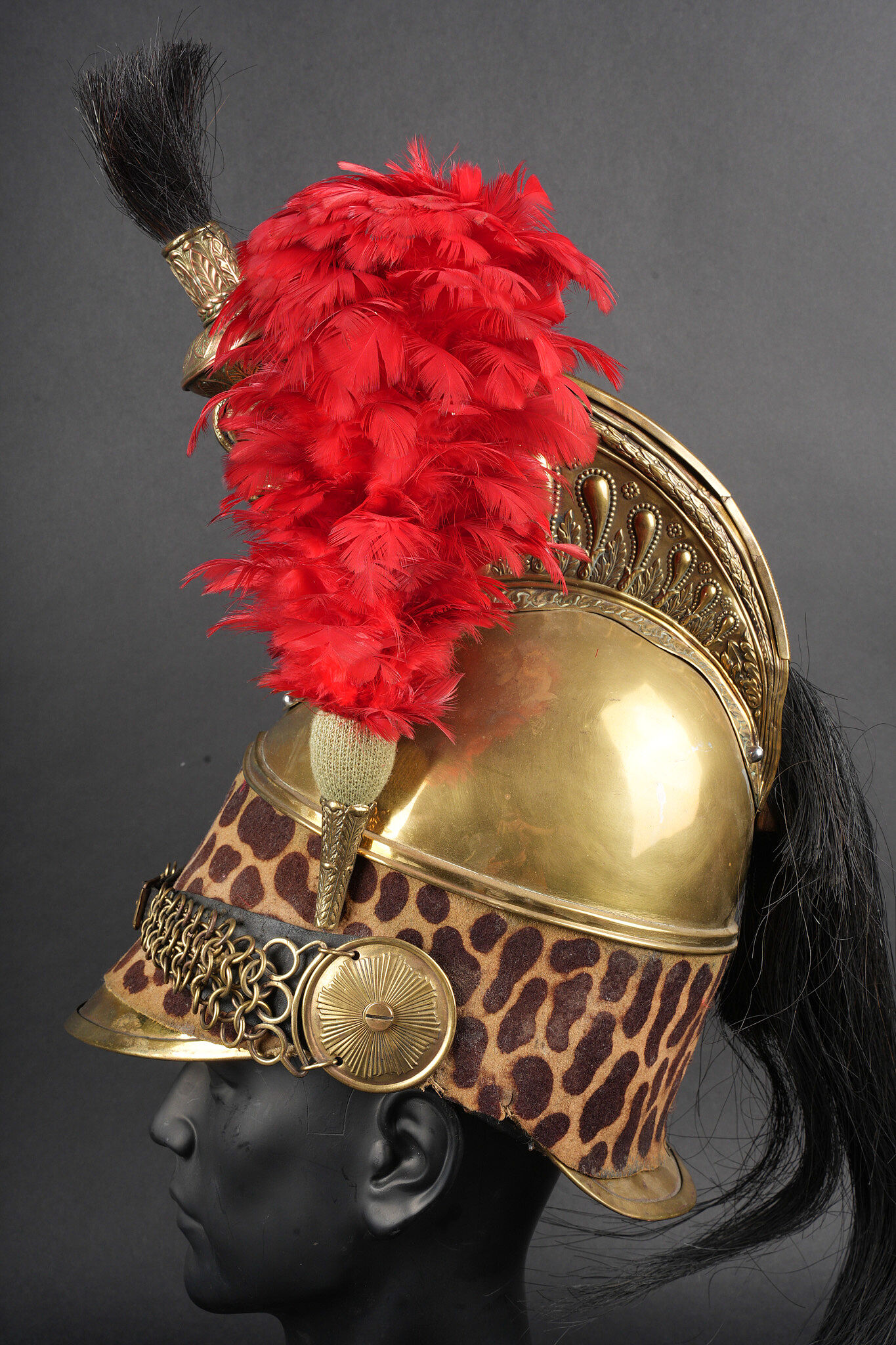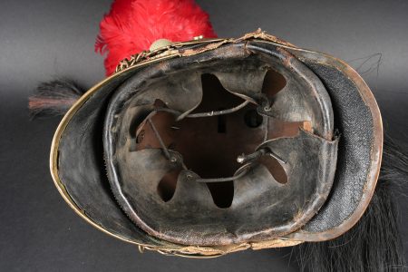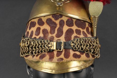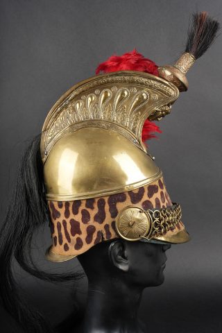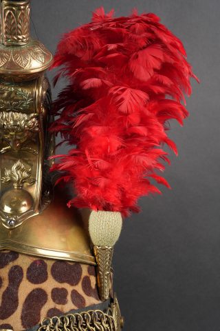 Casque de dragon 1858. Bombe entièrement en laiton, cimier en laiton portant la grenade sous la tête de méduse . Bandeau de feutre imitant une peau de léopard, lacet postérieur. Jugulaires à chainettes plates doublées de cuir et retenues par deux rosaces. Bombe portant à l’arrière le marquage 153 55. Coiffe en cuir du modèle troupe à huit dents de loup, lacet postérieur. Marmouset en crin noir postérieur, ressoudé et n’étant plus fixé au casque. Plumet rouge à olive verte. Dragoon helmet, model 1858. Skull entirely in brass with brass crest bearing the grenade beneath the Medusa head. Felt band imitating leopard skin with rear lacing. Flat chain chinstraps leather-backed and secured by two rosettes. Rear stamped 153 55. Troop-type leather liner with eight wolf-tooth tongues and rear drawstring. Later black horsehair tuft, resoldered and no longer fixed to the helmet. Red plume with green socket.