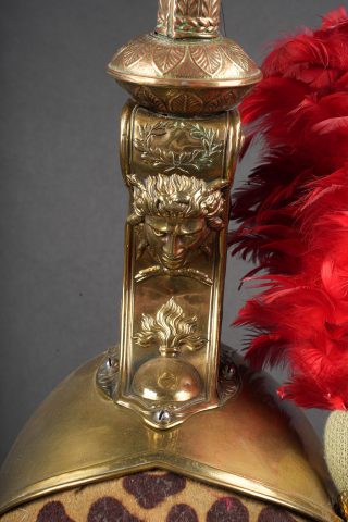 Casque de dragon 1858. Bombe entièrement en laiton, cimier en laiton portant la grenade sous la tête de méduse . Bandeau de feutre imitant une peau de léopard, lacet postérieur. Jugulaires à... en savoir plus