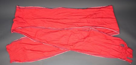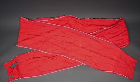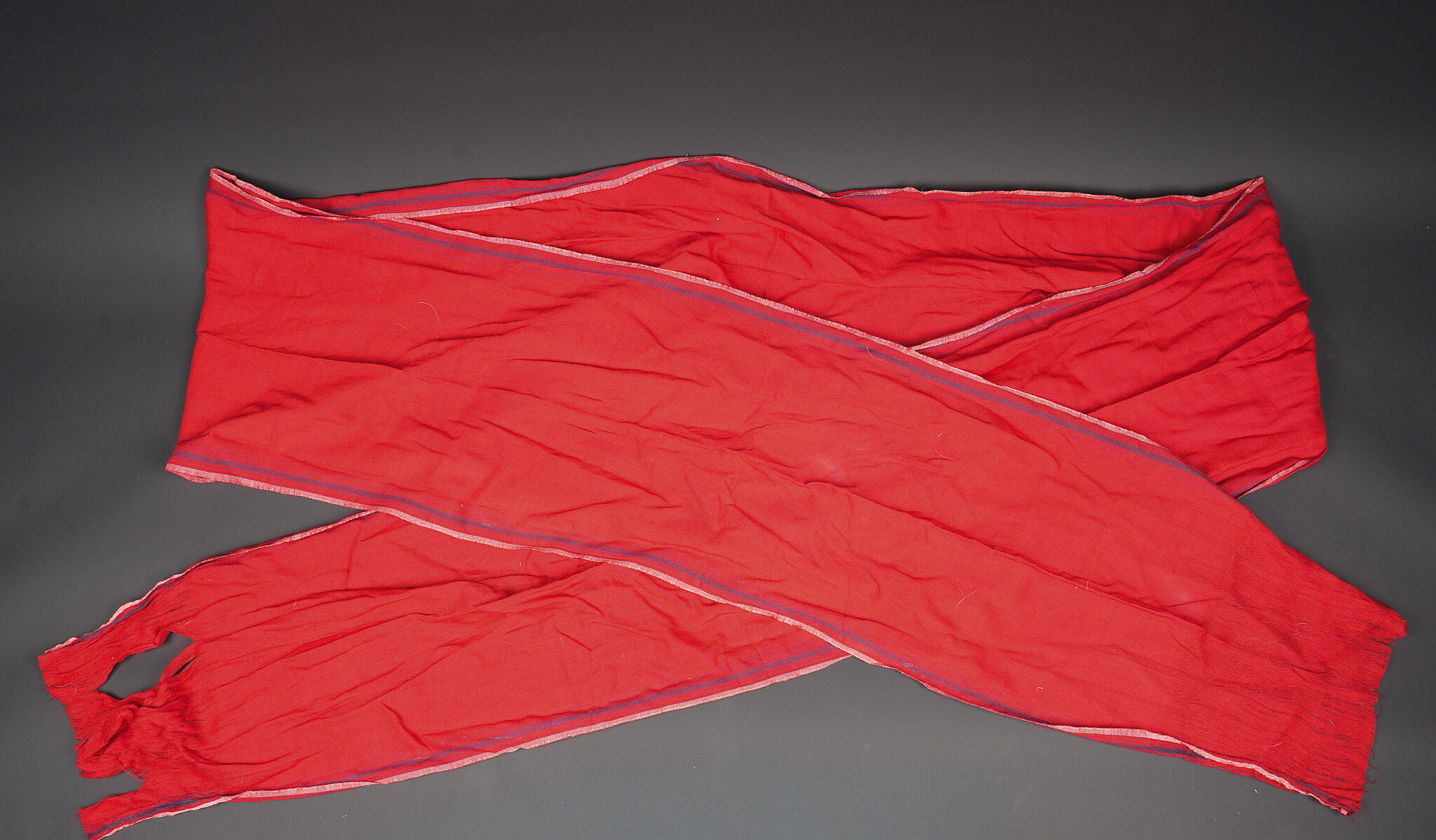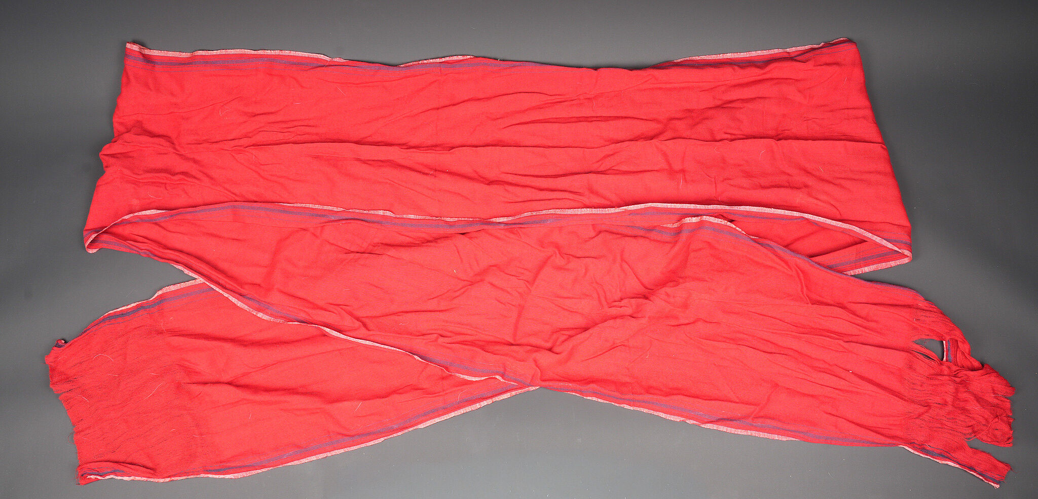 Ceinture troupes d’Afrique. Ceinture en laine garance pouvant être portée par les chasseurs d’Afrique ou les spahis. A noter deux trous à chaque extrémités. Largeur 40cm. Longueur 465cm. Army of Africa sash. Garance wool waist sash worn by Chasseurs d’Afrique or Spahis. Two holes at each end. Width 40 cm. Length 465 cm.