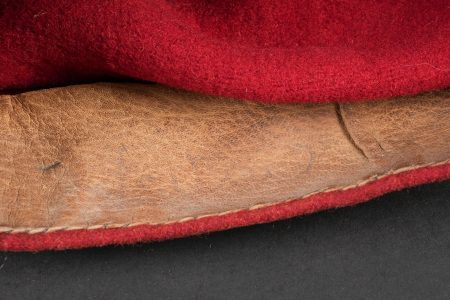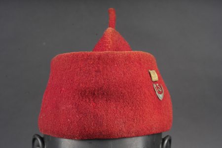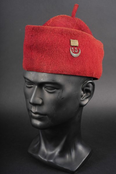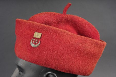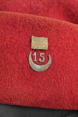 Chéchia 15ème RTA. En laine feutrée garance, chiffres 15 et croissant métallique rapportés surmontés d’un galon de grade. Le bandeau en cuir porte la mention manuscrite Tirailleur... en savoir plus