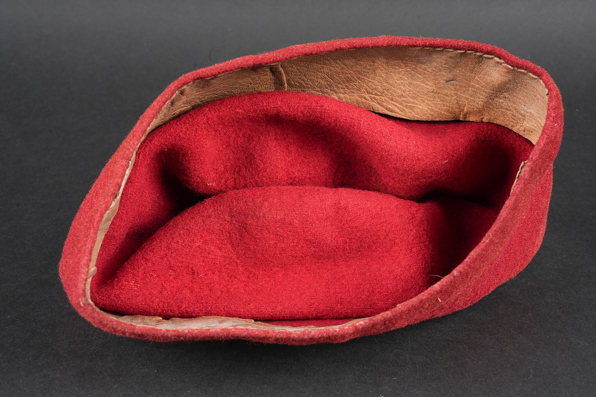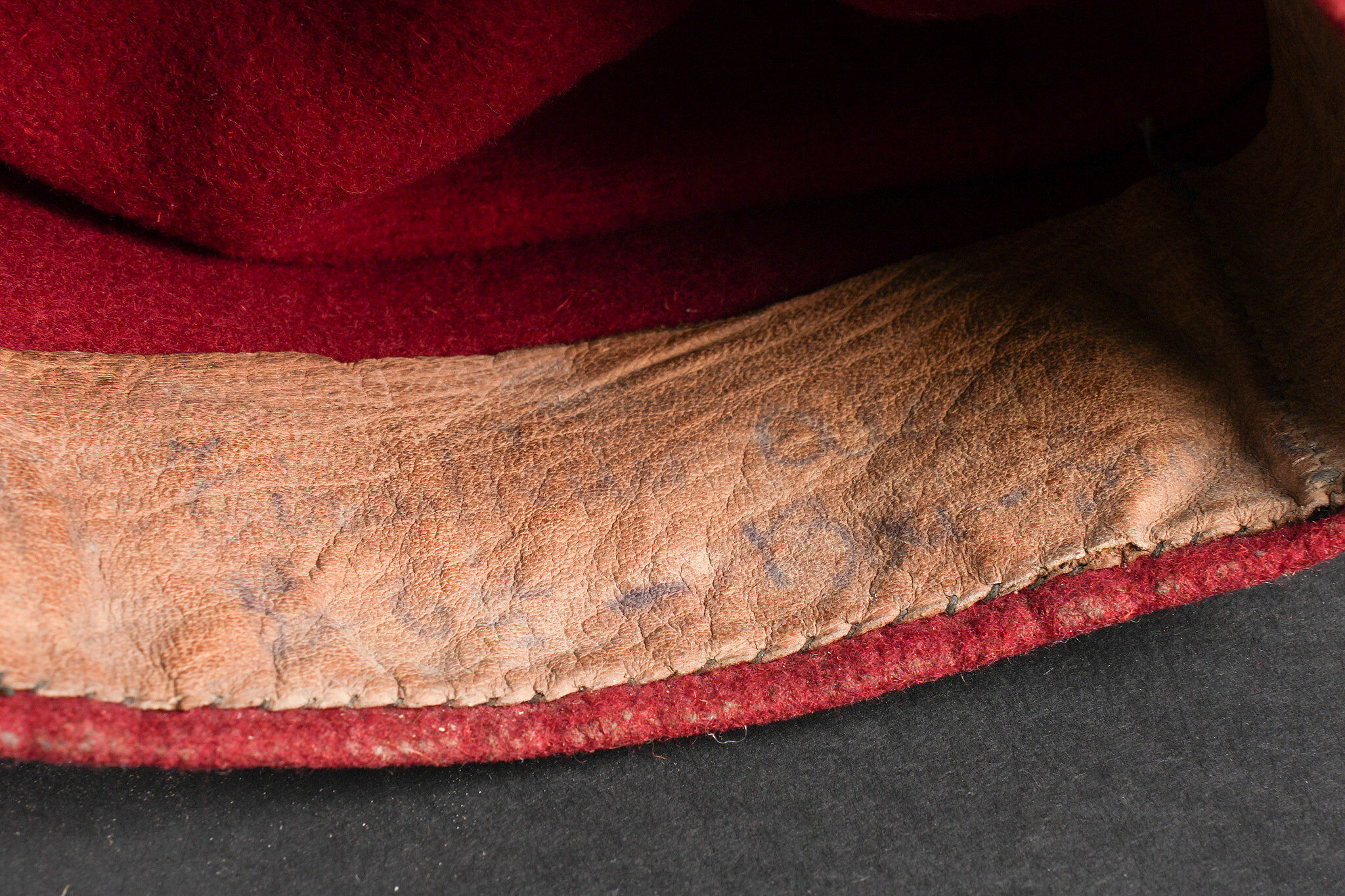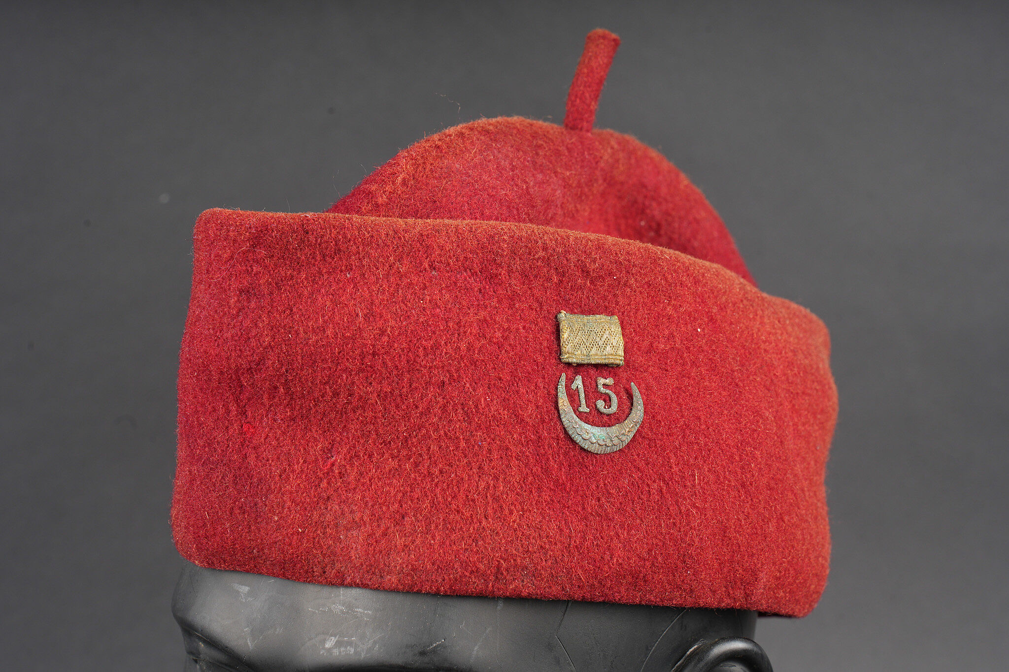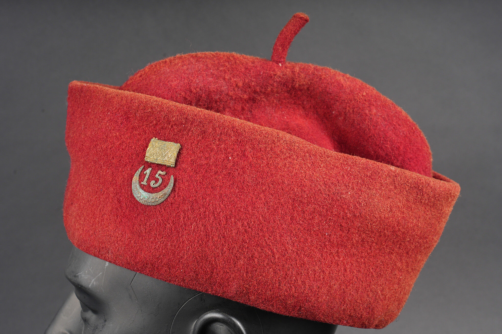 Chéchia 15ème RTA. En laine feutrée garance, chiffres 15 et croissant métallique rapportés surmontés d’un galon de grade. Le bandeau en cuir porte la mention manuscrite Tirailleur algérien 6ème compagnie Bou Sidi. Tampon de réception présent mais illisible. Hauteur totale 28cm. 15th RTA chechia. Garance felt with applied metal numerals 15 and crescent surmounted by an NCO rank braid. Leather sweatband bearing the handwritten inscription Tirailleur algérien 6ème compagnie Bou Sidi. Acceptance stamp present but illegible. Height 28 cm.