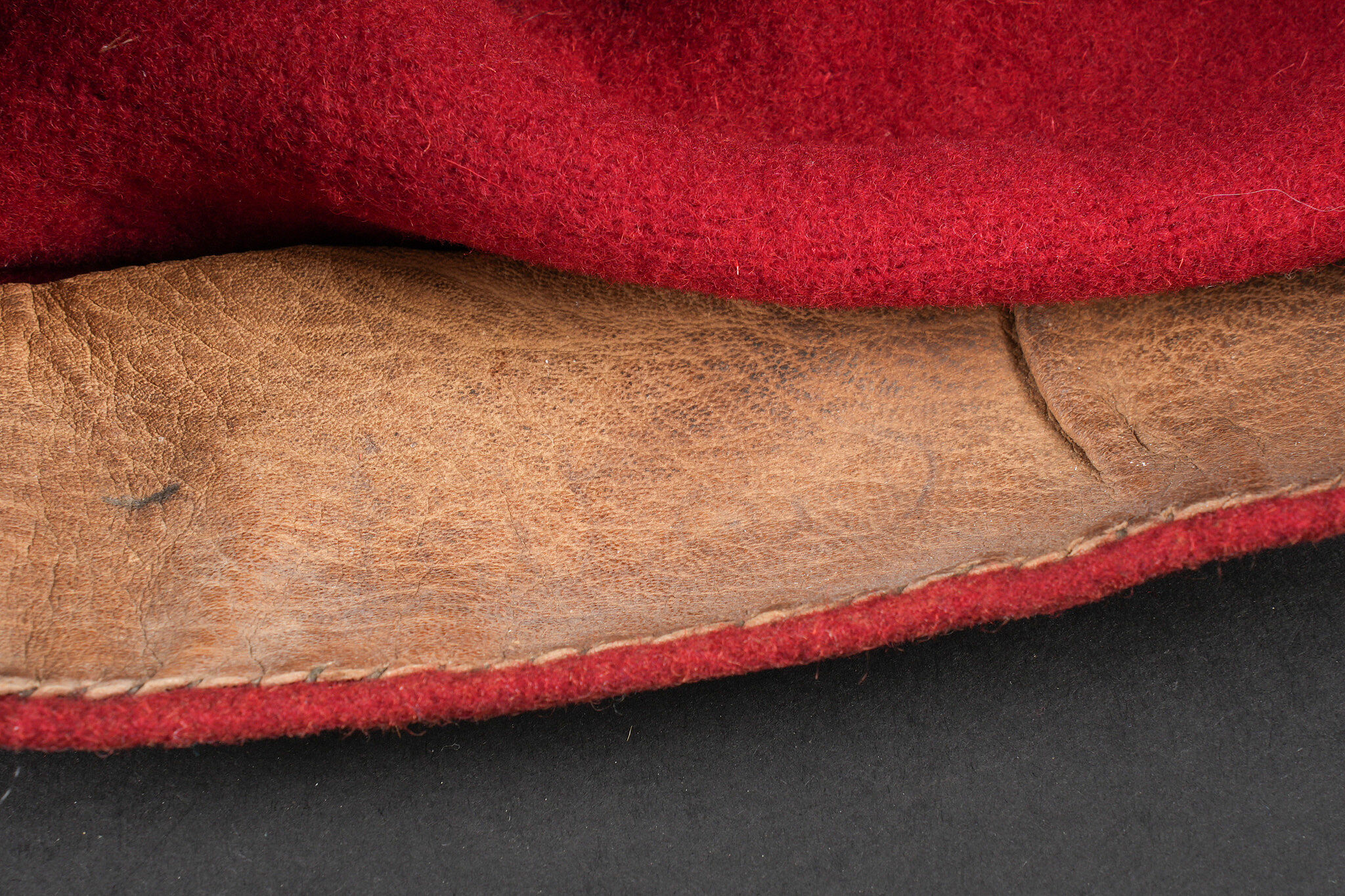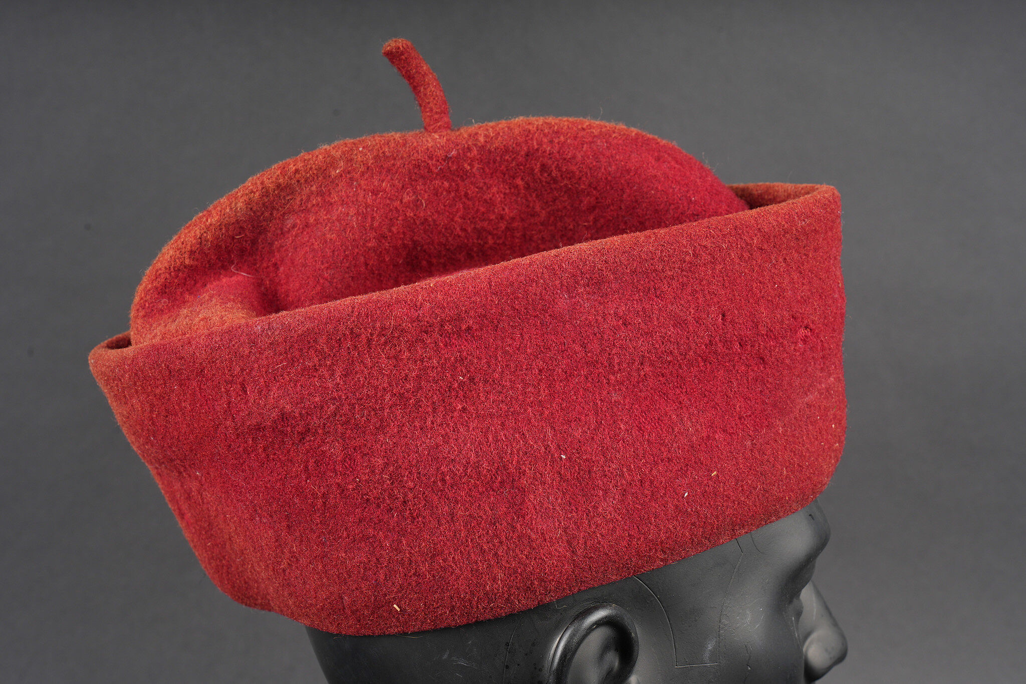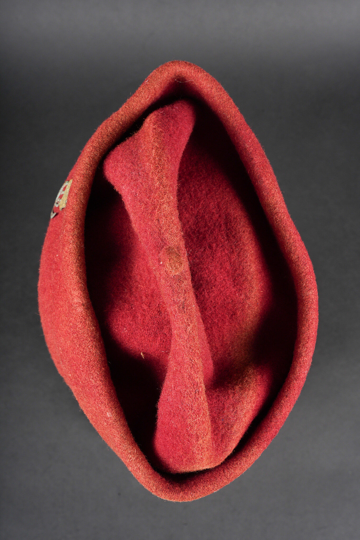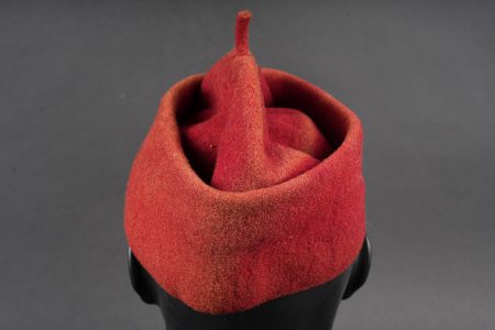 Chéchia 15ème RTA. En laine feutrée garance, chiffres 15 et croissant métallique rapportés surmontés d’un galon de grade. Le bandeau en cuir porte la mention manuscrite Tirailleur algérien 6ème compagnie Bou Sidi. Tampon de réception présent mais illisible. Hauteur totale 28cm. 15th RTA chechia. Garance felt with applied metal numerals 15 and crescent surmounted by an NCO rank braid. Leather sweatband bearing the handwritten inscription Tirailleur algérien 6ème compagnie Bou Sidi. Acceptance stamp present but illegible. Height 28 cm.