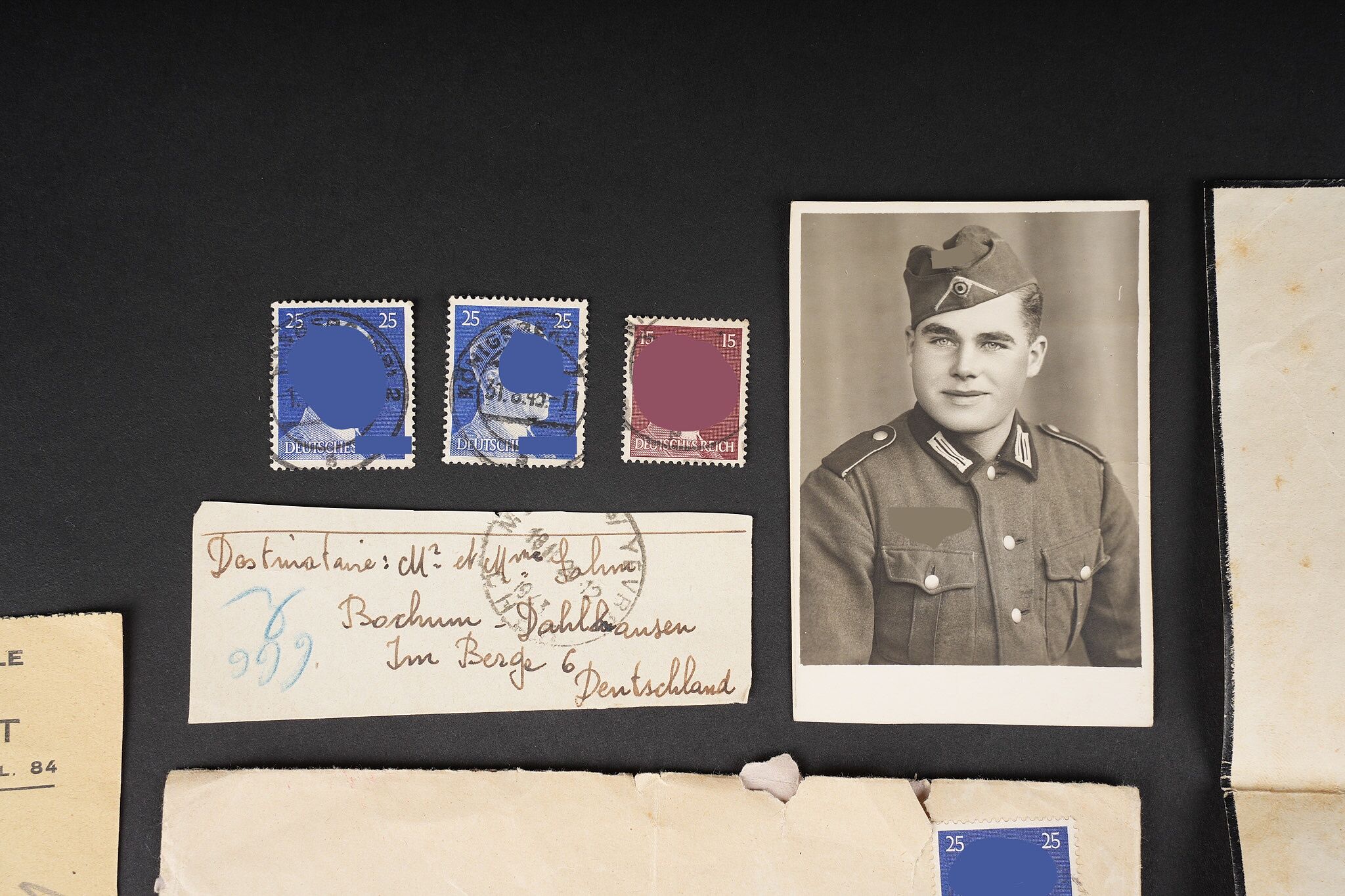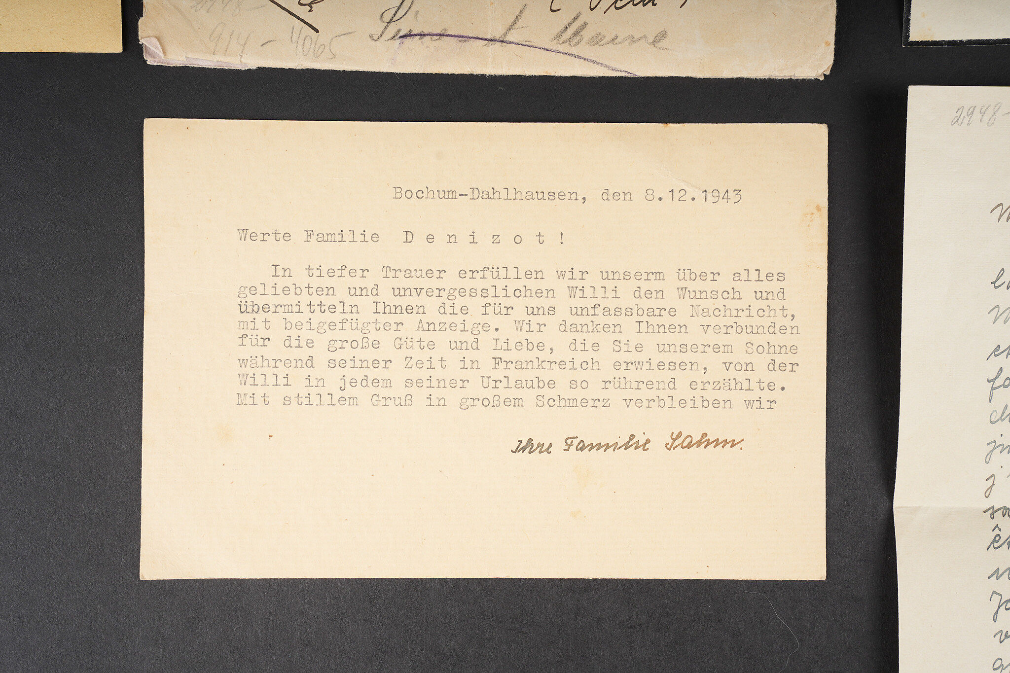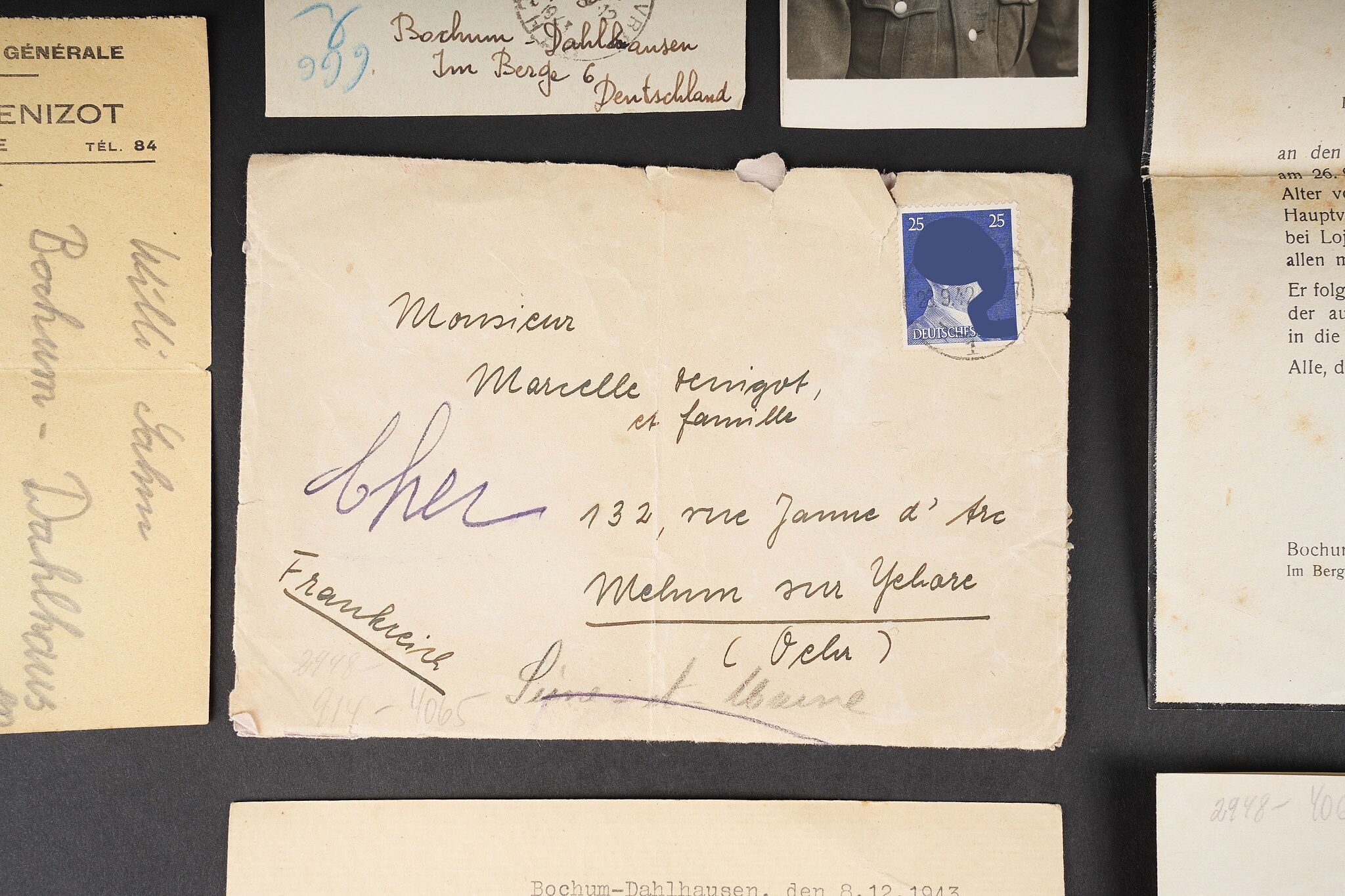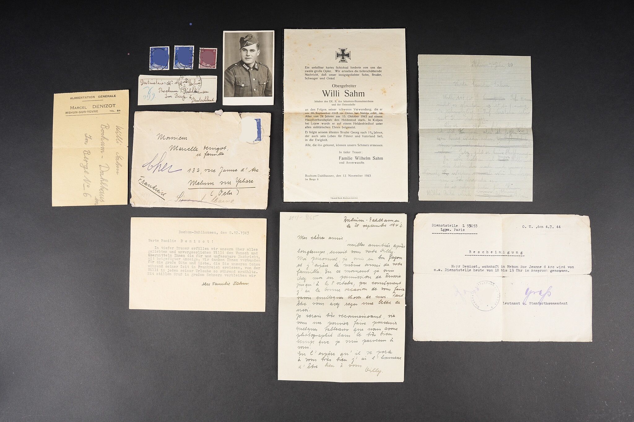 Correspondance entre un Soldat Allemand et une Française. Bel ensemble de document comprenant une lettre envoyée en septembre 1942 par le soldat Allemand Willi Sahm , rédigée en Français et adressée à Marcelle M. Domiciliée à Mehun sur Yèvre dans le Cher. Une seconde lettre rédigée en allemand depuis Mehun sur Yèvre par madame D. Une photo de Willi Sahm en uniforme de la Wehrmacht. L’avis de décès de l’obergefreiter Willi Sahm en octobre 1943 sur le Front de l’est. Une lettre tapuscrit envoyée par la famille Sahm en 1943 à la famille D. Un certificat de réquisition à propos d’un bureau de la Famille D. par la Wehrmacht. Une pub du magasin d’Alimentation Générale de la famille D. Portant le nom de Willi Sahm . L’ensemble des documents se trouve dans une enveloppe envoyée par le soldat Allemand Sahm à Marcelle M. Quelques pliures et déchirures. Correspondence between a German soldier and a French woman. Fine document group including a letter sent in September 1942 by the German soldier Willi Sahm written in French and addressed to Marcelle M. living in Mehun-sur-Yèvre in the Cher. A second letter in German from Mehun-sur-Yèvre by Mrs D. A photograph of Willi Sahm in Wehrmacht uniform. Death notice of Obergefreiter Willi Sahm in October 1943 on the Eastern Front. A typed letter sent in 1943 by the Sahm family to the D. family. A Wehrmacht requisition certificate concerning a desk belonging to the D. family. An advertising leaflet from the D. family grocery bearing the name of Willi Sahm. The whole kept in the envelope sent by Sahm to Marcelle M. Some folds and tears.